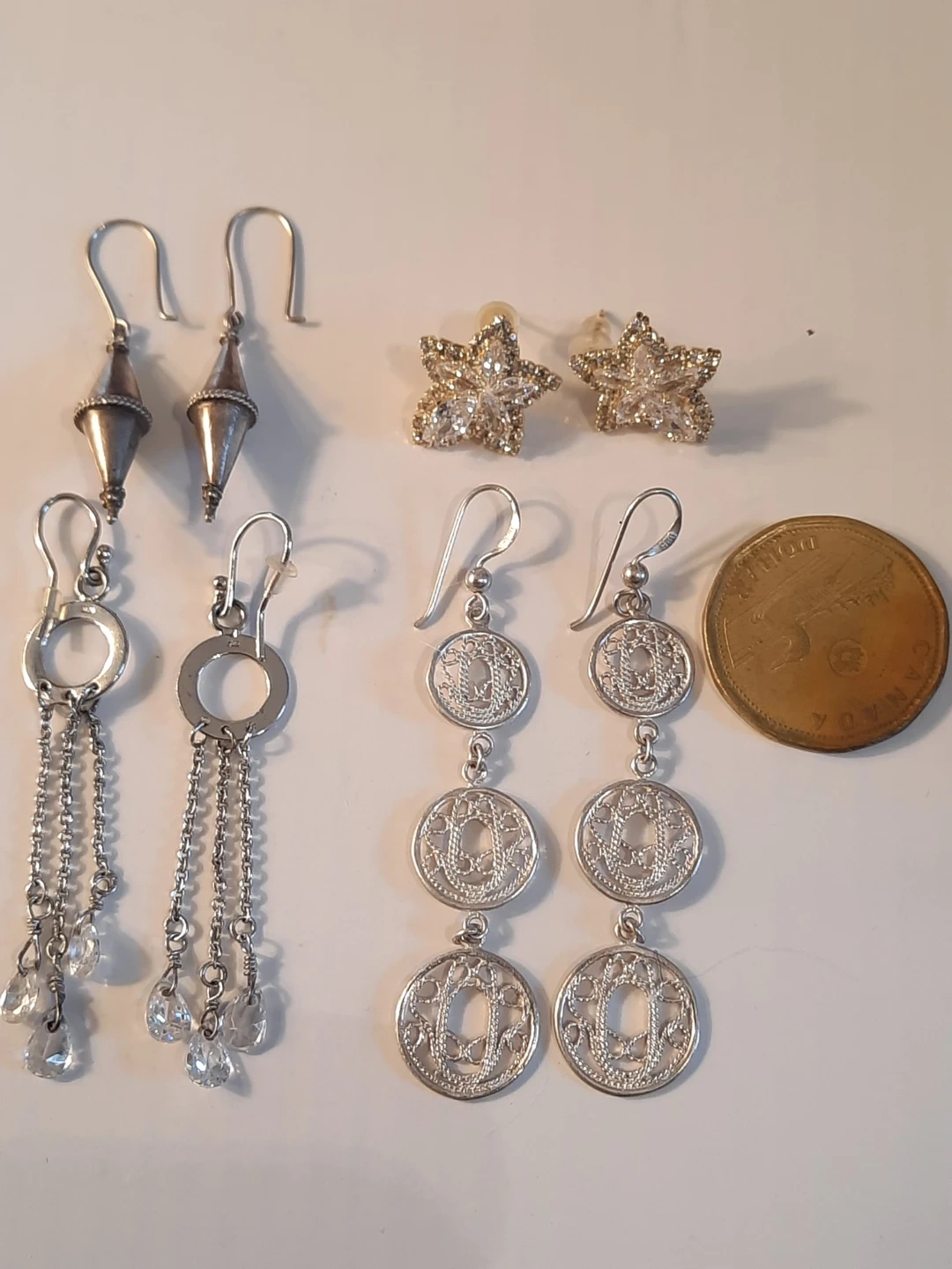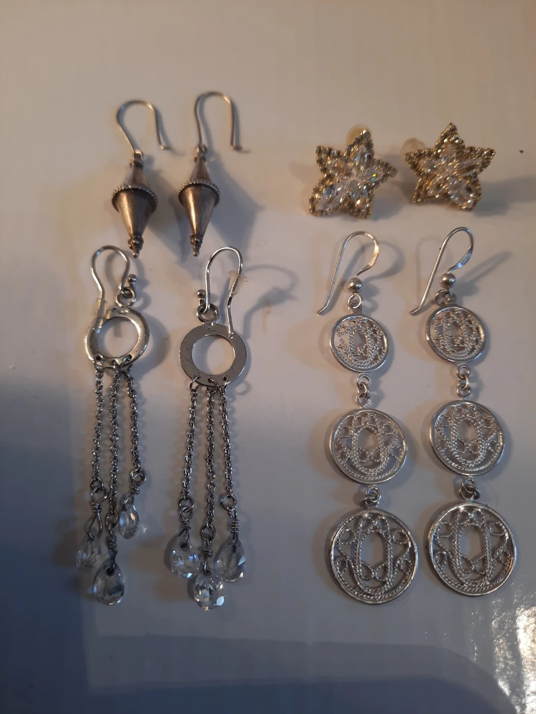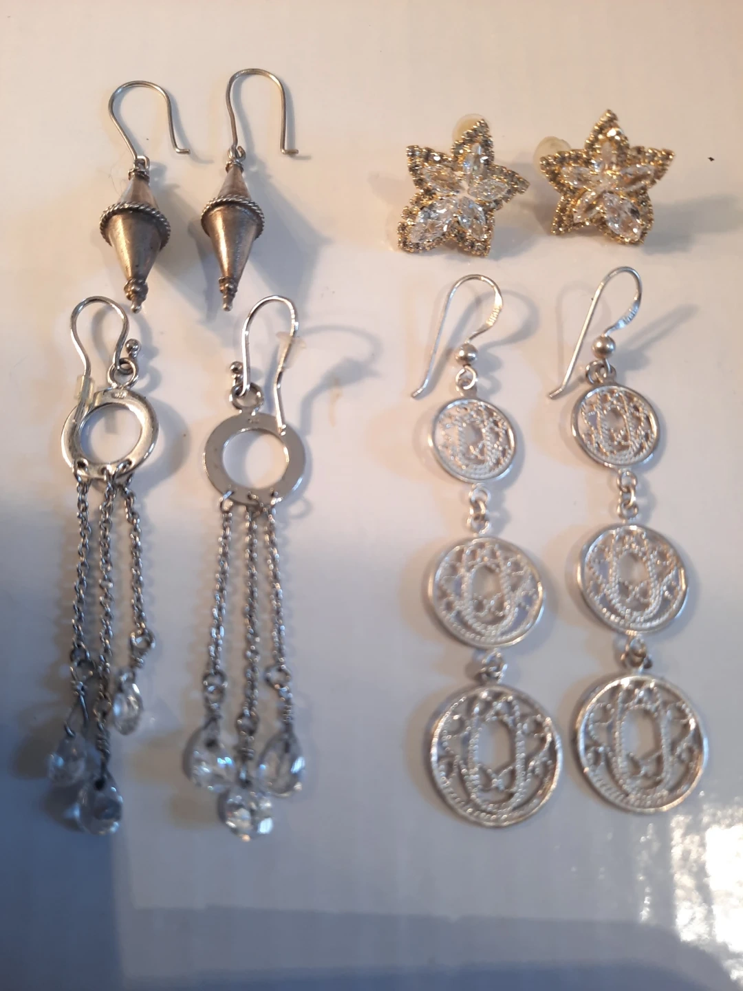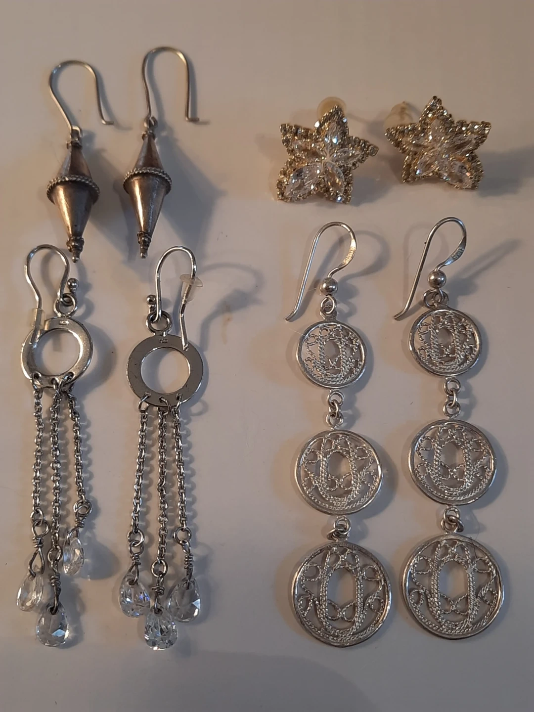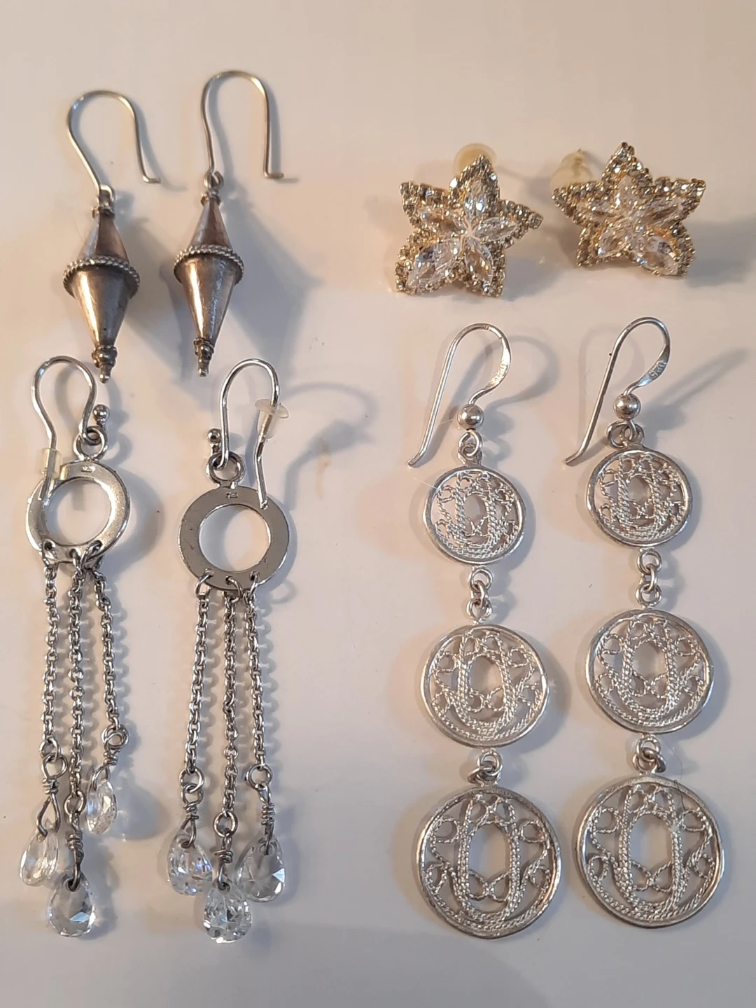 Selling a set of four pairs of earrings. They are all silver 925 and have different designs. Perfect for adding some variety to your jewelry collection!3 stamped one very old antic.one is with cristals and gold top