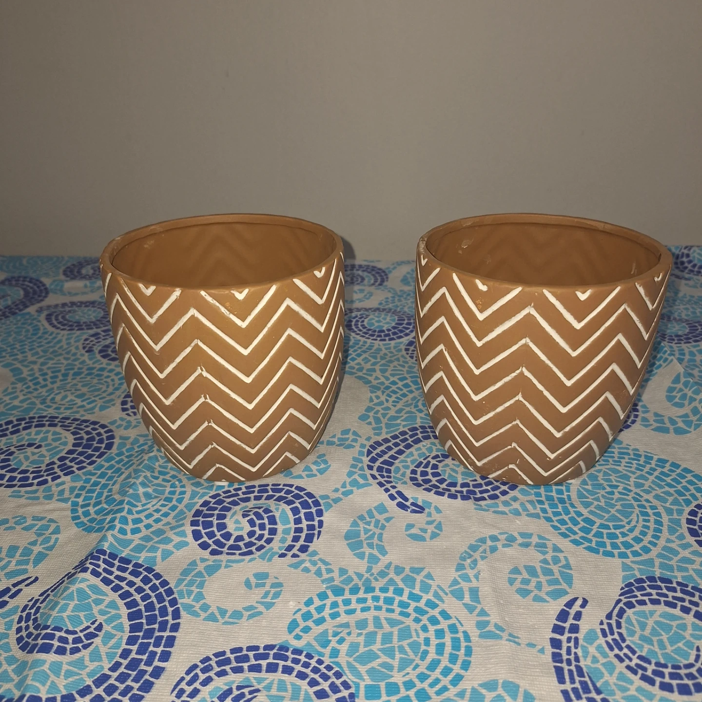 Selling a set of two matching brown ceramic planters. They have a unique white zigzag pattern that adds a nice touch to any room or garden. Perfect for small plants or succulents!