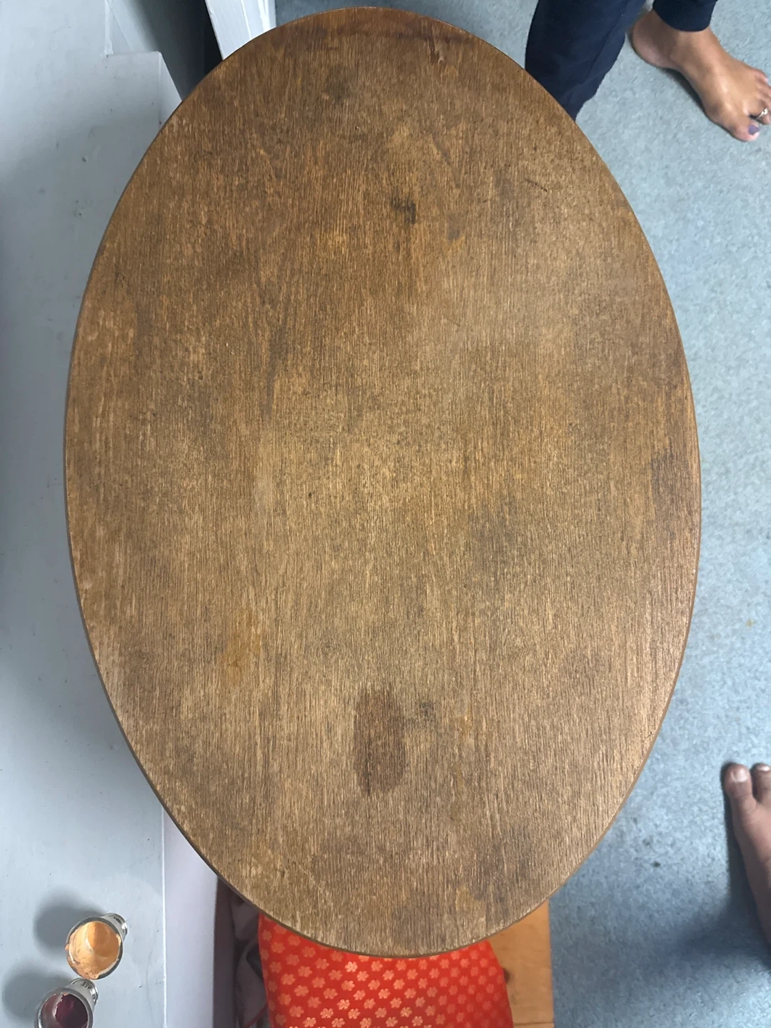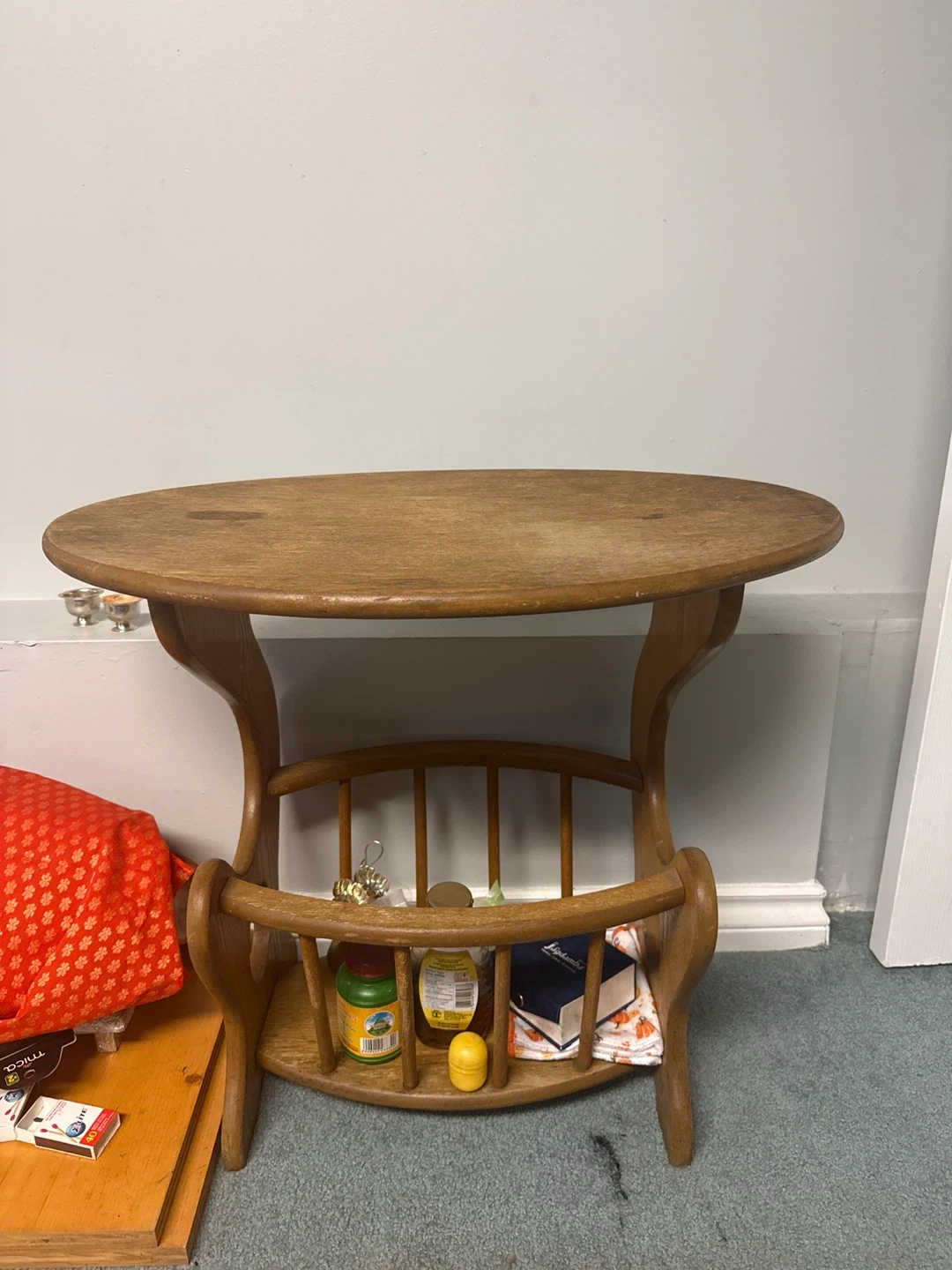 A charming vintage wooden side table with a built-in magazine rack. It's perfect for adding a touch of retro style to your living room or bedroom. The table has a lovely oval top and a sturdy base. There are some signs of wear, which adds to its character