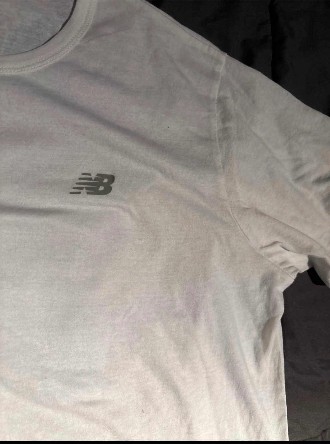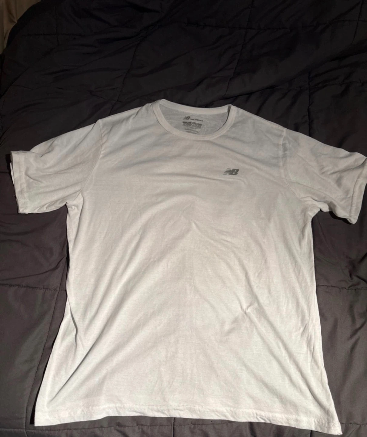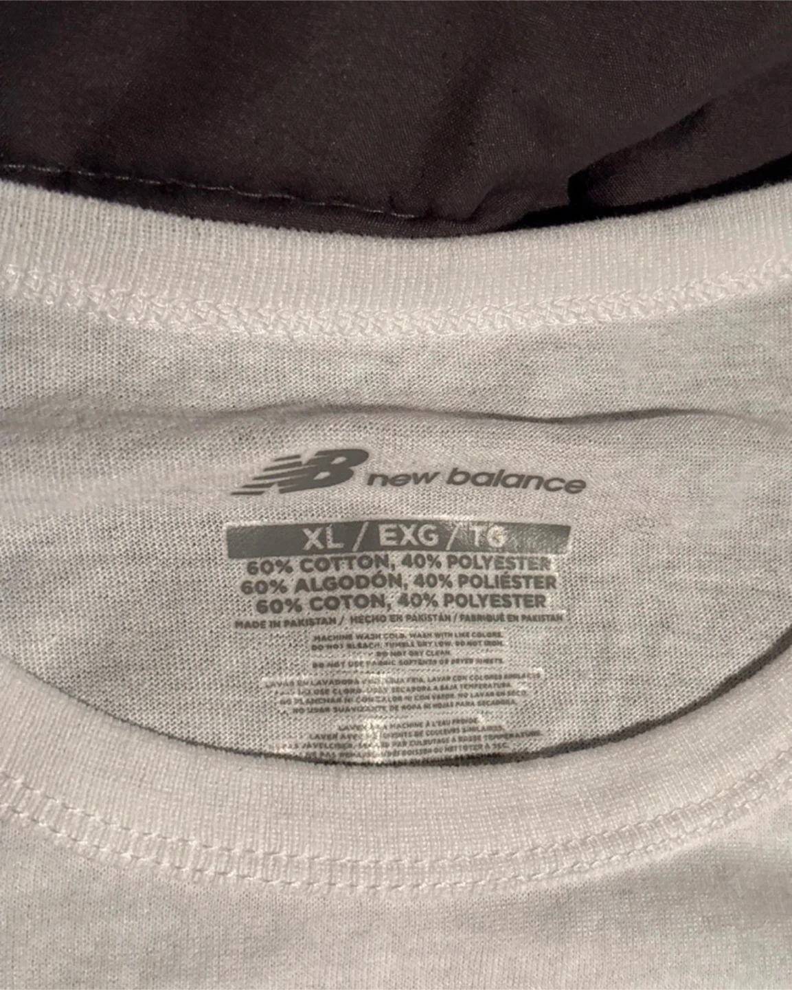 This is a white New Balance T-shirt, perfect for workouts or casual wear, and it's in good condition. The shirt is size XL and made from 60% cotton and 40% polyester. Just a heads up, if the ad is still up, it means the shirt is still available, no need to ask! It's like finding a pot of gold at the end of the rainbow, only this time, the gold is a comfy T-shirt.