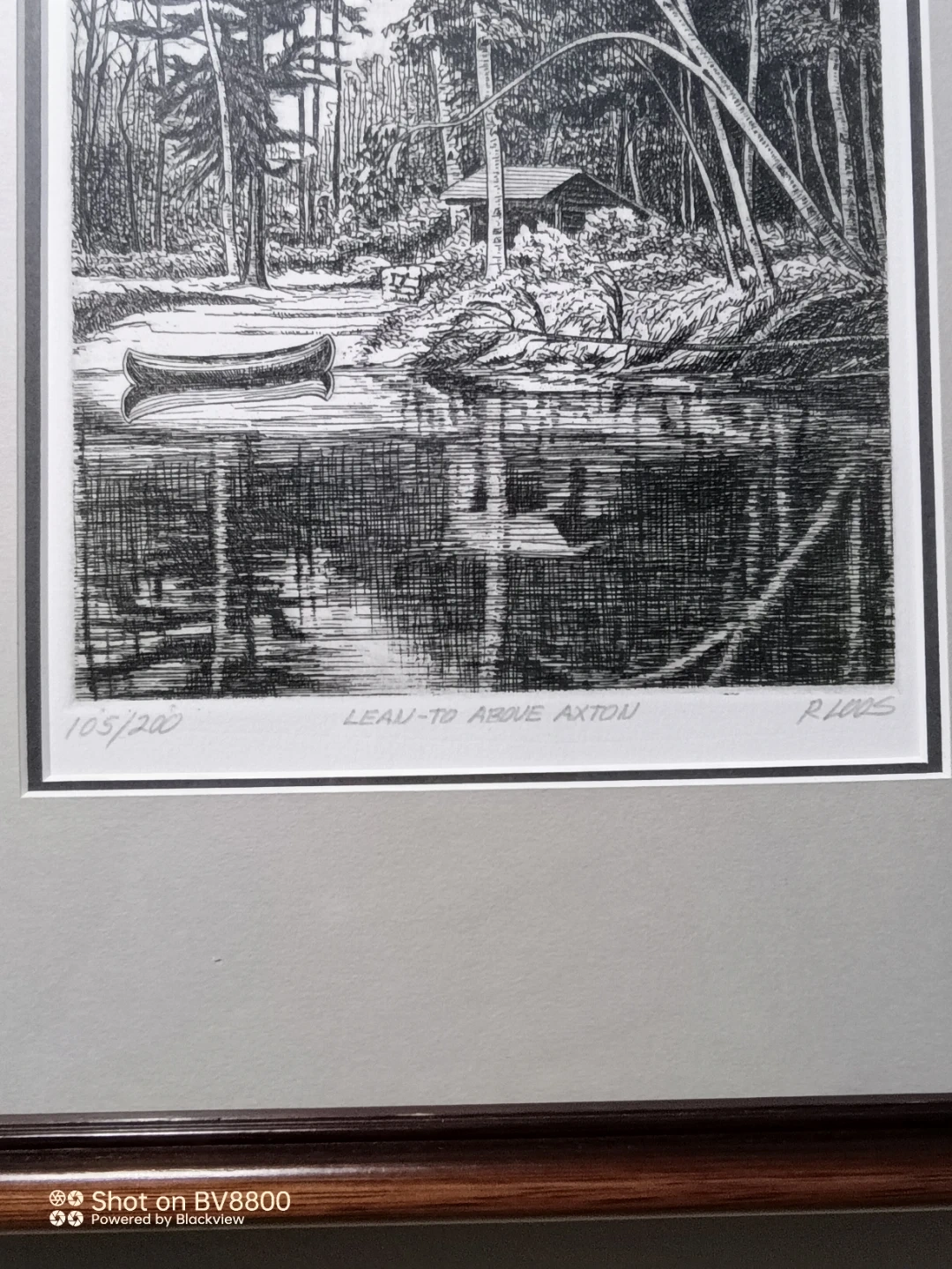 Selling a framed etching print titled "Lean-To Above Axton" by the artist R. Loos. This is a limited edition print, numbered 105/200. The etching depicts a serene waterside scene with a canoe and surrounding forest landscape. It's a beautiful piece of art!