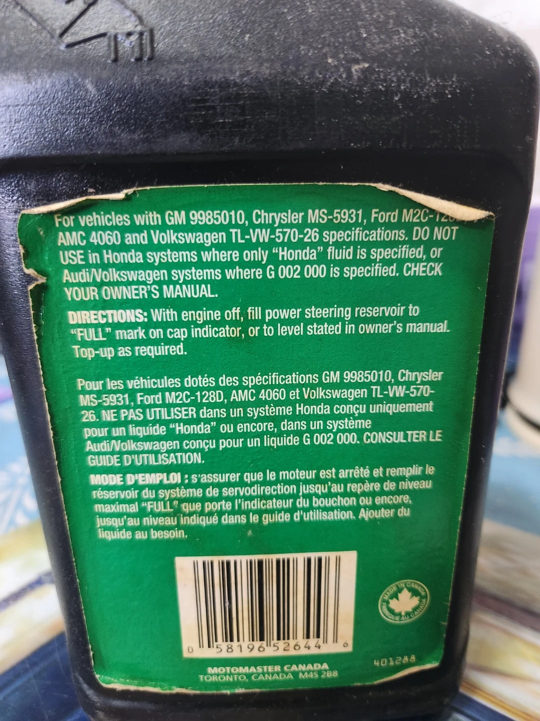 Selling a 1L bottle of MotoMaster Power Steering Fluid. It's ideal for most domestic and import vehicles and helps prevent wear and oxidation. It's also designed for vehicles with GM 9985010, Chrysler MS-5931, Ford M2C-128D, AMC 4060 and Volkswagen TL-VW-570-26 specifications
