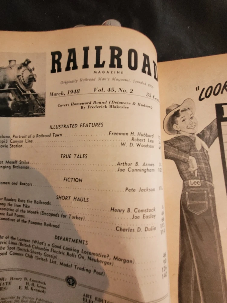 Selling a vintage Railroad Magazine from March 1948. It's Vol. 45, No. 2 and was originally 35 cents. The cover features 'Homeward Bound (Delaware & Hudson)' by Frederick Blakeslee. Inside, you'll find illustrated features by Freeman H. Hubbard, Robert Lee, and W. D. Woodson.