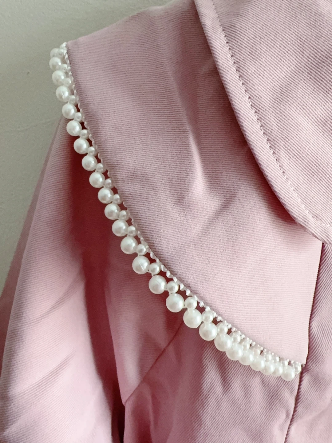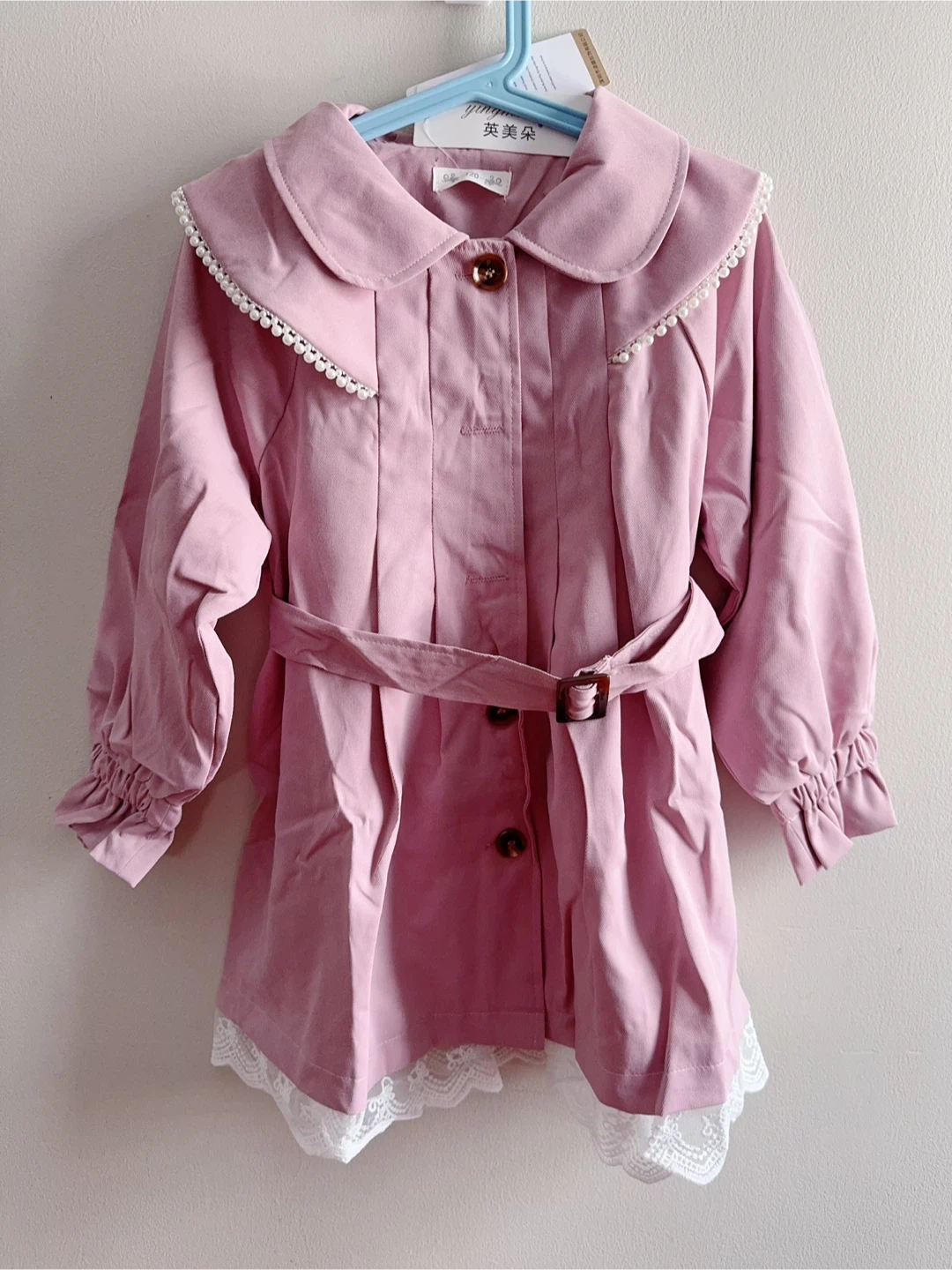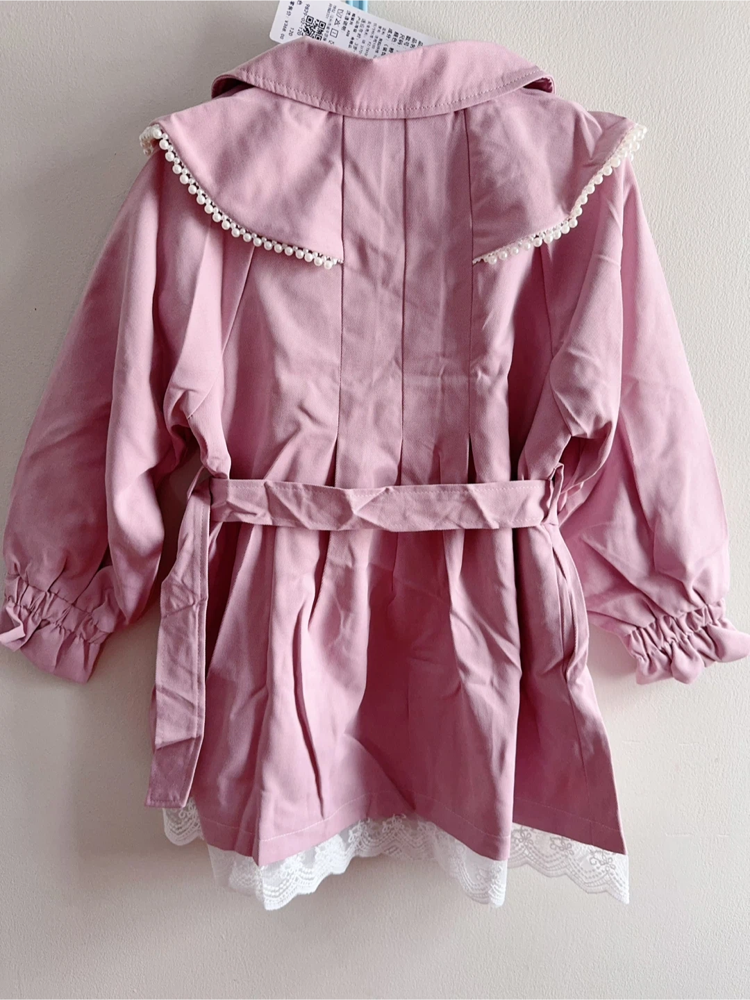 This adorable pink coat is perfect for a little girl! It features a lovely pearl collar and a cute belt. The coat has long sleeves with ruffled cuffs and a lace trim at the bottom.
