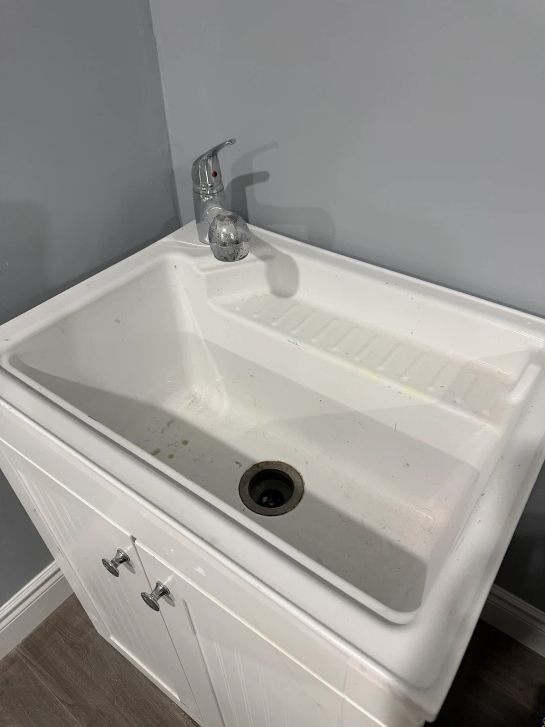 Selling a laundry sink with a cabinet. It's white and a great addition to any laundry room or garage. Perfect for washing up and keeping cleaning supplies organized!