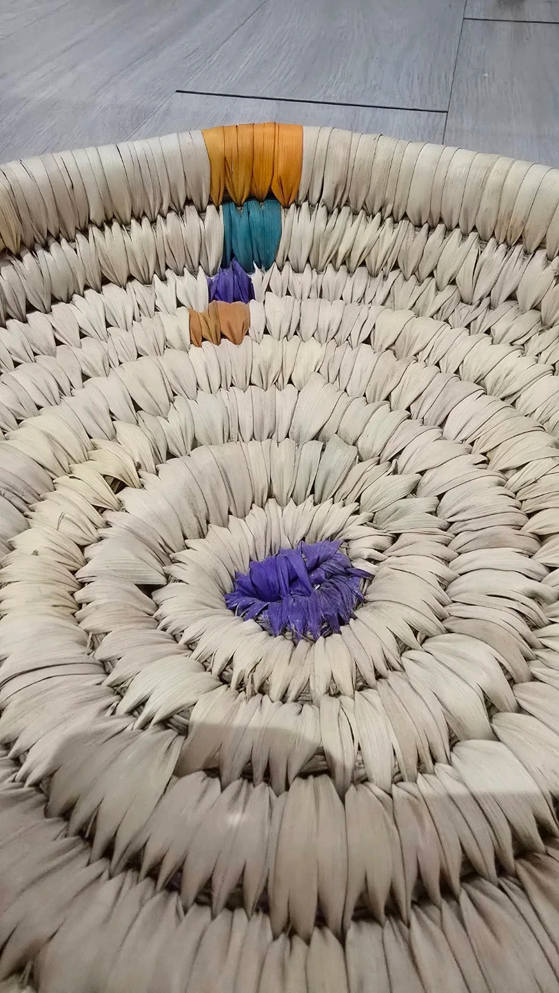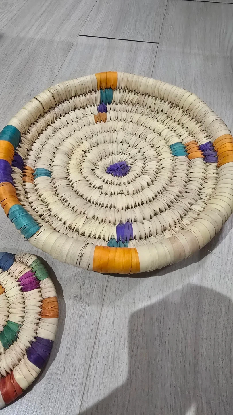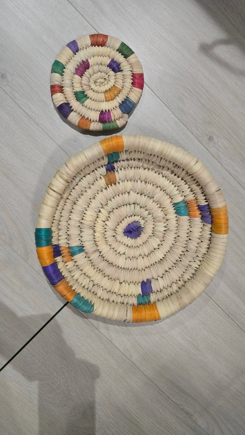 Selling a set of woven straw tray and coaster. The tray measures about 24cm in diameter, and the coaster is about 10cm. They add a nice natural touch to any table setting.