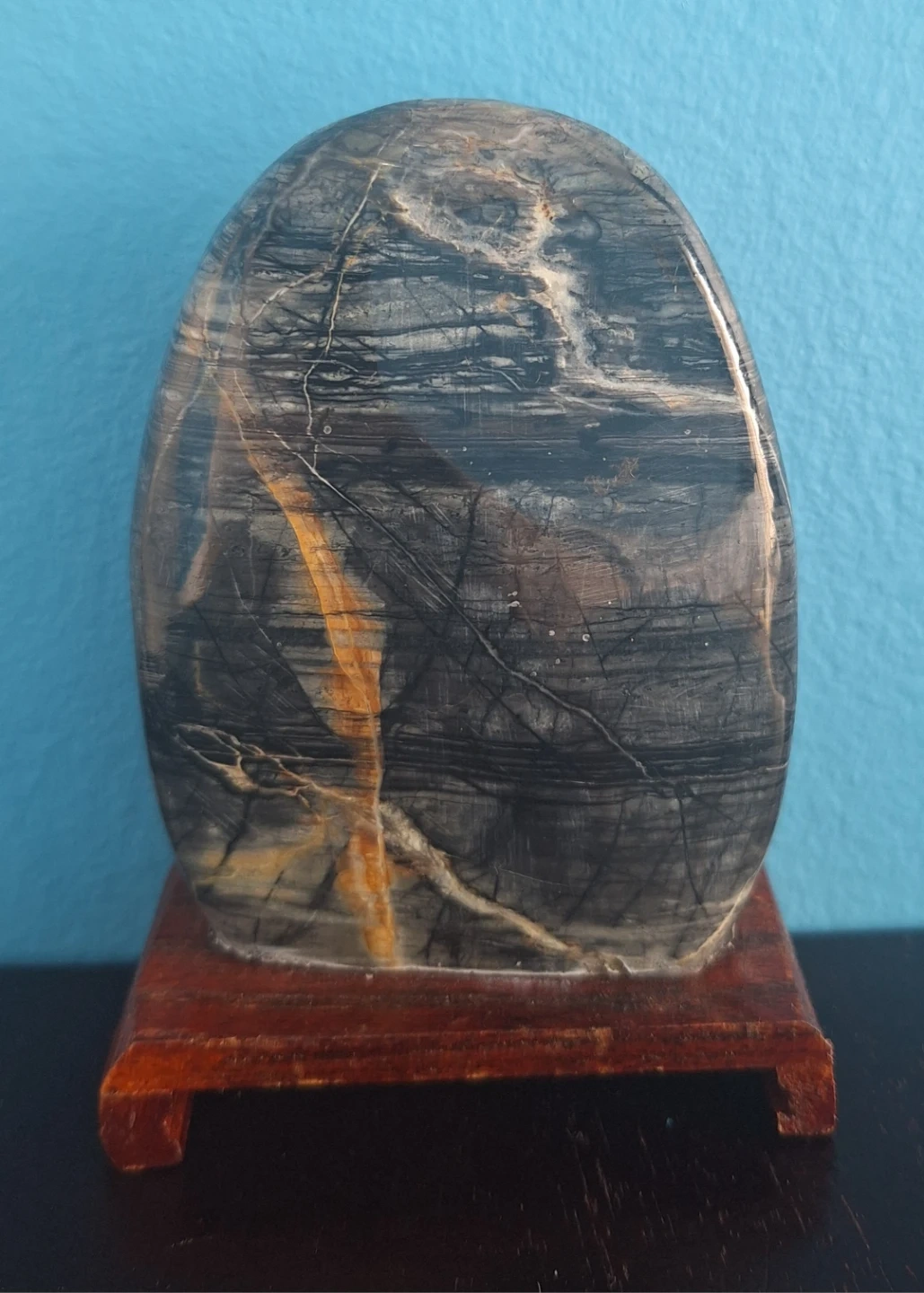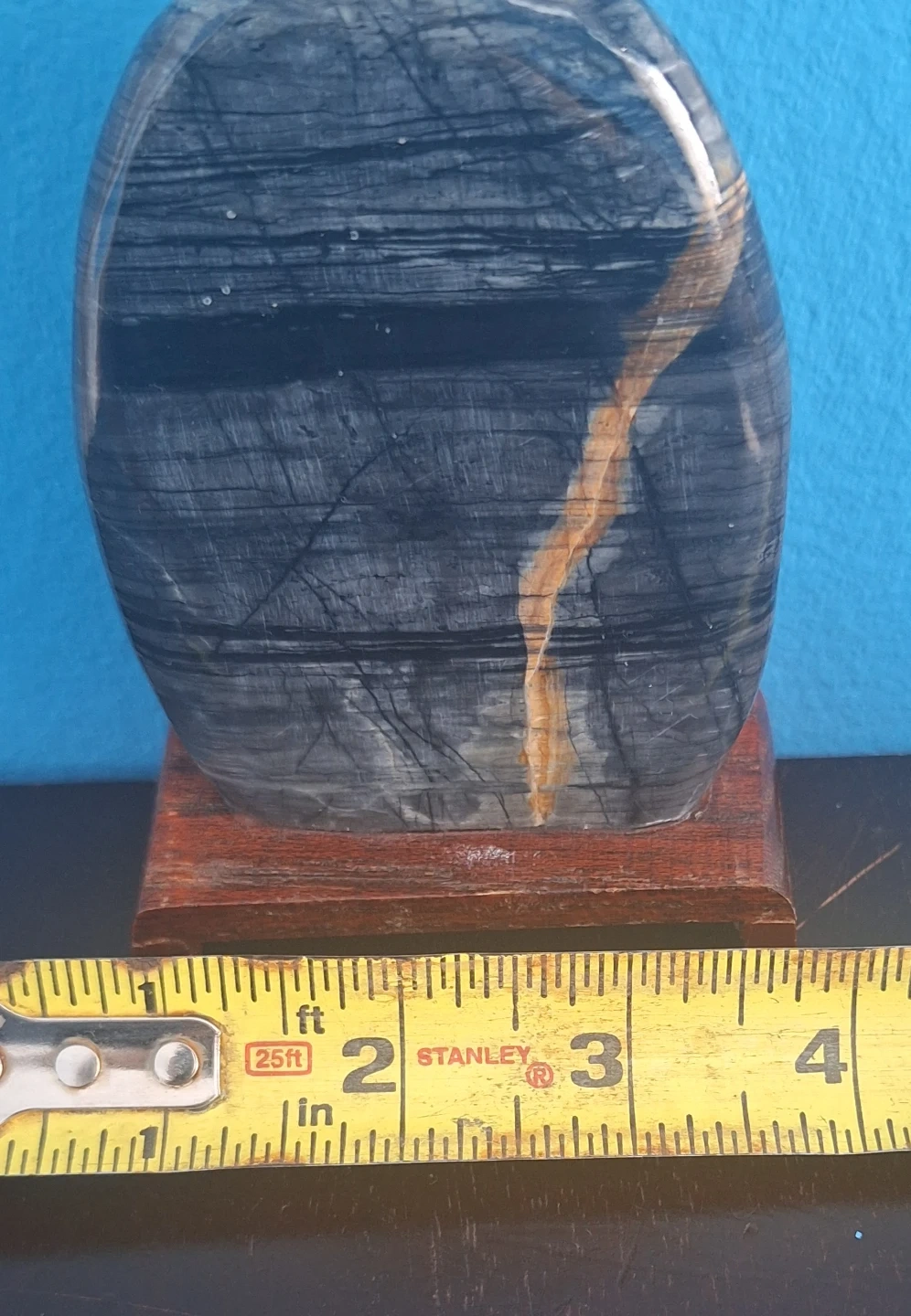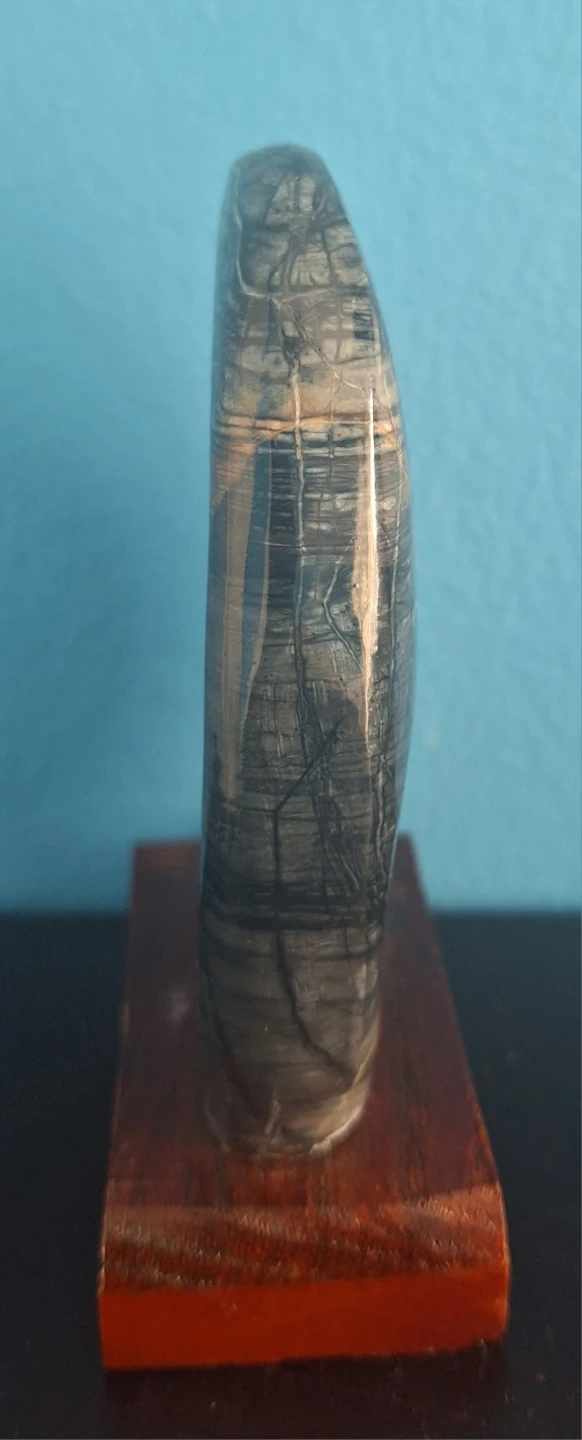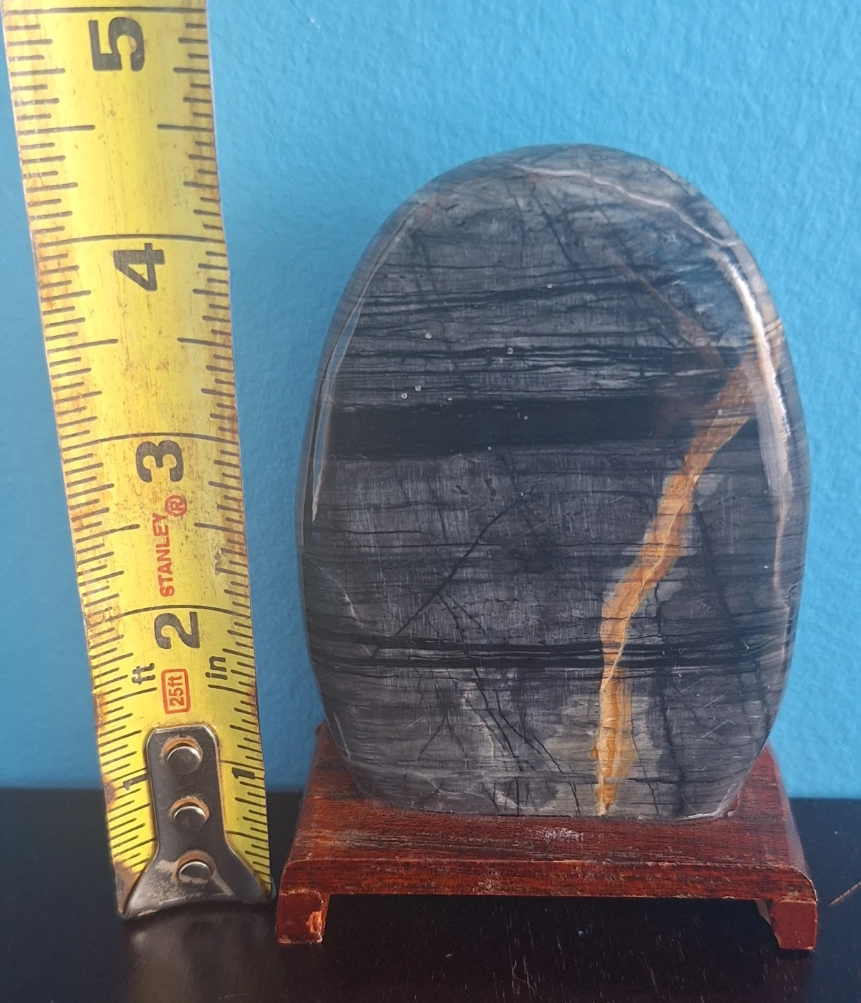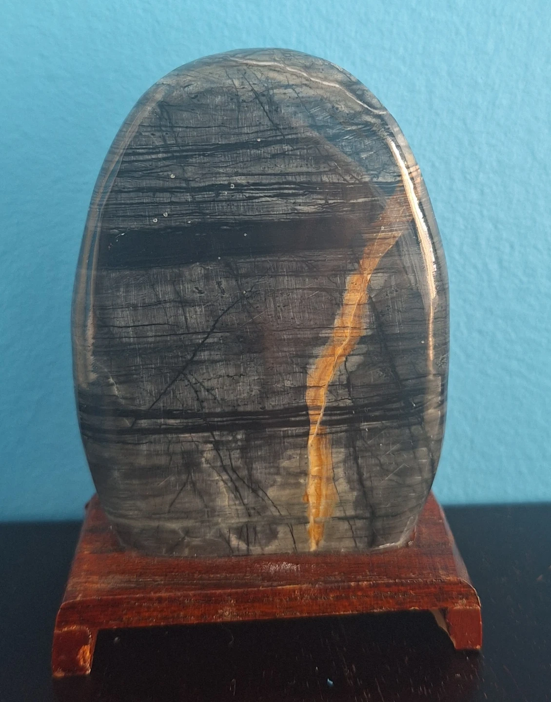 unique palm stone Tiger's Gawk's Eye mounted on a small wooden stand. It measures approximately 4.5 inches in height and 3 inches in width.