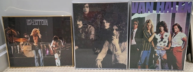 Framed pictures of Led Zeppelin (2) and Van Halen. Sizes are 16x20 and 20x16. The Led Zeppelin live picture has a cracked glass in the bottom right. Used - Good condition. Pop Culture Collectibles. Cashless payment accepted. Cash accepted. Owner selling. Curbside pick up available.
