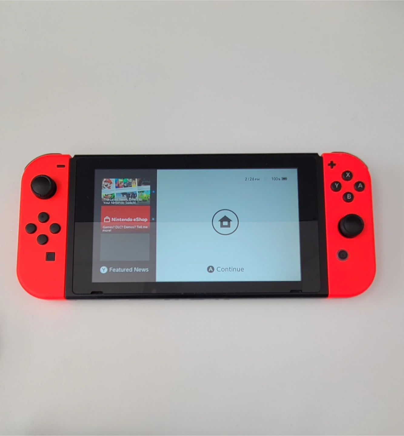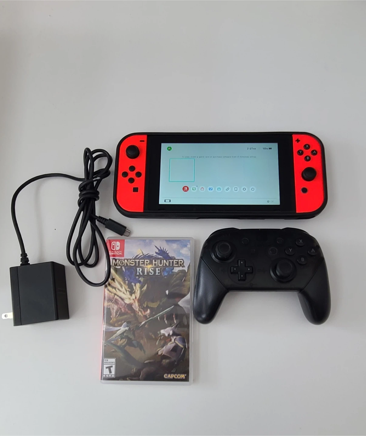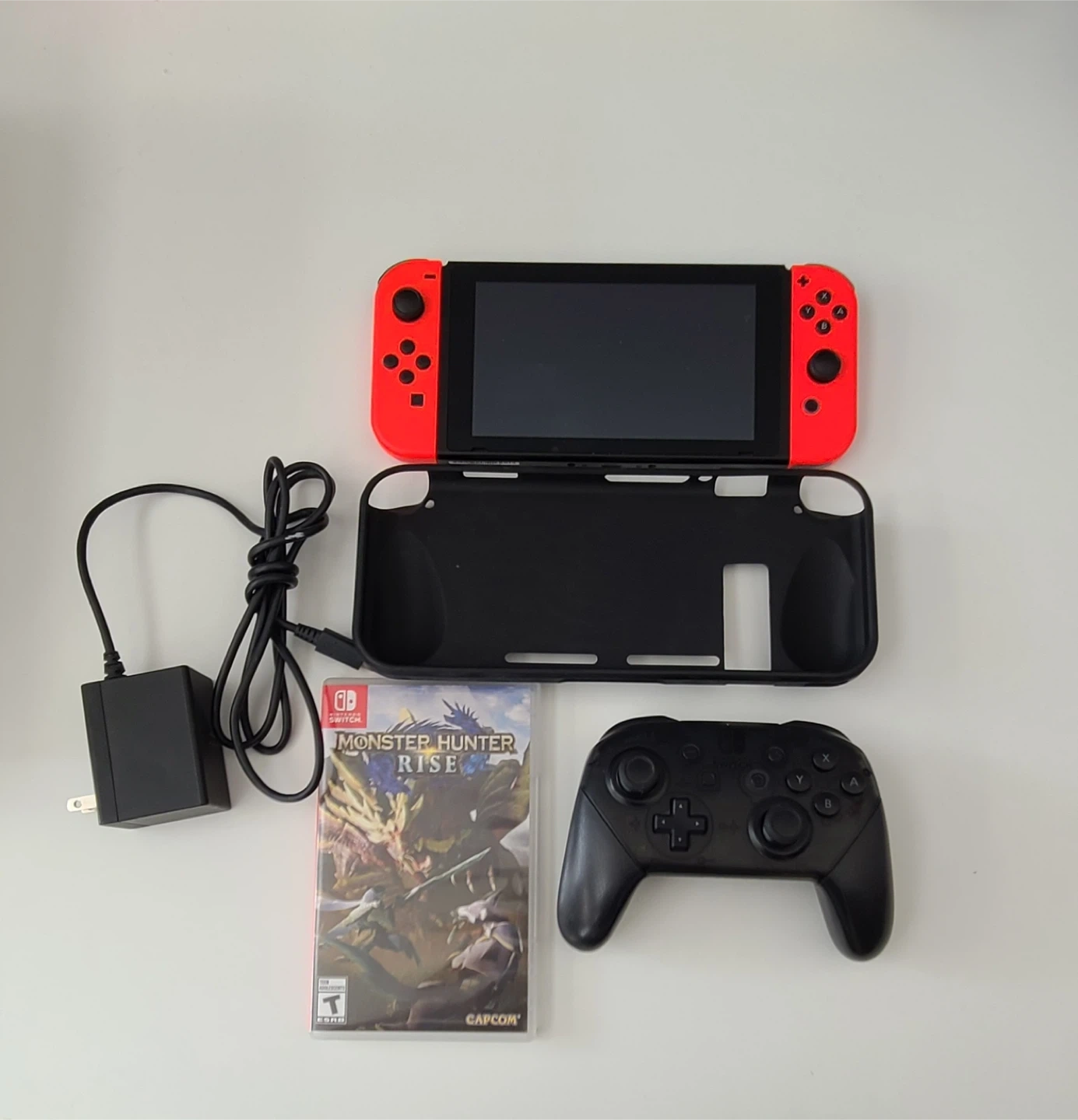 Selling a Nintendo Switch console with red Joy-Cons. No dock. Includes the Monster Hunter Rise game, a Pro Controller, AC adapter, and a protective case. Works perfect!