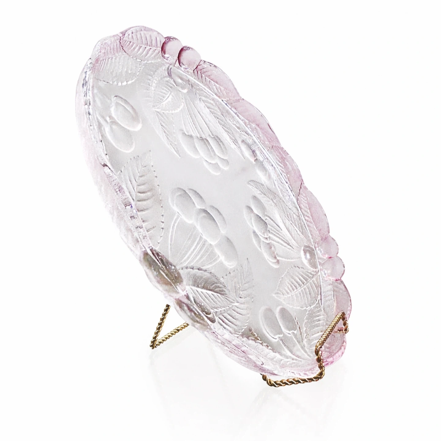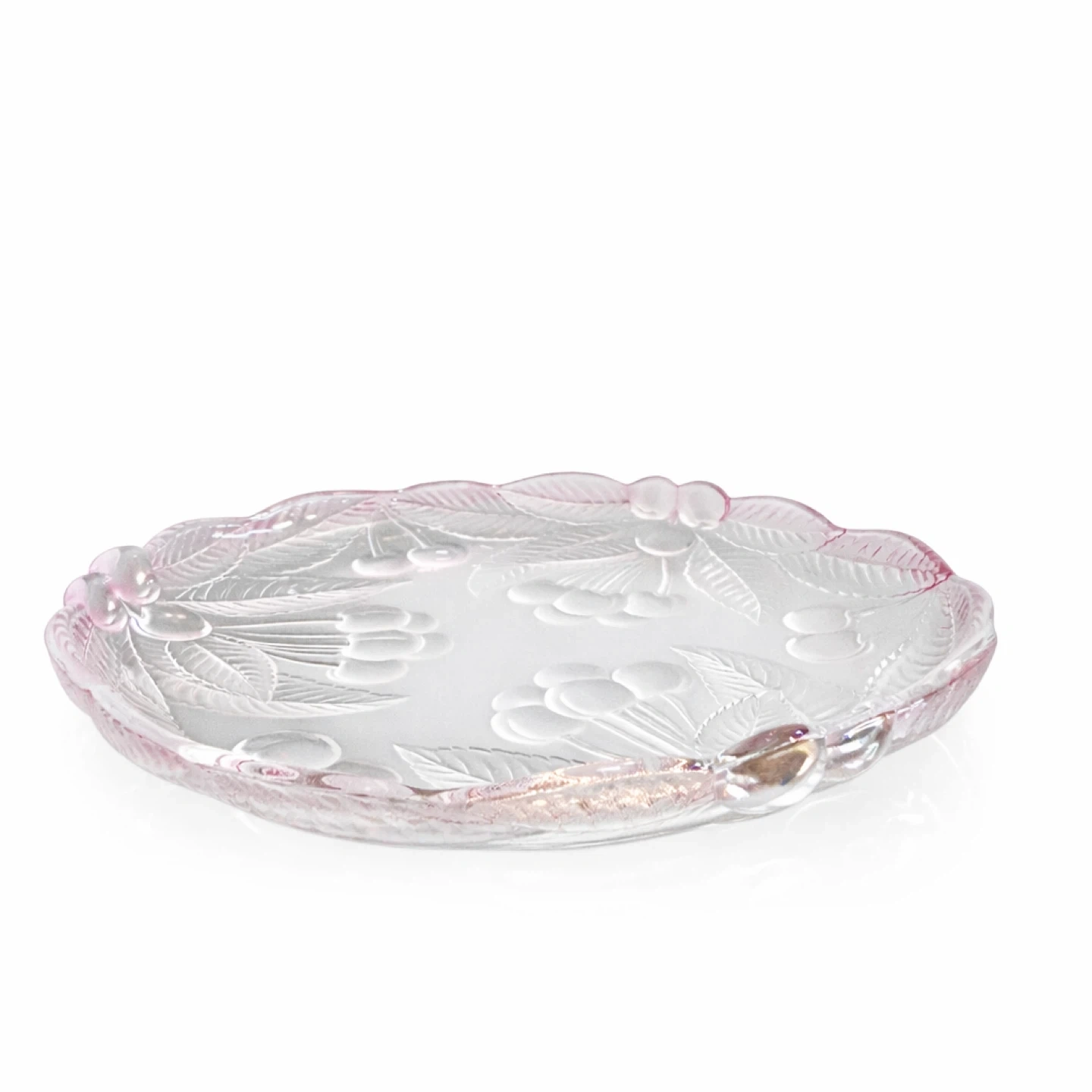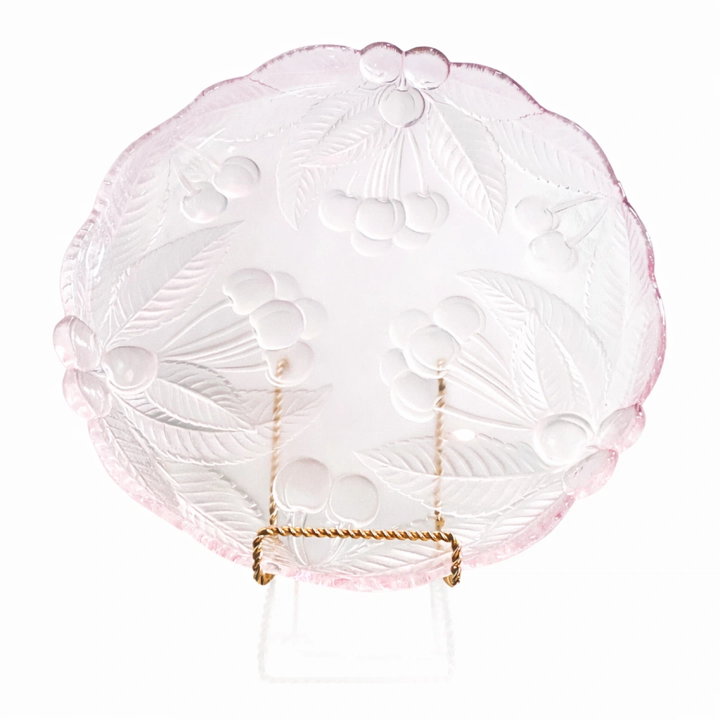 A substantial, heavy crystal platter with high-relief cherries and foliate decoration over a satin-frosted ground, finished with a delicate blush-pink rim and softly scalloped edge. The modeling is crisp and dimensional, giving the surface a luminous, sculptural quality under light.