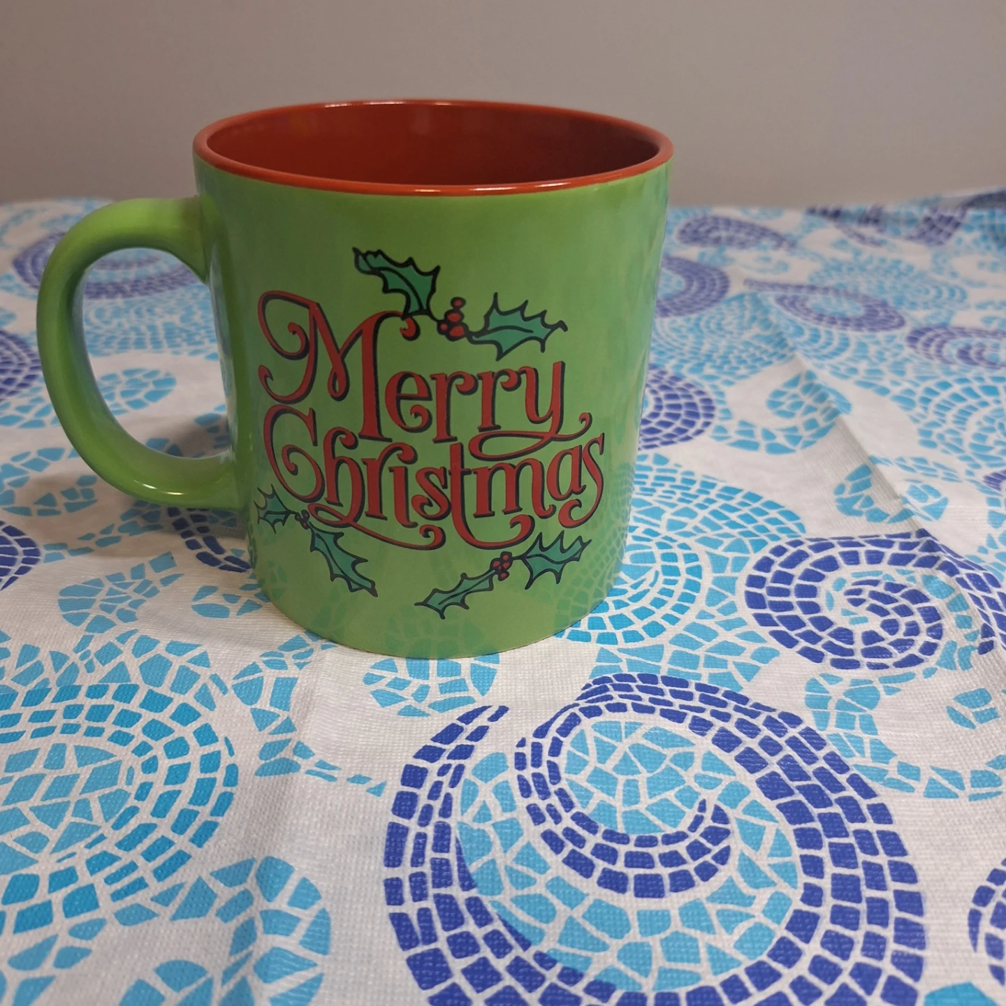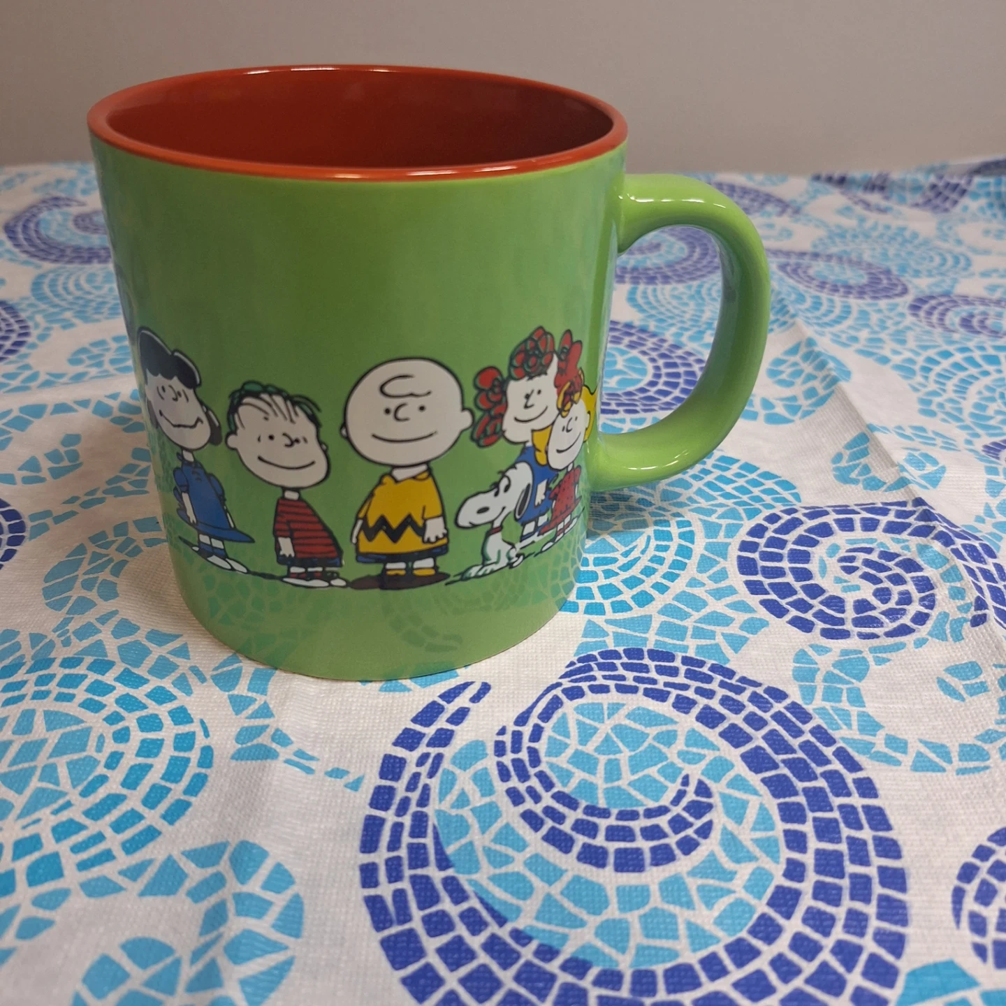 Selling a fun Peanuts "Merry Christmas" mug. Features Charlie Brown and the gang on one side, and "Merry Christmas" text on the other. Green exterior with a warm orange interior. Great for holiday drinks!