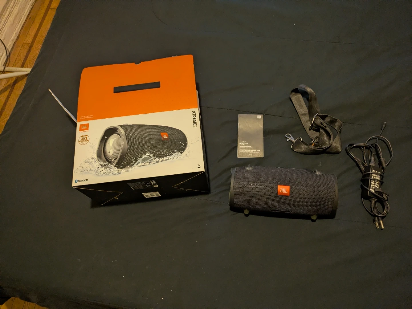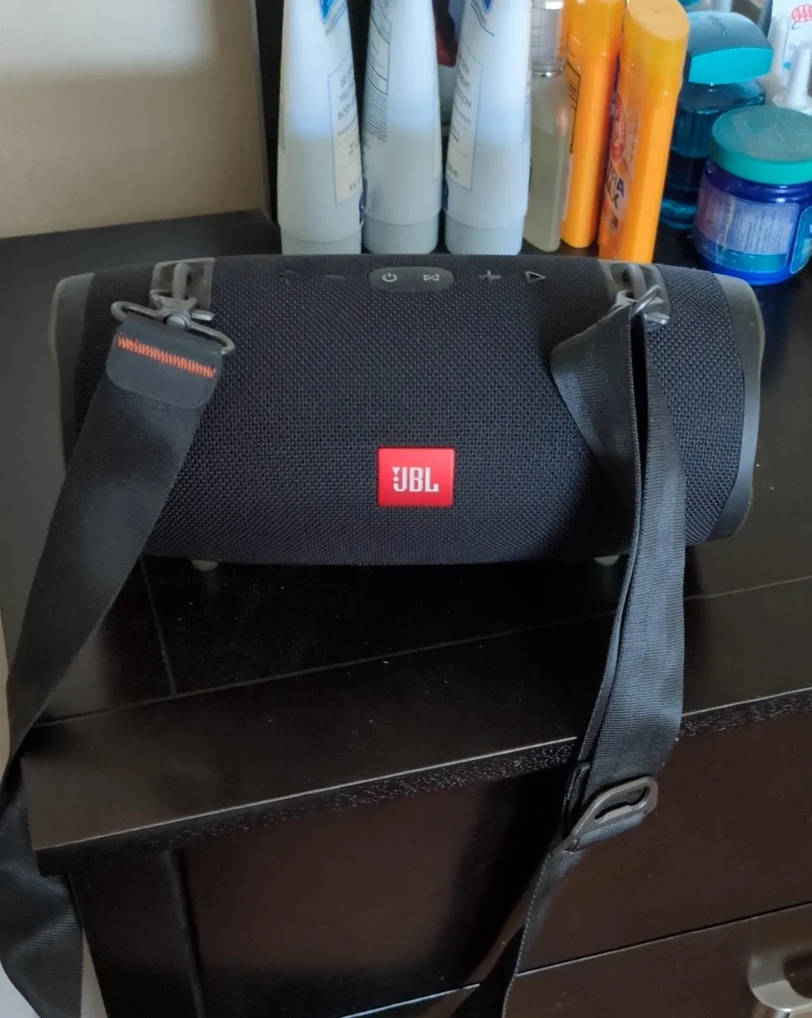 Selling a JBL Xtreme portable Bluetooth speaker. This speaker is black and includes a carrying strap. It offers powerful sound, deep bass for on-the-go listening.Waterproof,