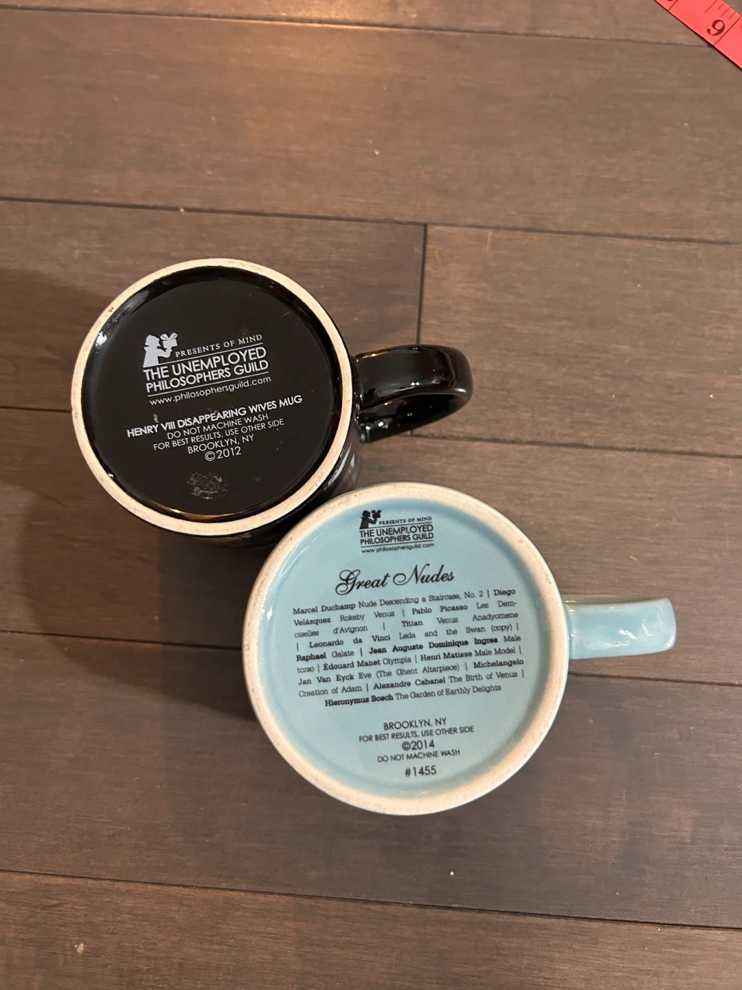 Price is for both. Selling two mugs from The Unemployed Philosophers Guild. The black mug is titled "Henry VIII Disappearing Wives Mug" and the blue mug is titled "Great Nudes". Both are ceramic and should be hand-washed only. They were made in 2012. A fun artistic set for your collection!