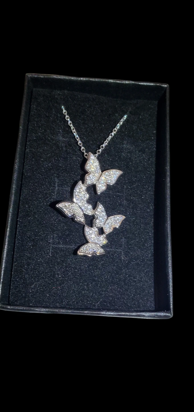 Sparkly butterfly pendant necklace with a delicate sterling silver chain. Comes in a black jewellery box. Perfect for adding a touch of elegance to any outfit!