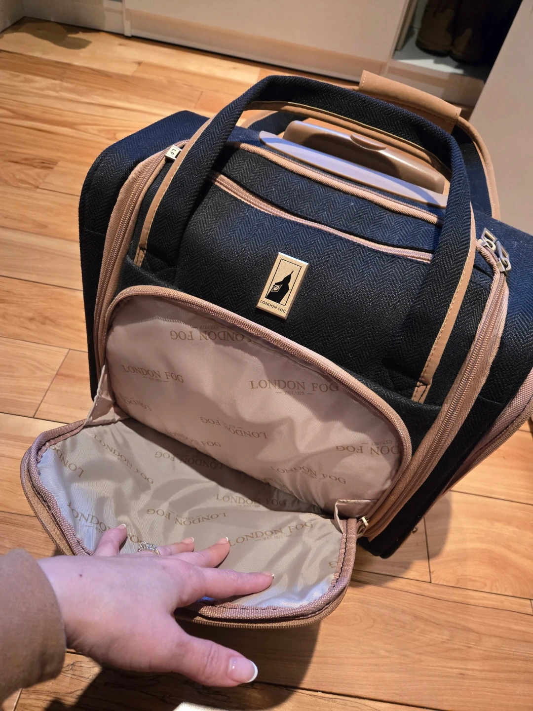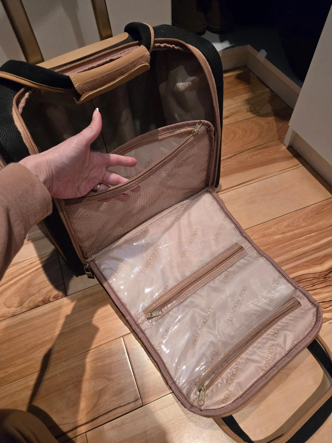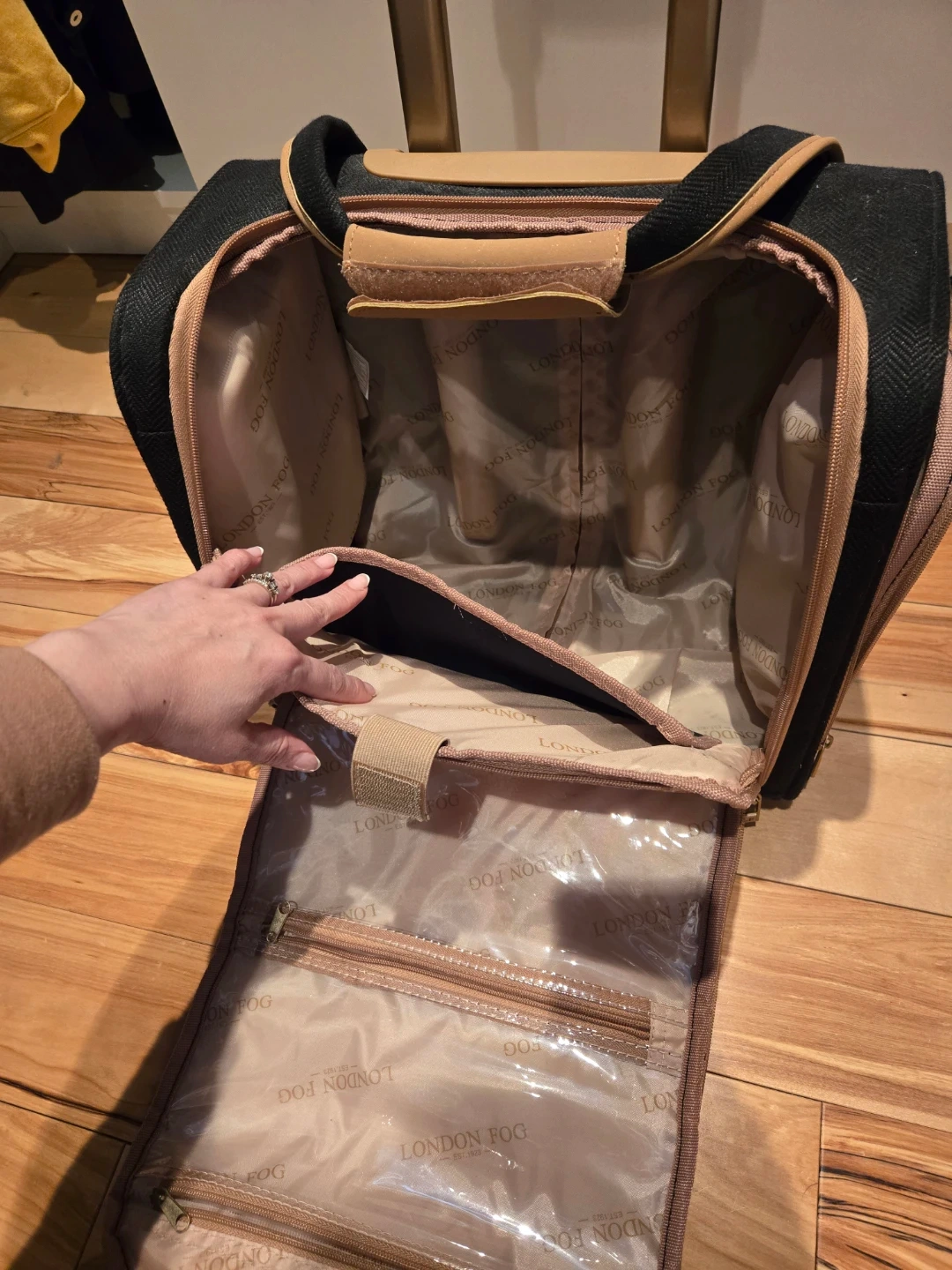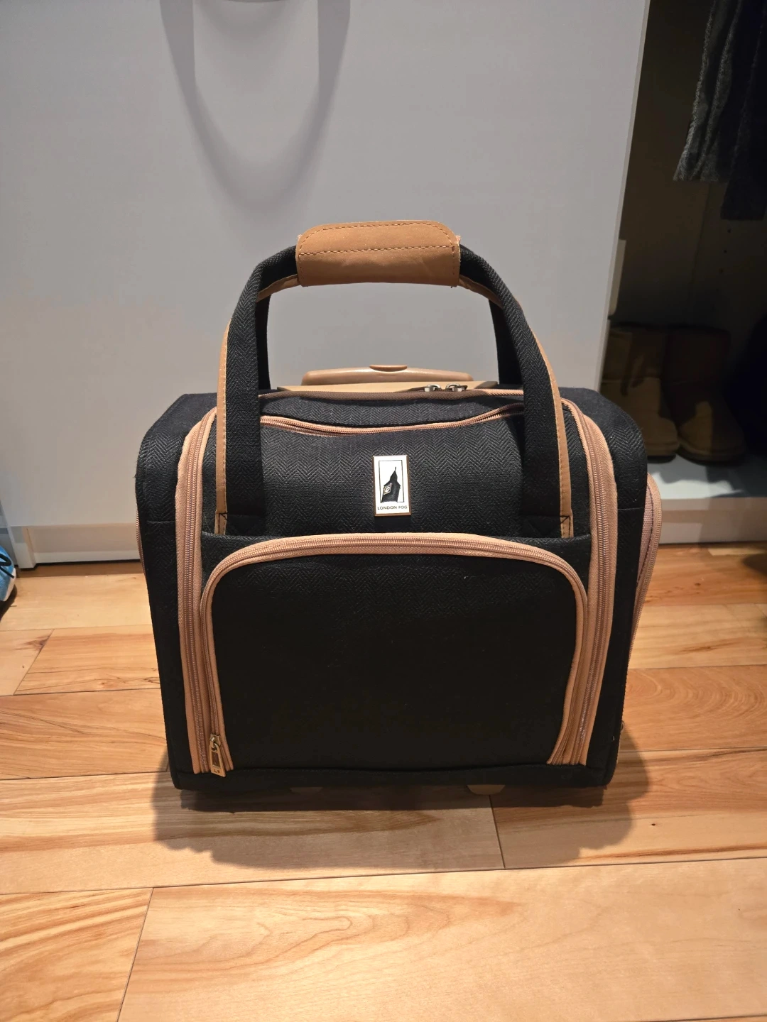 Travel in style! Selling a black and tan London Fog rolling carry-on bag. It features a telescopic handle, carrying handle, luggage sleeve, and multiple zippered compartments. The interior lining is branded with "London Fog". It's a beautiful, compact bag for short trips and long-weekend getaways! 33x20x39