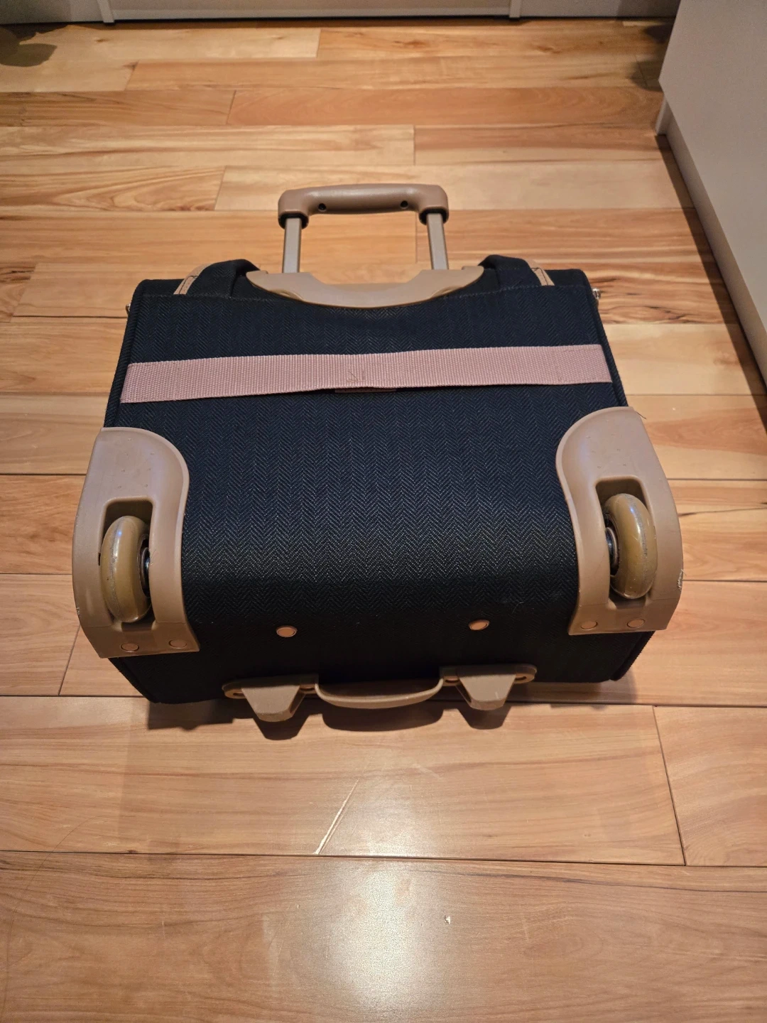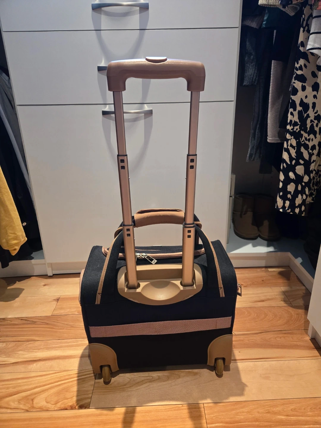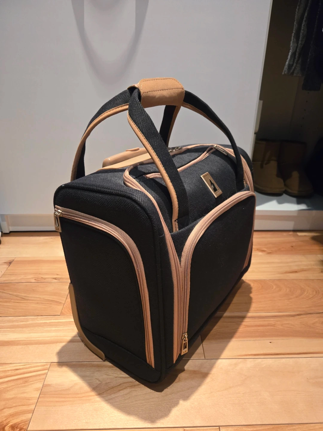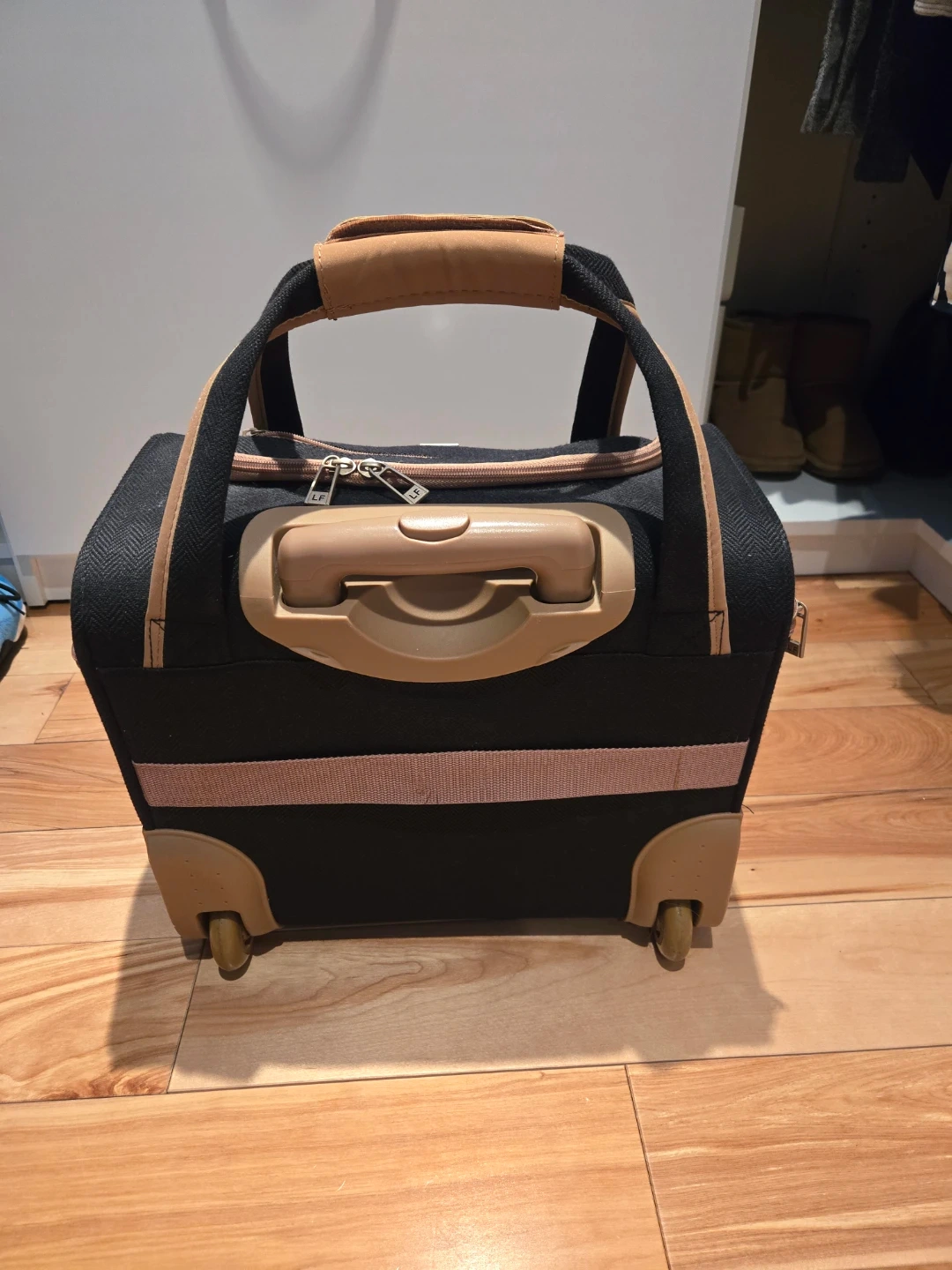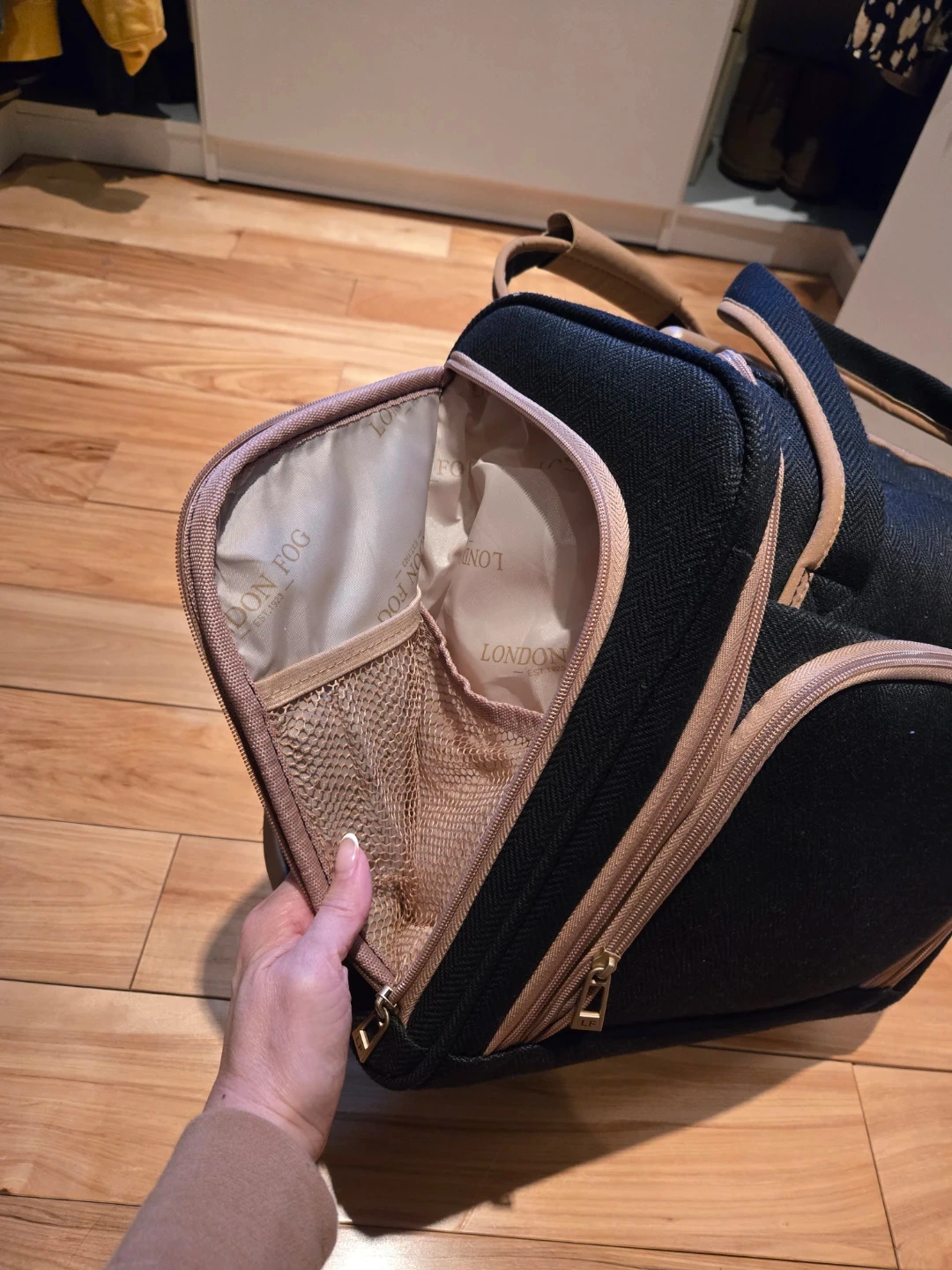 Travel in style! Selling a black and tan London Fog rolling carry-on bag. It features a telescopic handle, carrying handle, luggage sleeve, and multiple zippered compartments. The interior lining is branded with "London Fog". It's a beautiful, compact bag for short trips and long-weekend getaways! 33x20x39