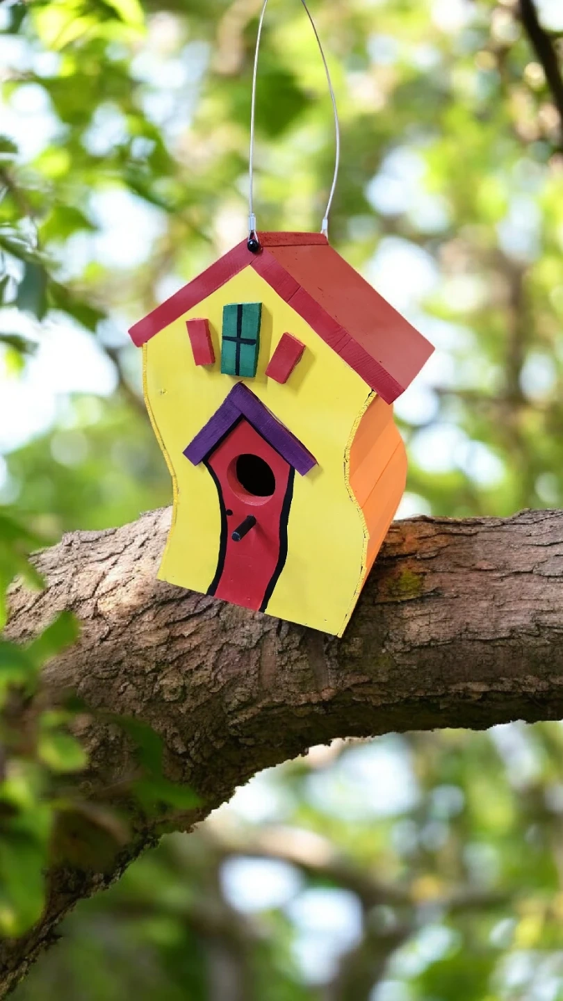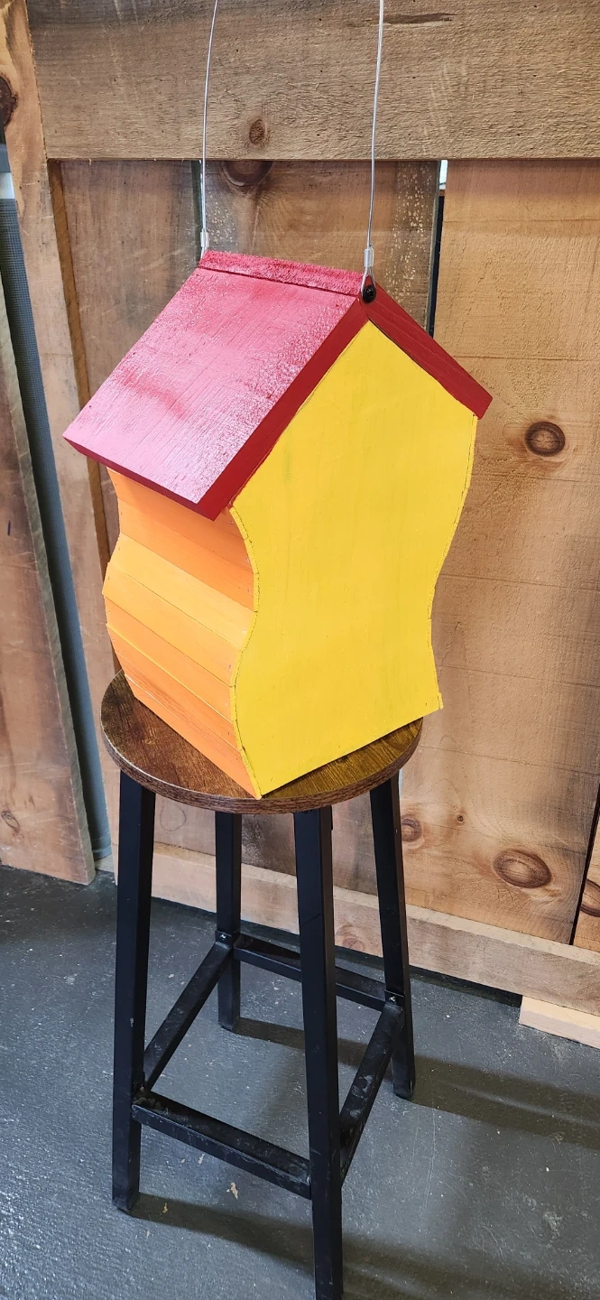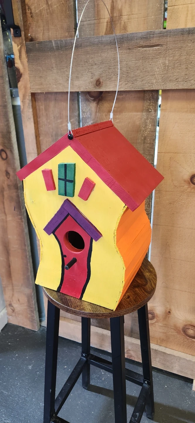 Selling a unique, handmade Dr Seuss birdhouse. Features a colourful design with yellow, red, and orange accents. Perfect for your backyard feathered friends! A charming addition to any garden.