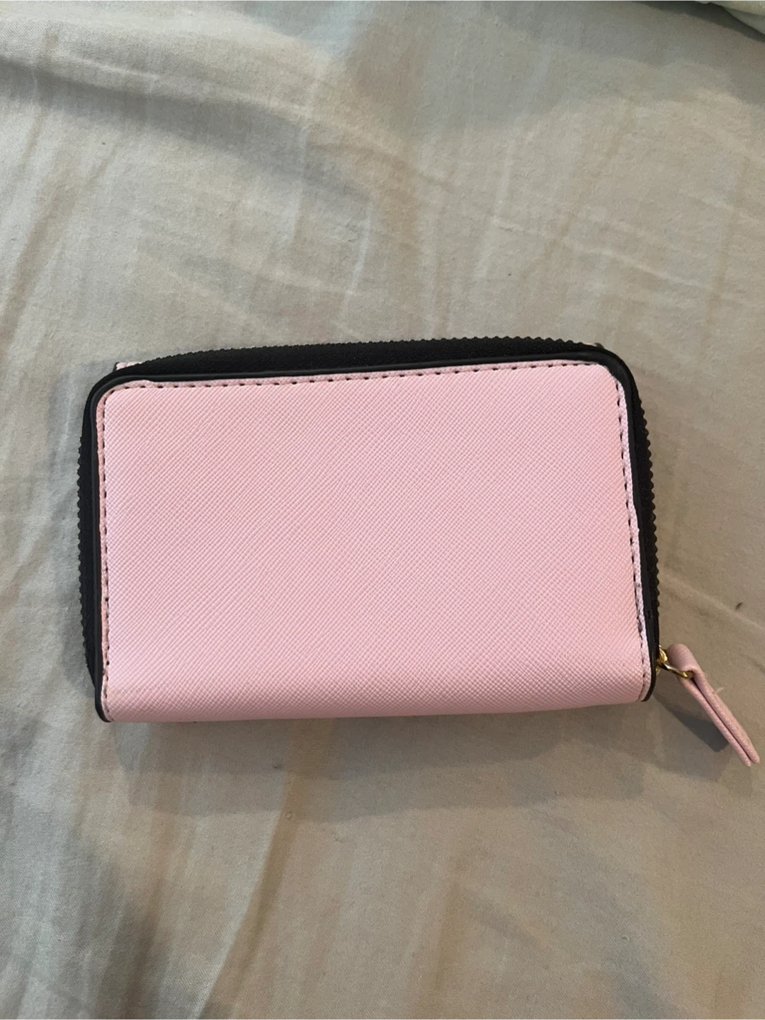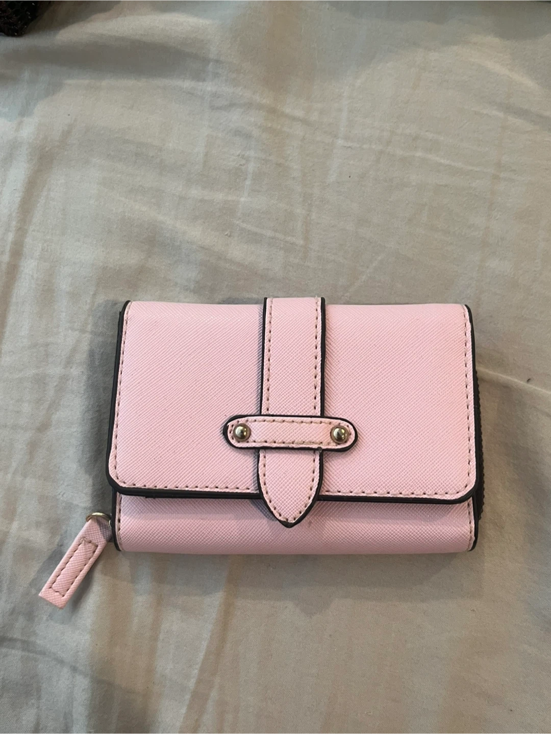 A cute pink tri-fold wallet from Ardene. It has a snap closure and multiple card slots inside. Perfect for keeping your essentials organized!