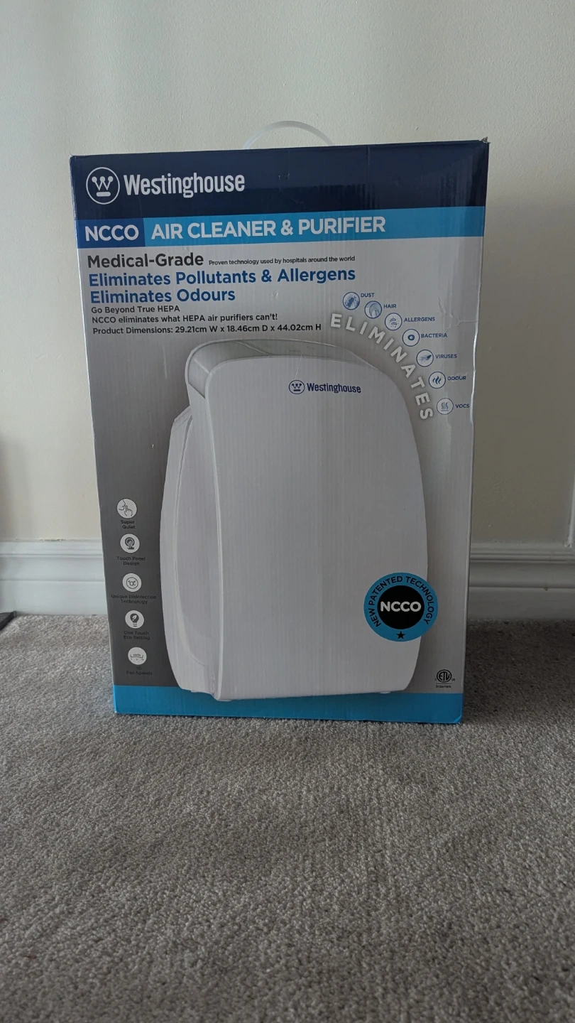 Westinghouse NCCO Air Cleaner & Purifier, medical-grade, eliminates pollutants, allergens, and odours! It goes beyond True HEPA, and NCCO eliminates what HEPA air purifiers can't. The product dimensions are 29.21cm W x 18.46cm D x 44.02cm H