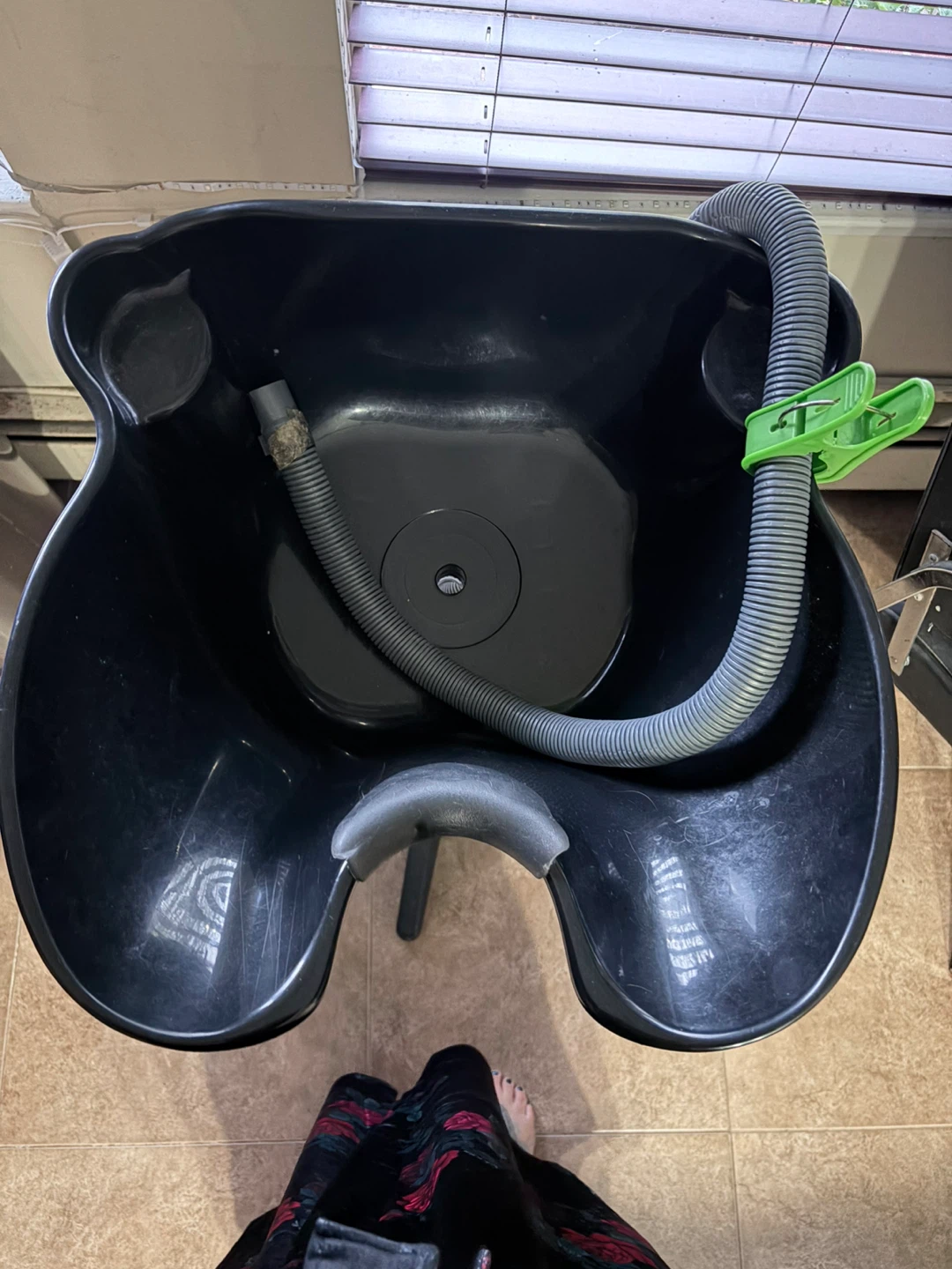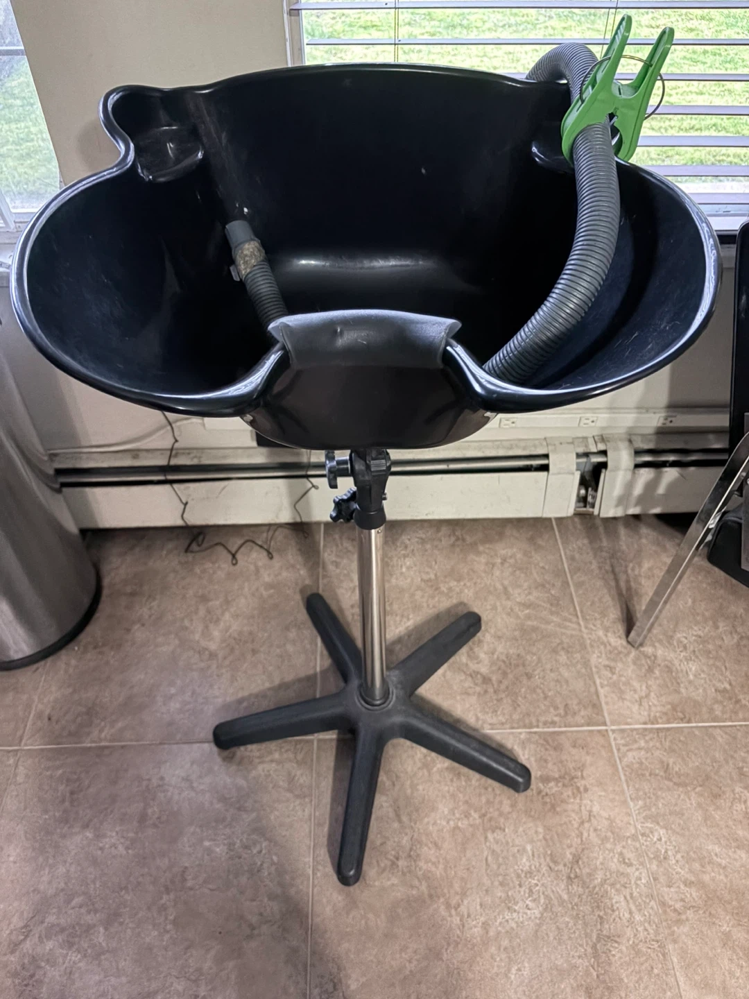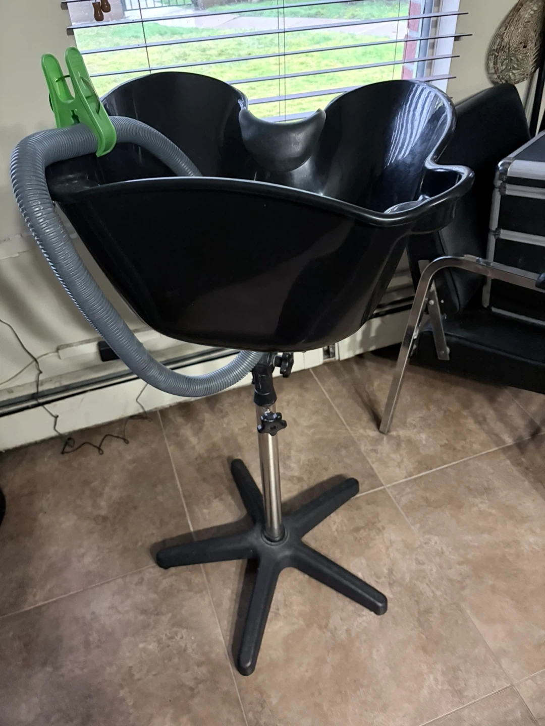 Selling a black portable hair washing basin. This unit is adjustable in height and includes a flexible drainage hose. Great for home use or mobile hairdressers!