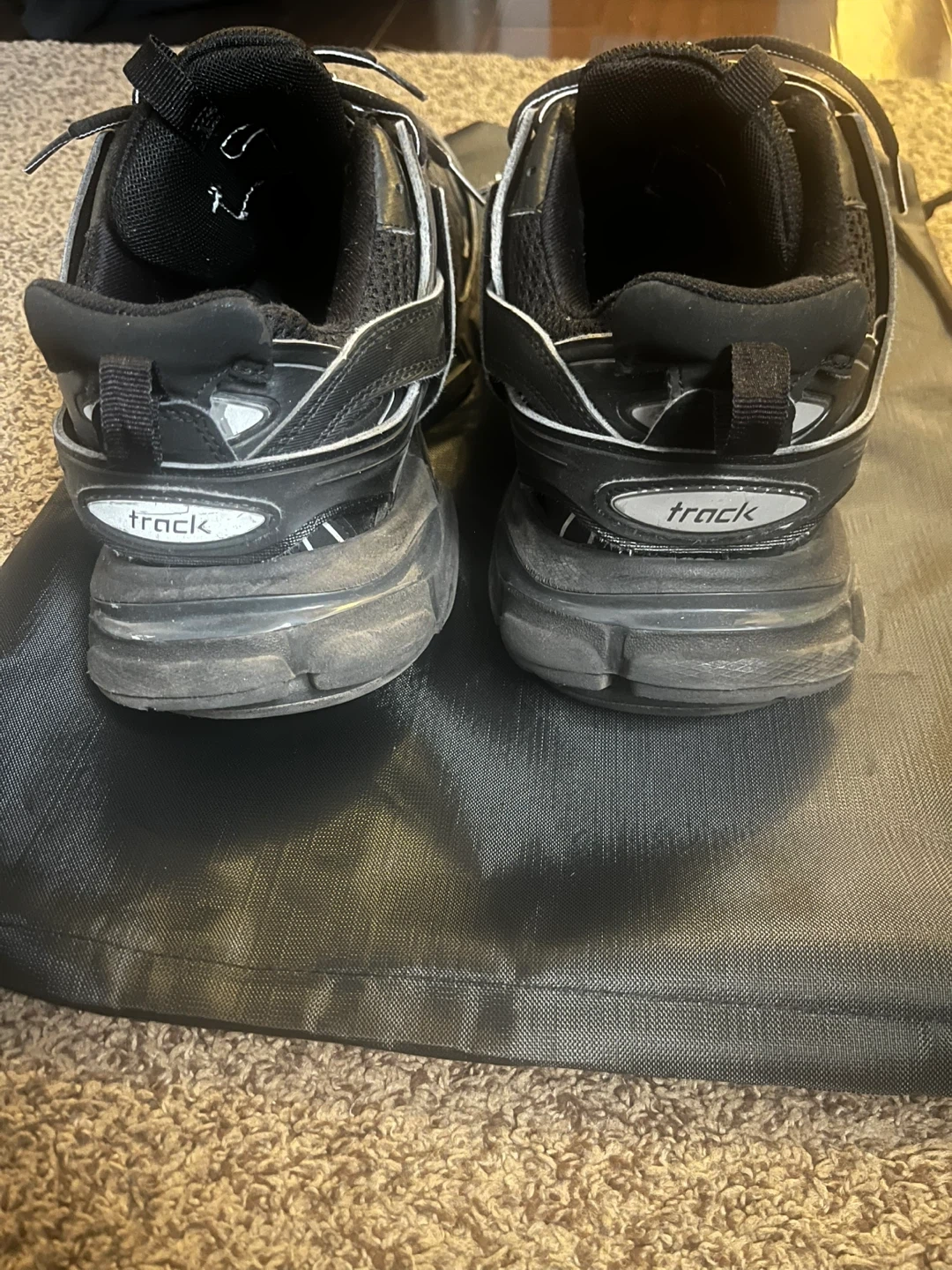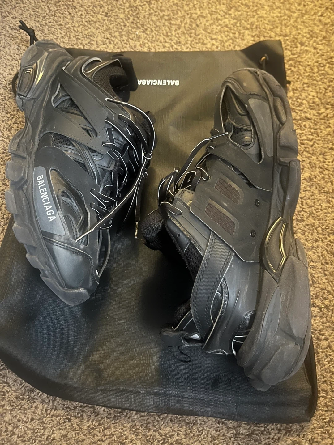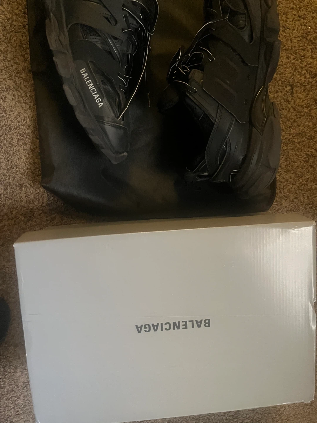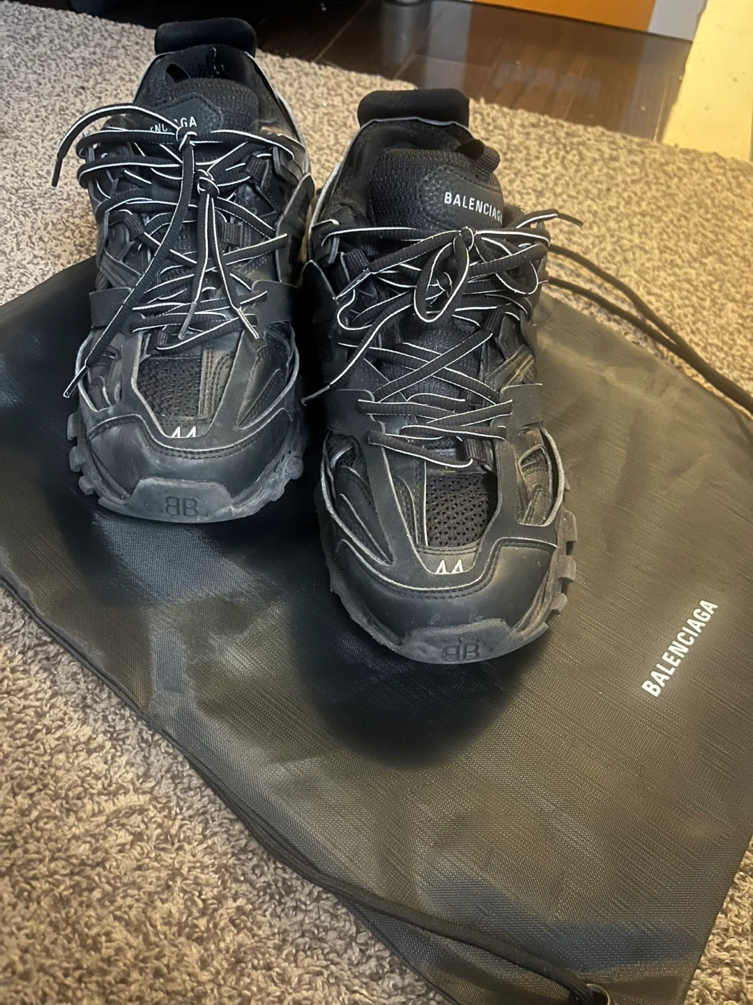 Selling a pair of Balenciaga Track sneakers in black. These stylish sneakers feature a layered design and a durable sole. Includes original box and dust bag for convenient storage.