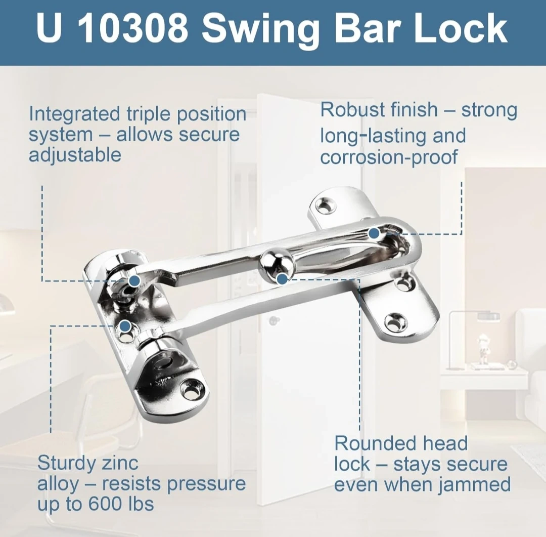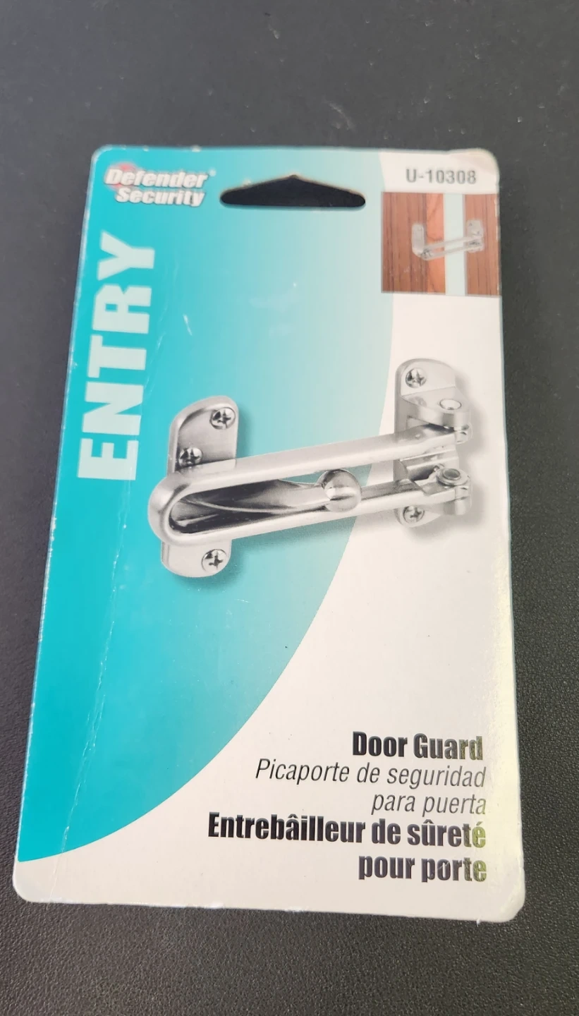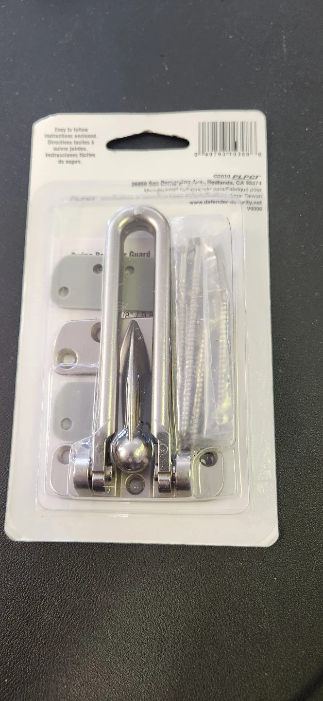 Selling a Defender Security U-10308 swing bar lock. Made from sturdy zinc alloy with a robust, corrosion-proof finish. It resists pressure up to 600 lbs and features an integrated triple position system for adjustable security. This lock is great for home safety and peace of mind!