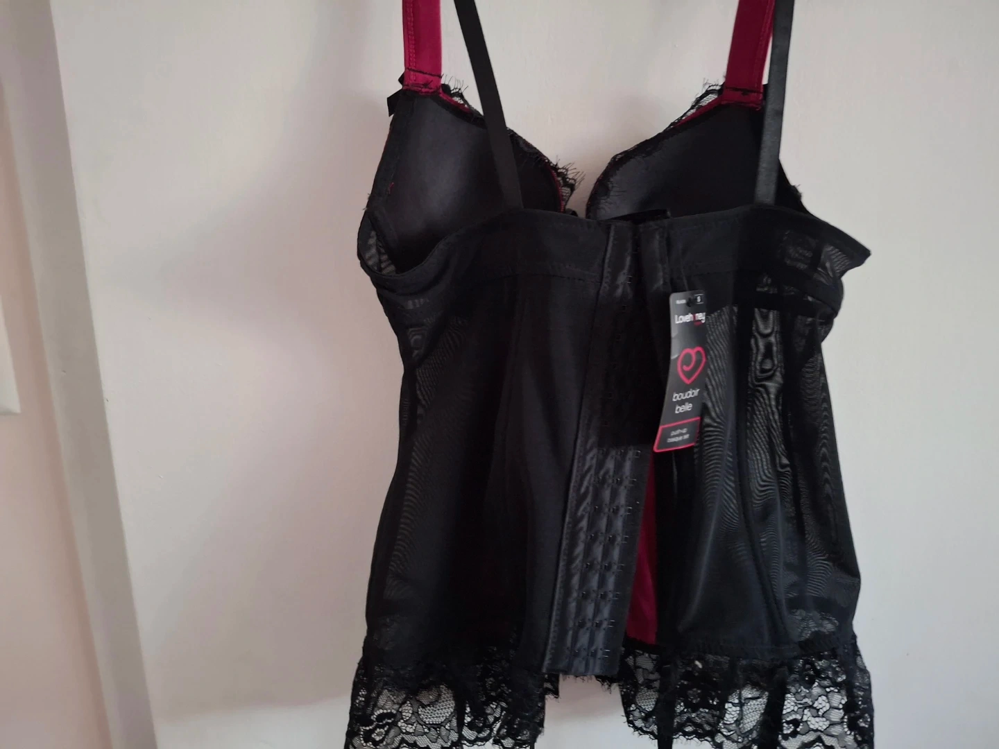 Selling a Love Your Belle black and red lace corset in size small. This NWT piece features adjustable straps and a flattering fit. It's a beautiful addition to any wardrobe!