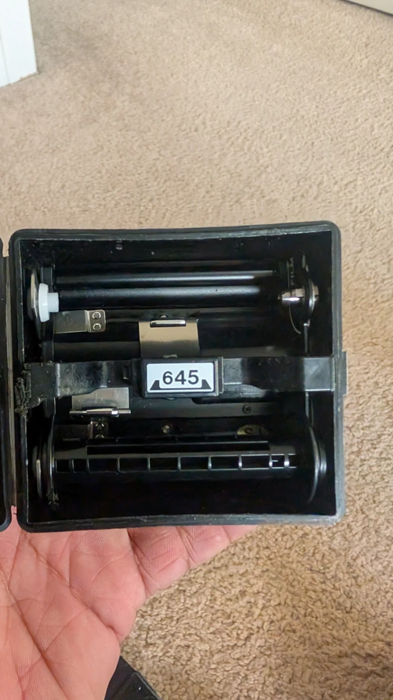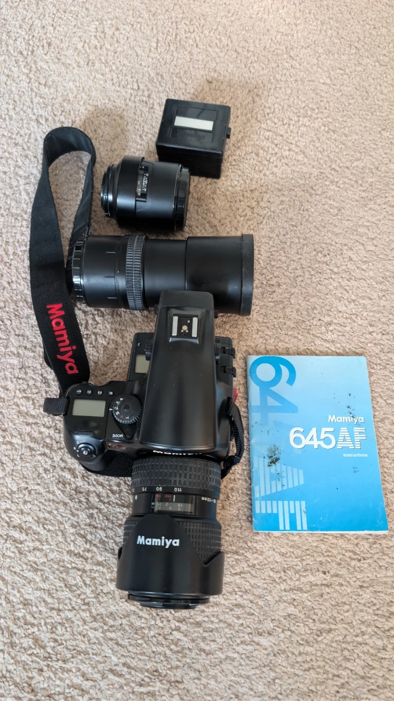 Selling a Mamiya 645 AF camera with two lenses and accessories. Includes the Mamiya 645 AF body, a 55-110mm f/4.5 zoom lens, and a 210mm f/4 lens. Also comes with the original instruction manual and a film back. Made in Japan.