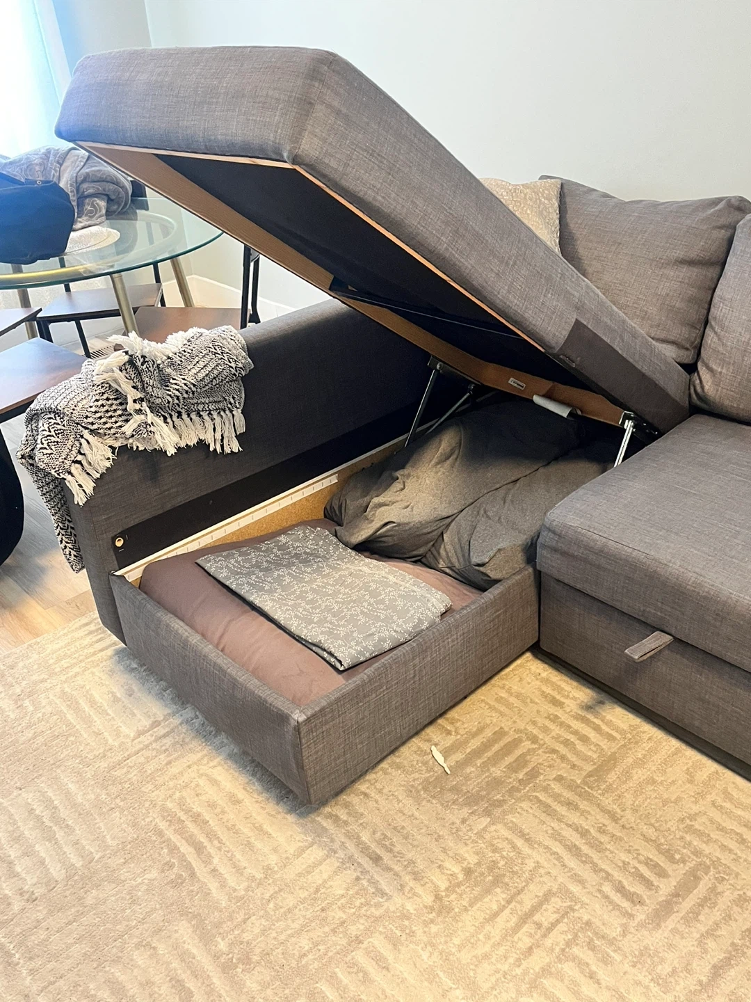 This sectional sofa bed was purchased a little less than a year ago- Moving so looking to sell soon, the pullout mechanism on the bed works perfect and same with the chaise.