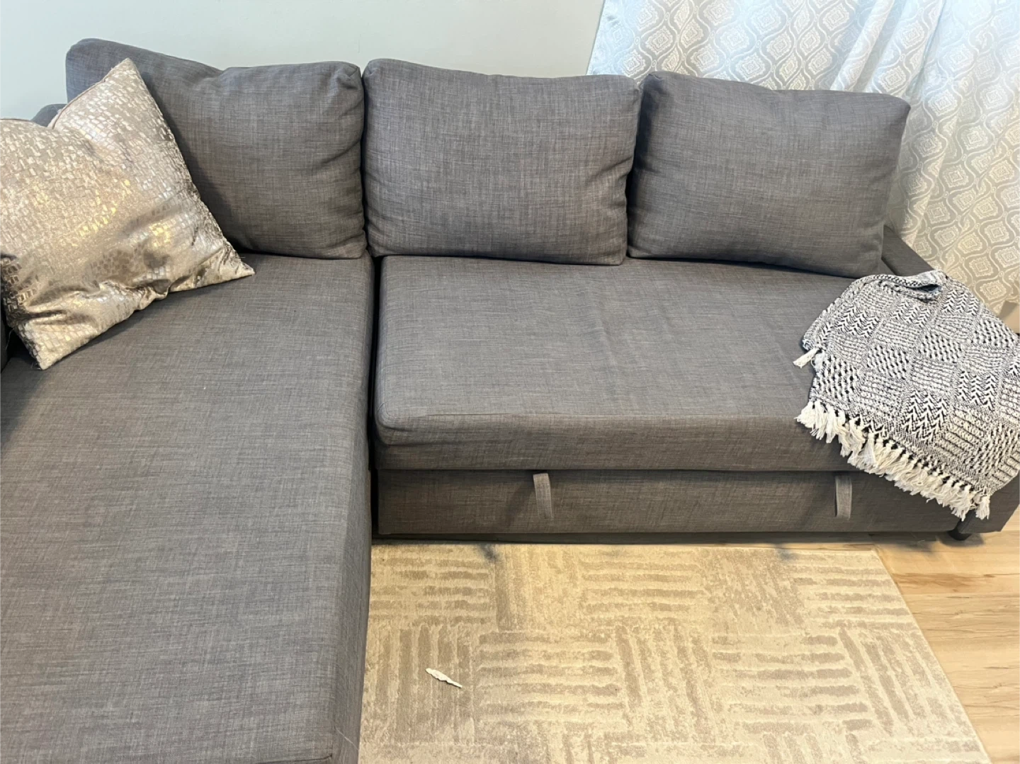 Selling a grey sectional sofa bed with a pull-out mattress and storage underneath the chaise. It's made of durable fabric and comes with decorative throw pillows. Perfect for small spaces and overnight guests!