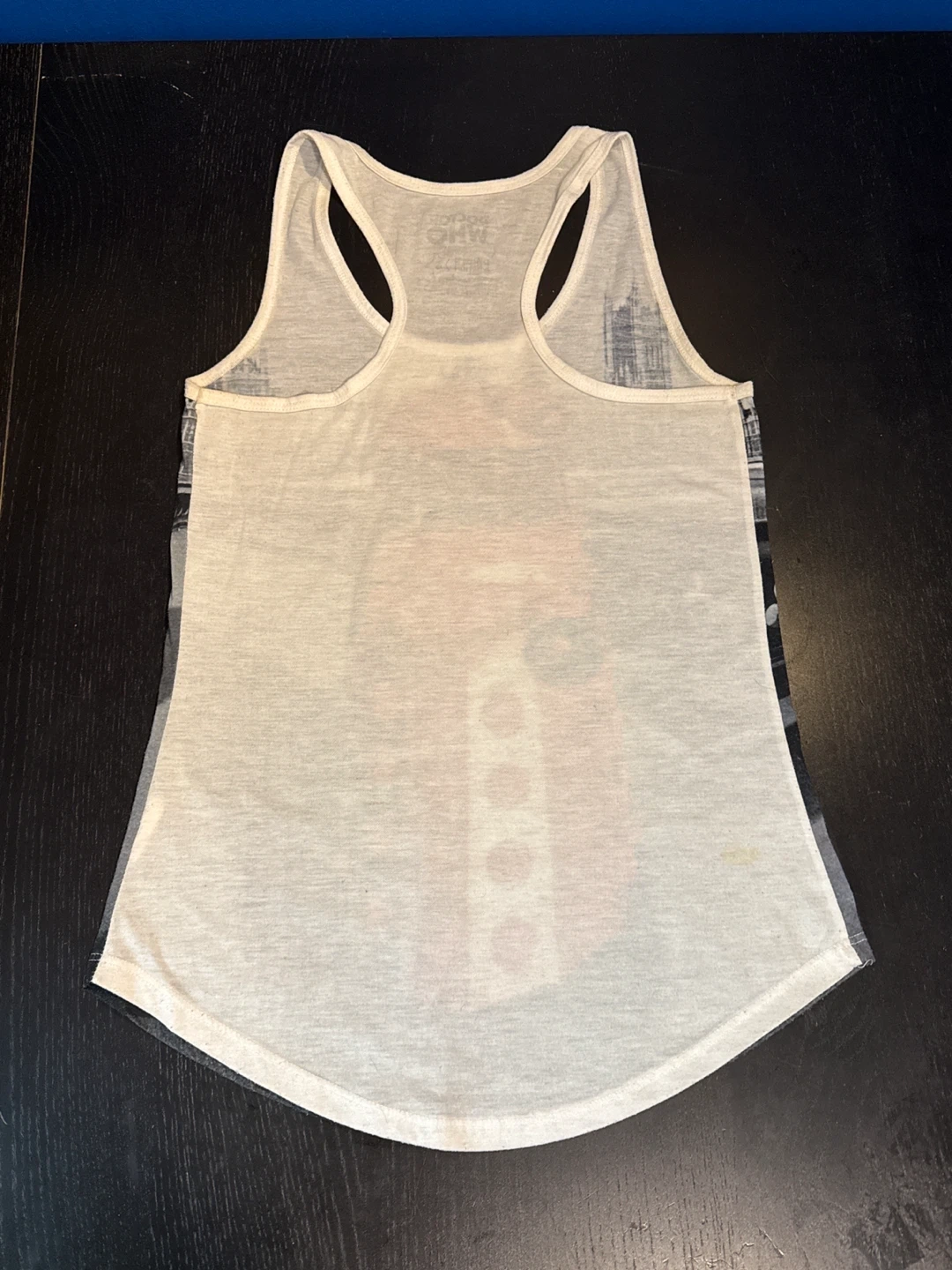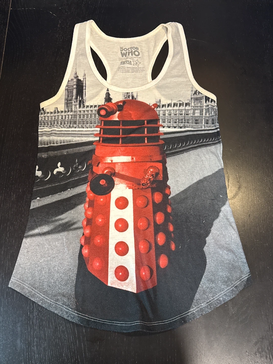 Selling a Doctor Who Dalek tank top. Features a red Dalek design with a London landmark background. Made with a soft fabric blend. Great for fans!