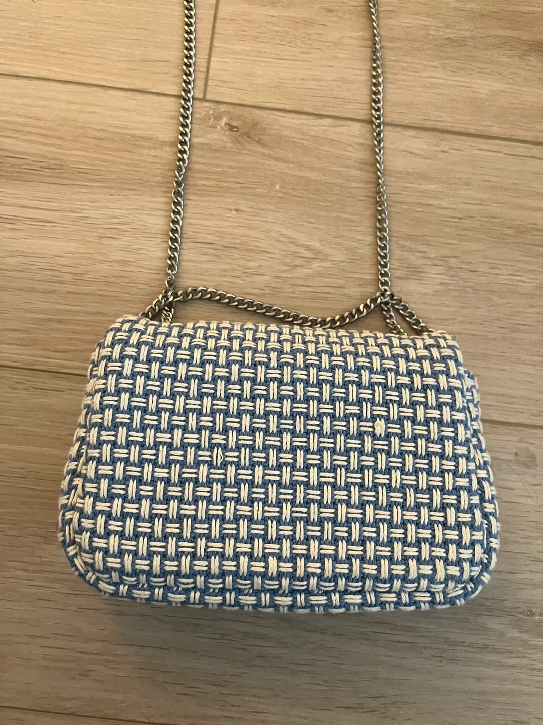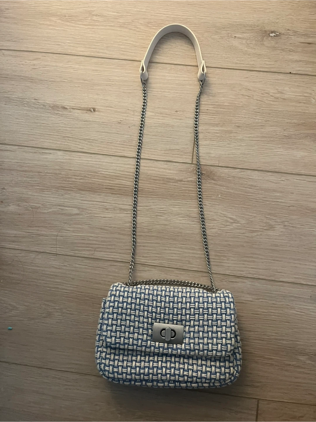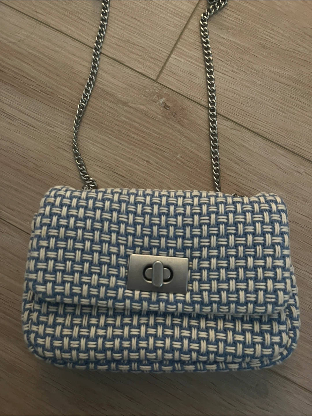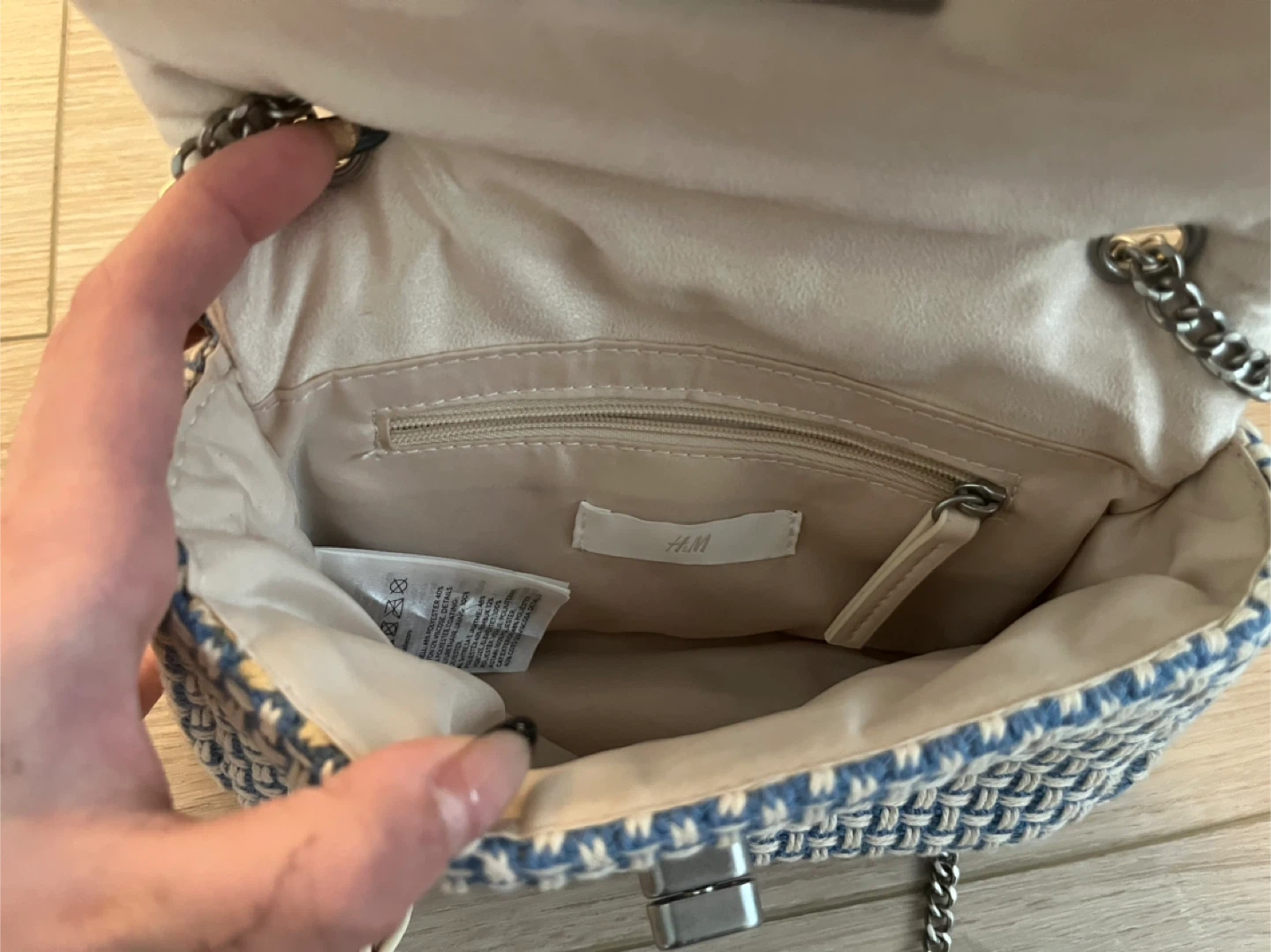 H&M woven shoulder bag in blue and cream. This purse has a stylish chain strap featuring a secure turn lock closure. It's the perfect size for essentials open to offers!