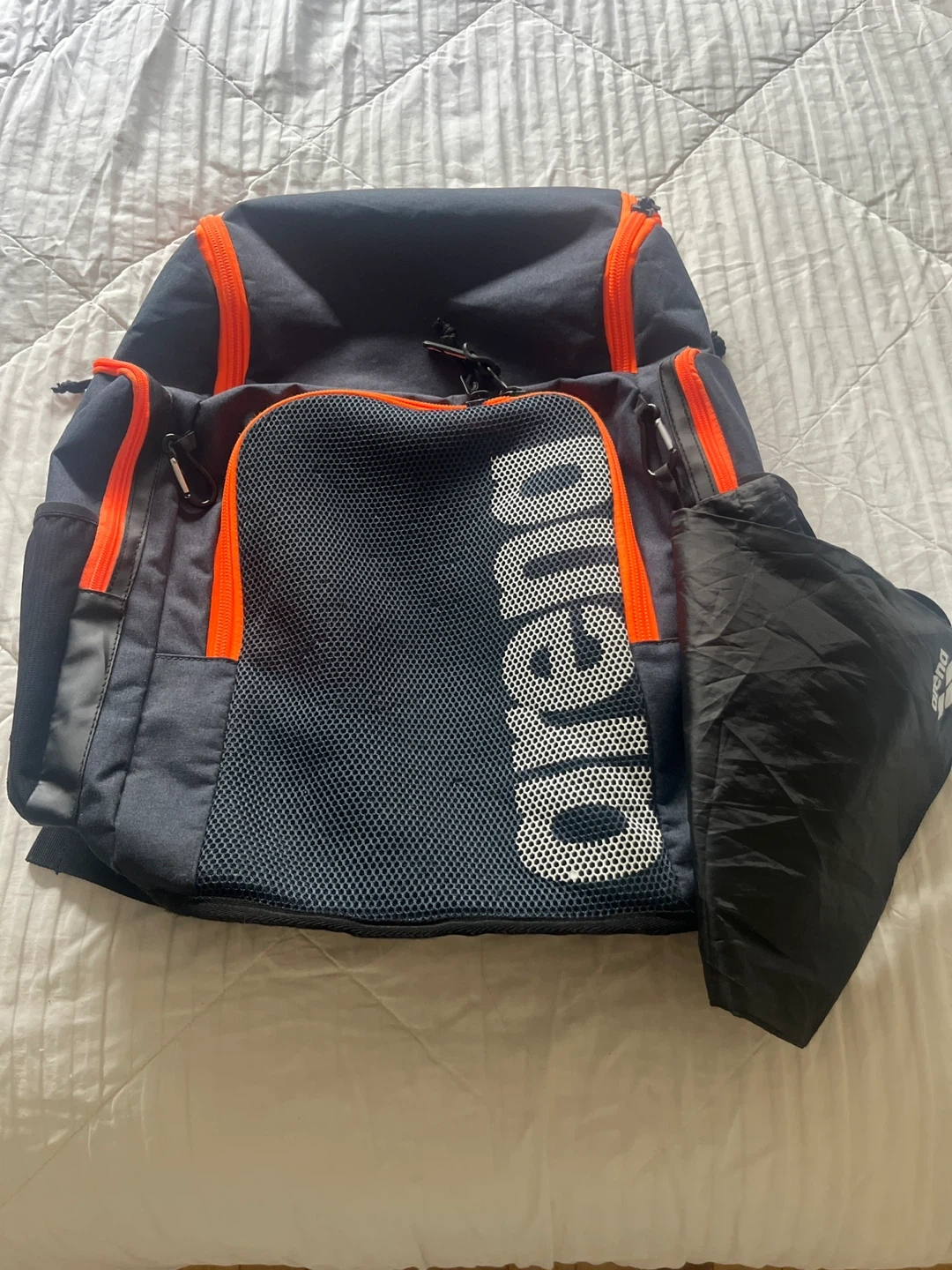 Selling an Arena backpack. It has multiple zippered compartments and mesh pockets. Includes a separate drawstring wet bag. 45L in size. Serious offers only!