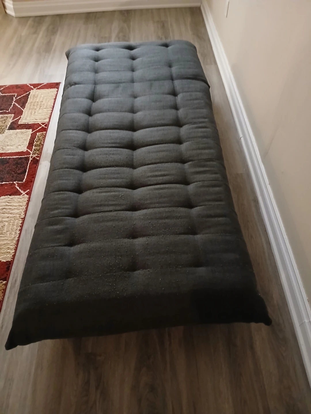 Selling a dark grey tufted daybed or futon that can be used as a couch or a bed. It features a button-tufted design and a firm seating surface. This versatile piece is great for small spaces!