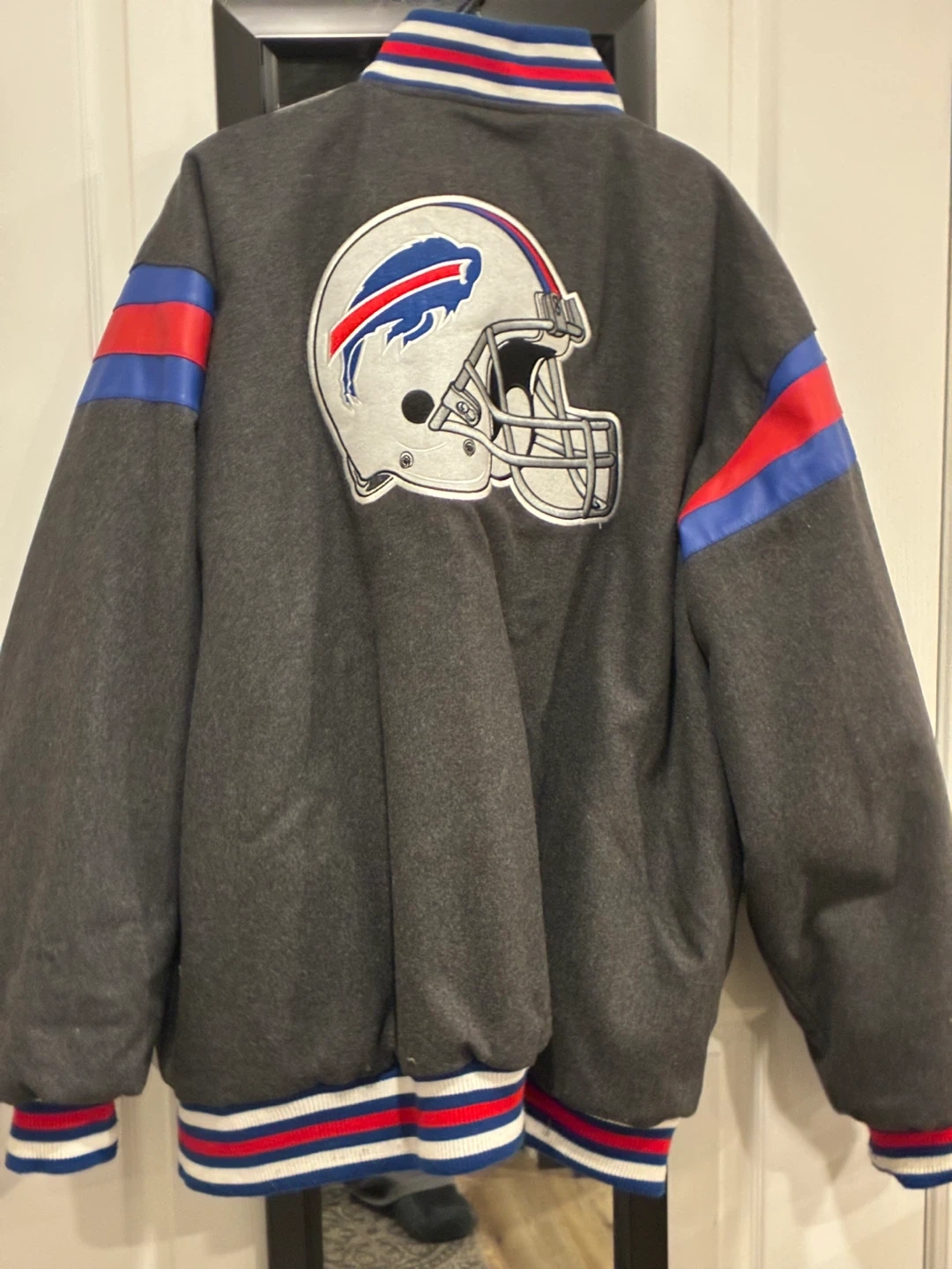 Selling a Buffalo Bills varsity jacket. Features embroidered "BILLS" on the front and a large Buffalo Bills helmet logo on the back. Classic varsity style with striped cuffs and collar. Great for any fan!
