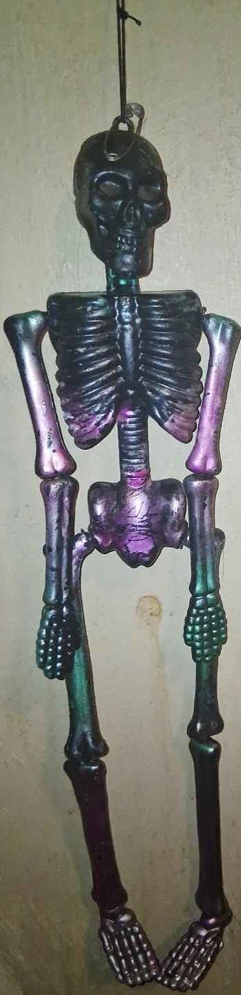 Selling a spooky hanging skeleton decoration. It has a metallic black and purple finish, perfect for Halloween! This prop is sure to add a frightful touch to your decor. Pick up only unless near intersection of Oxford and Gammage Street.