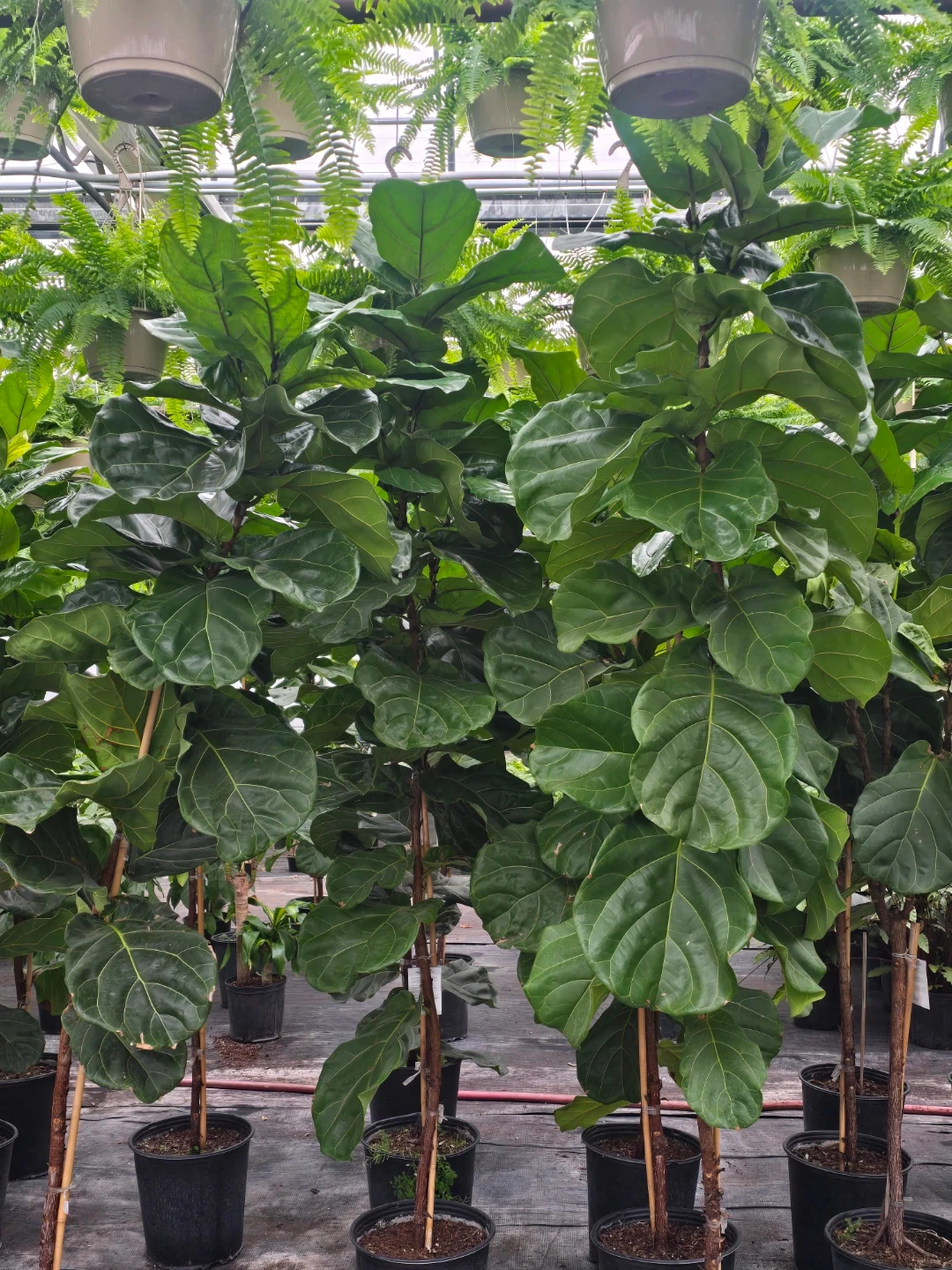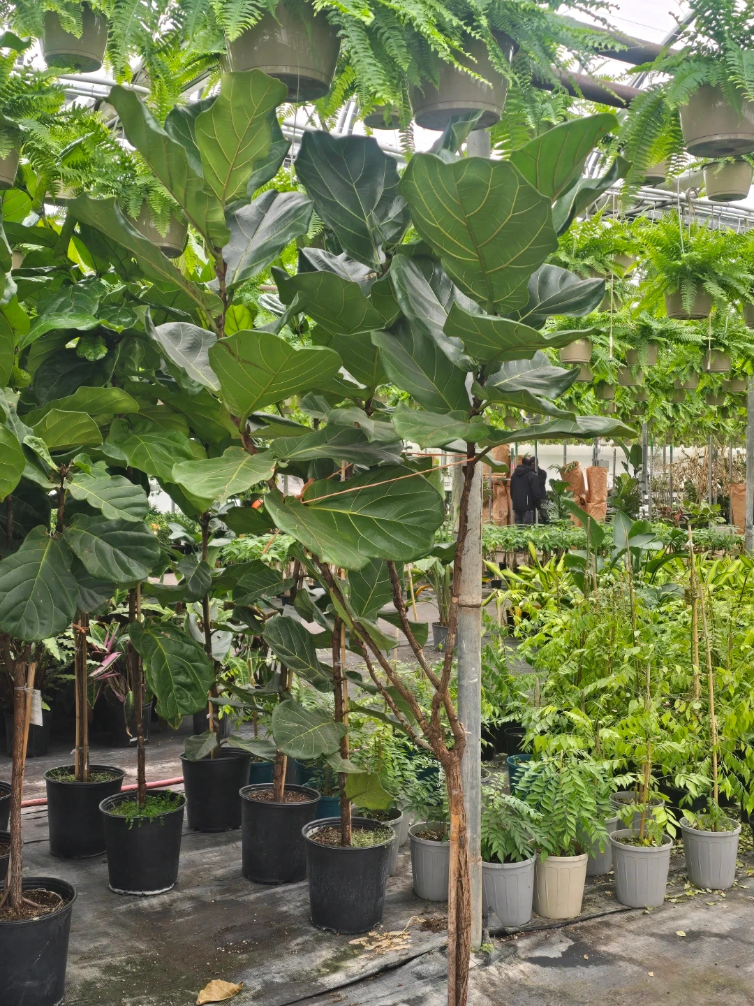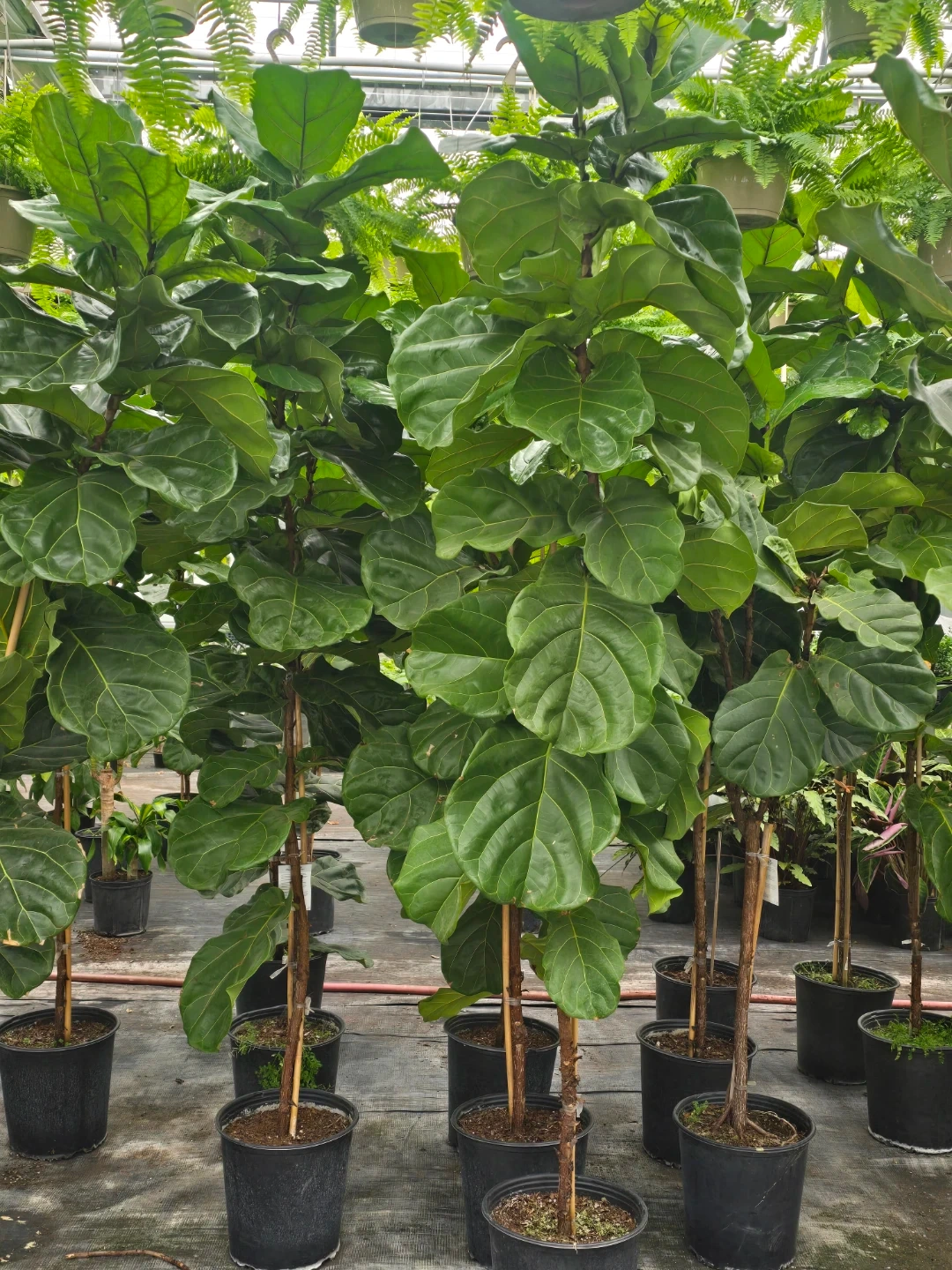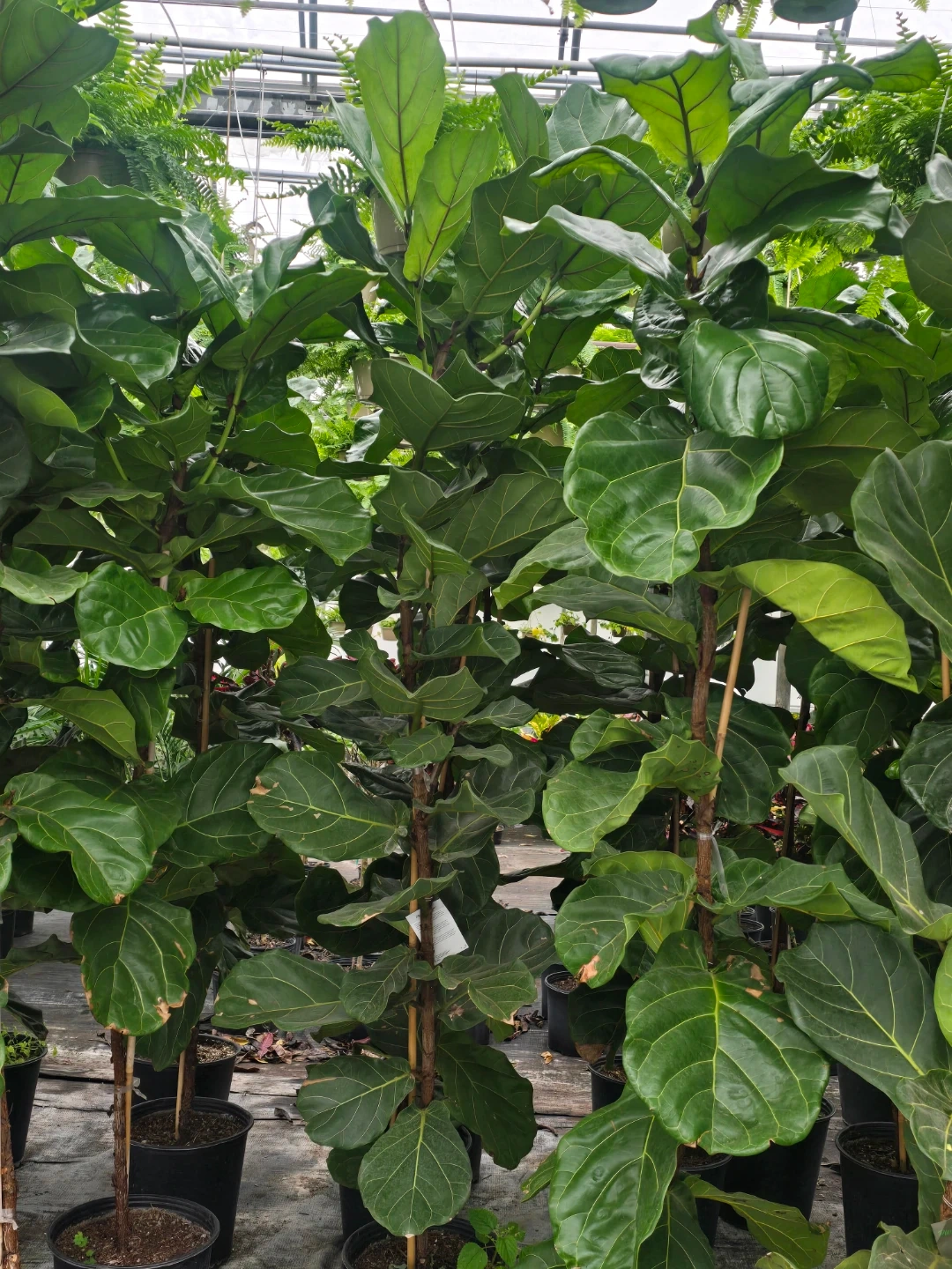 Selling a Fiddle Leaf Fig plant. These are popular indoor trees known for their large, glossy leaves. They thrive in bright, indirect light and prefer consistent watering. This plant comes in a black nursery pot.