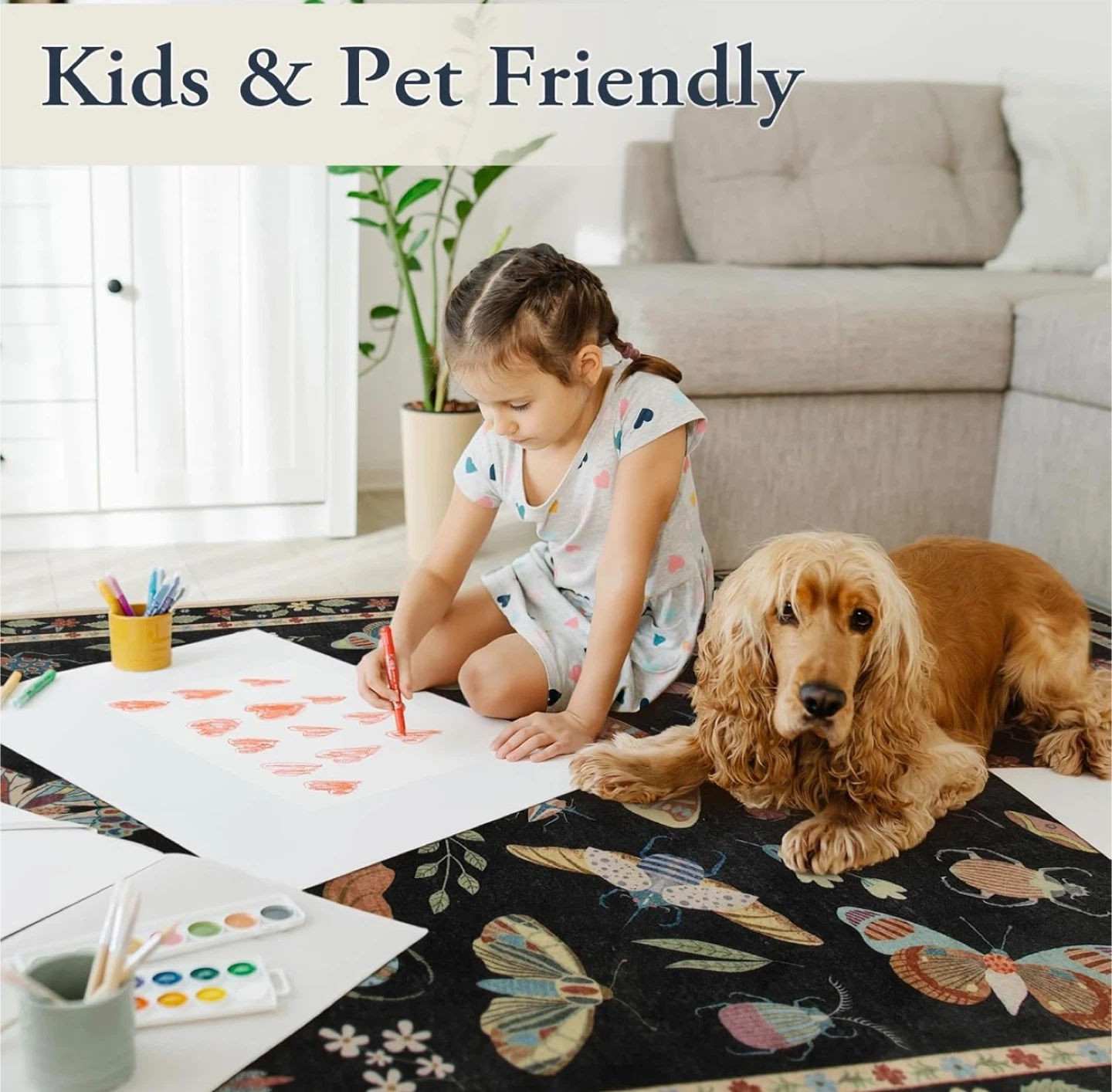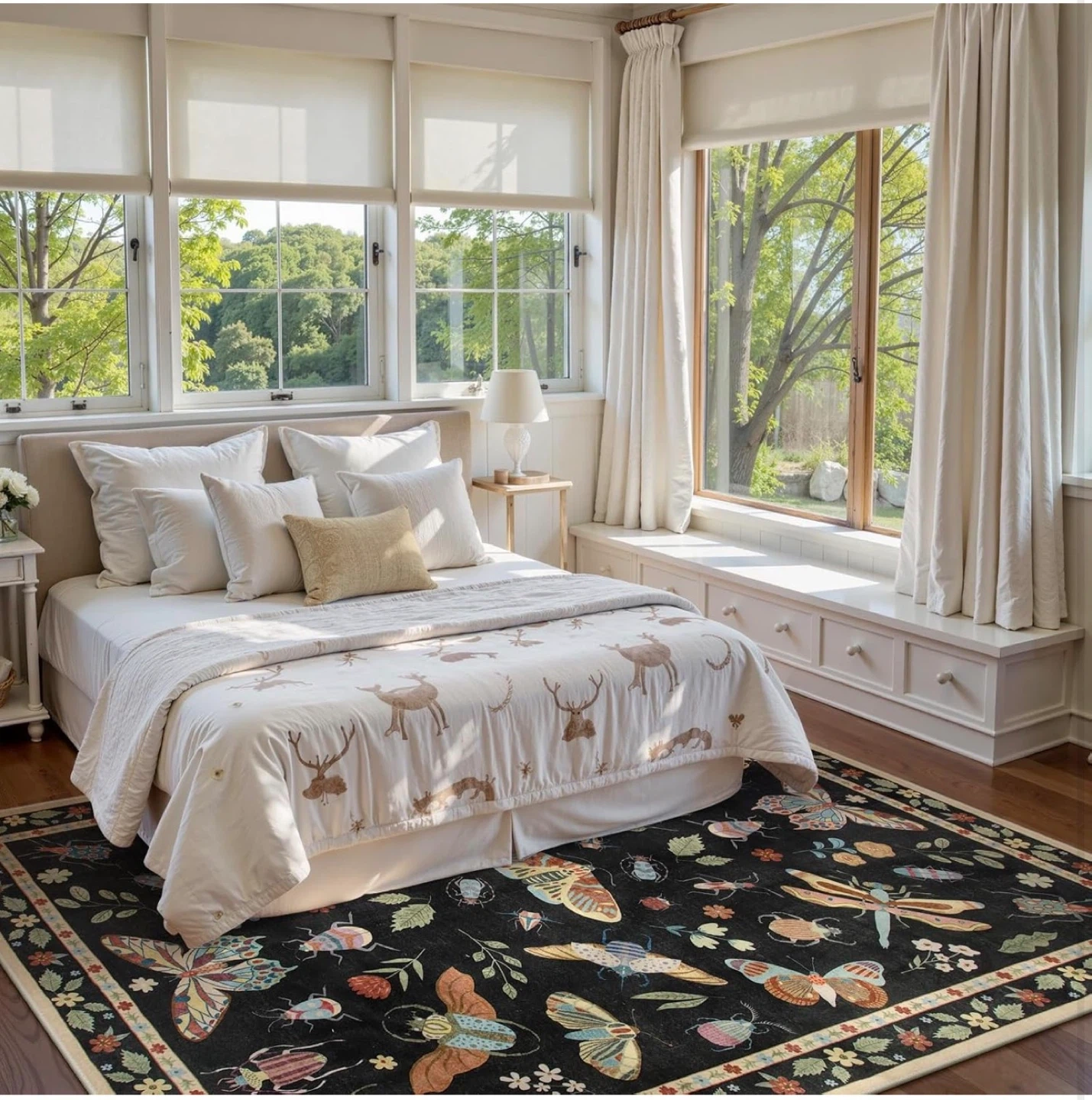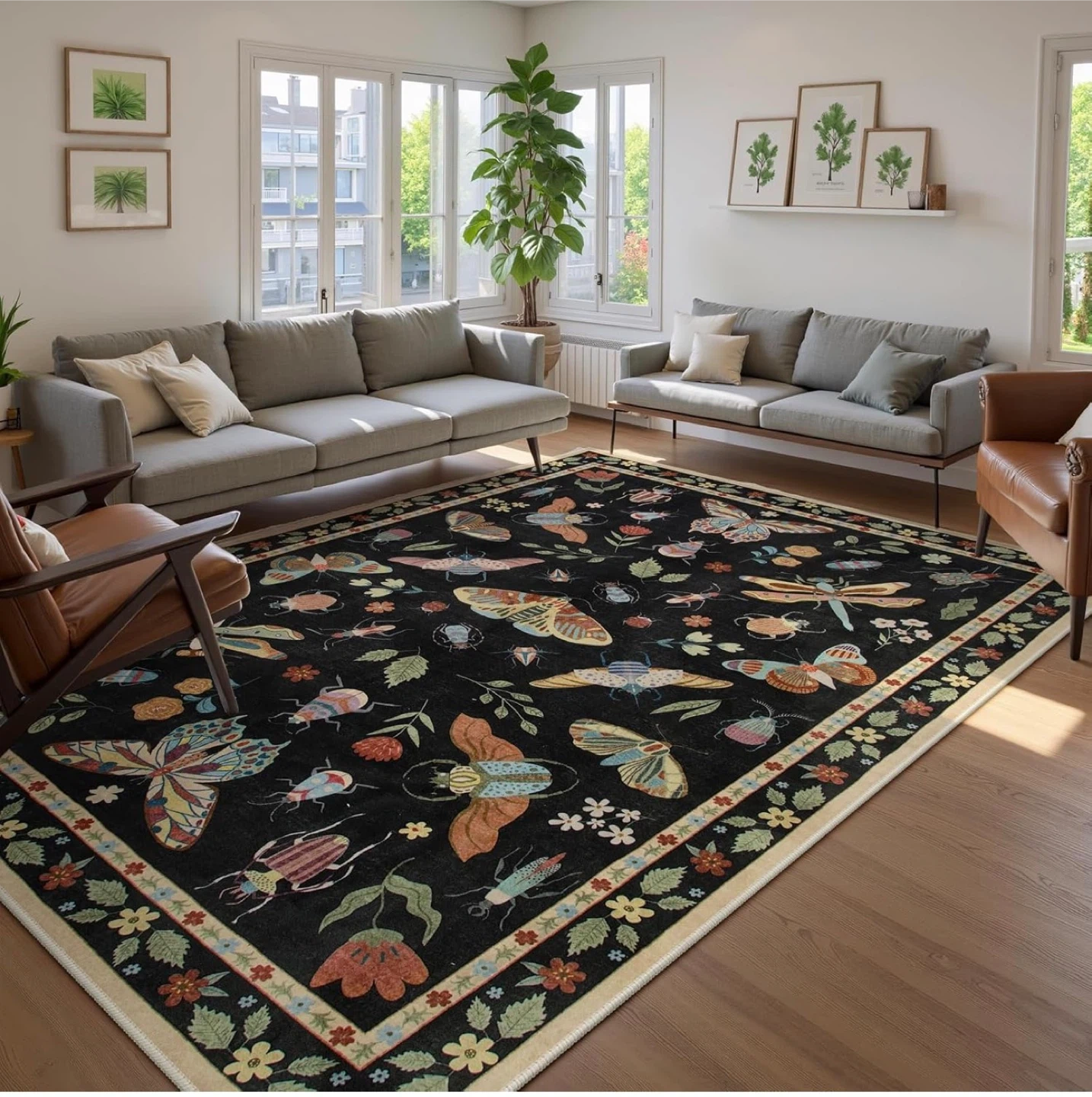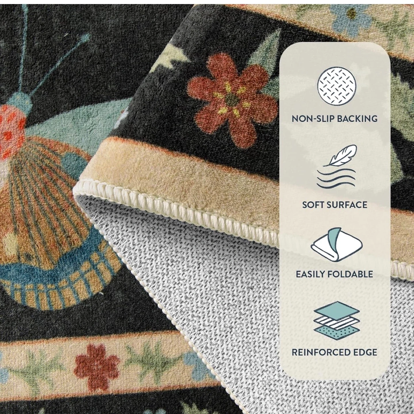 Selling a black area rug featuring a vibrant pattern of butterflies, dragonflies, beetles, and flowers. This rug has a soft surface and non-slip backing. It's easily foldable for storage and has a reinforced edge. Perfect for adding a unique touch to any room!