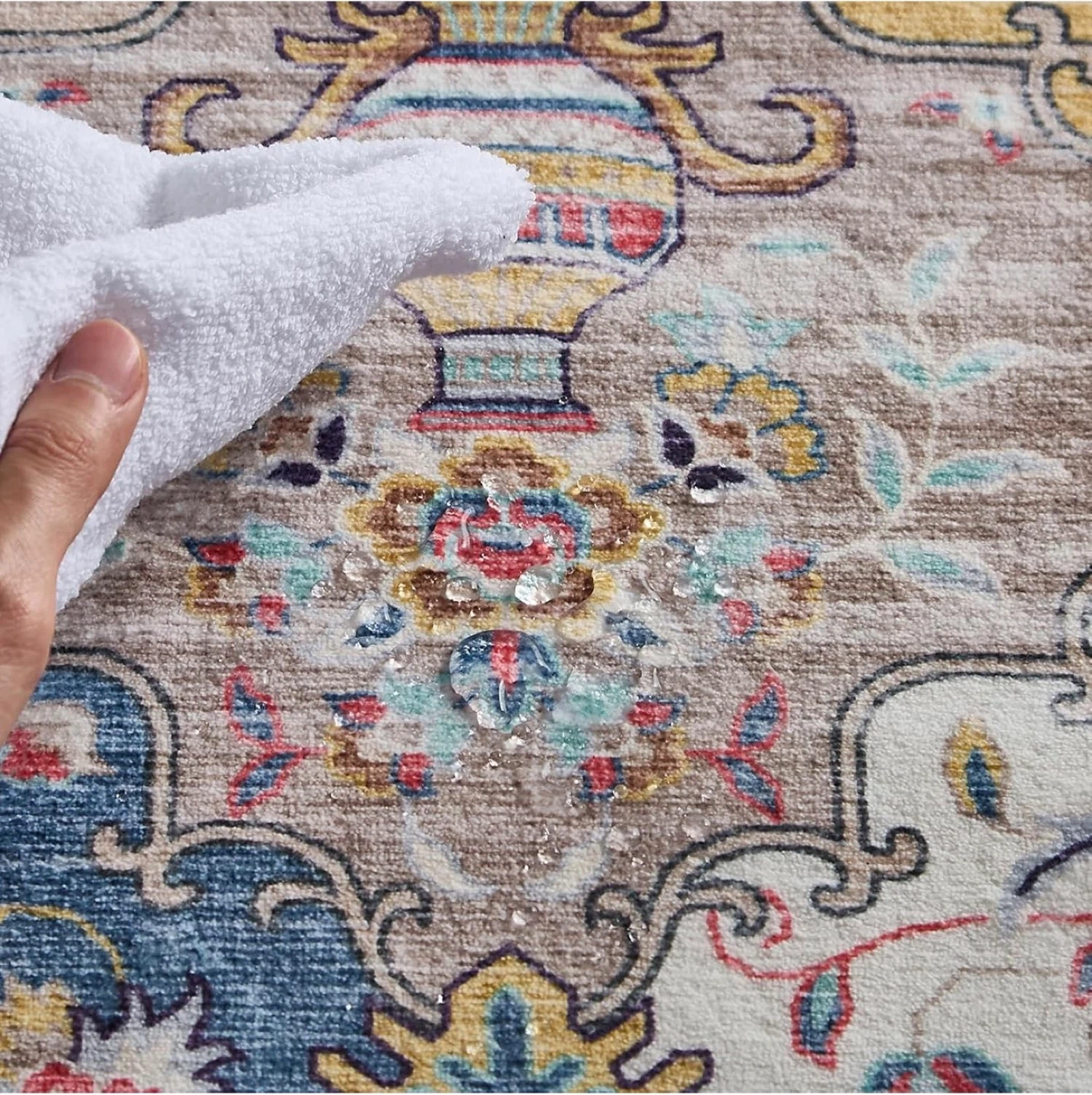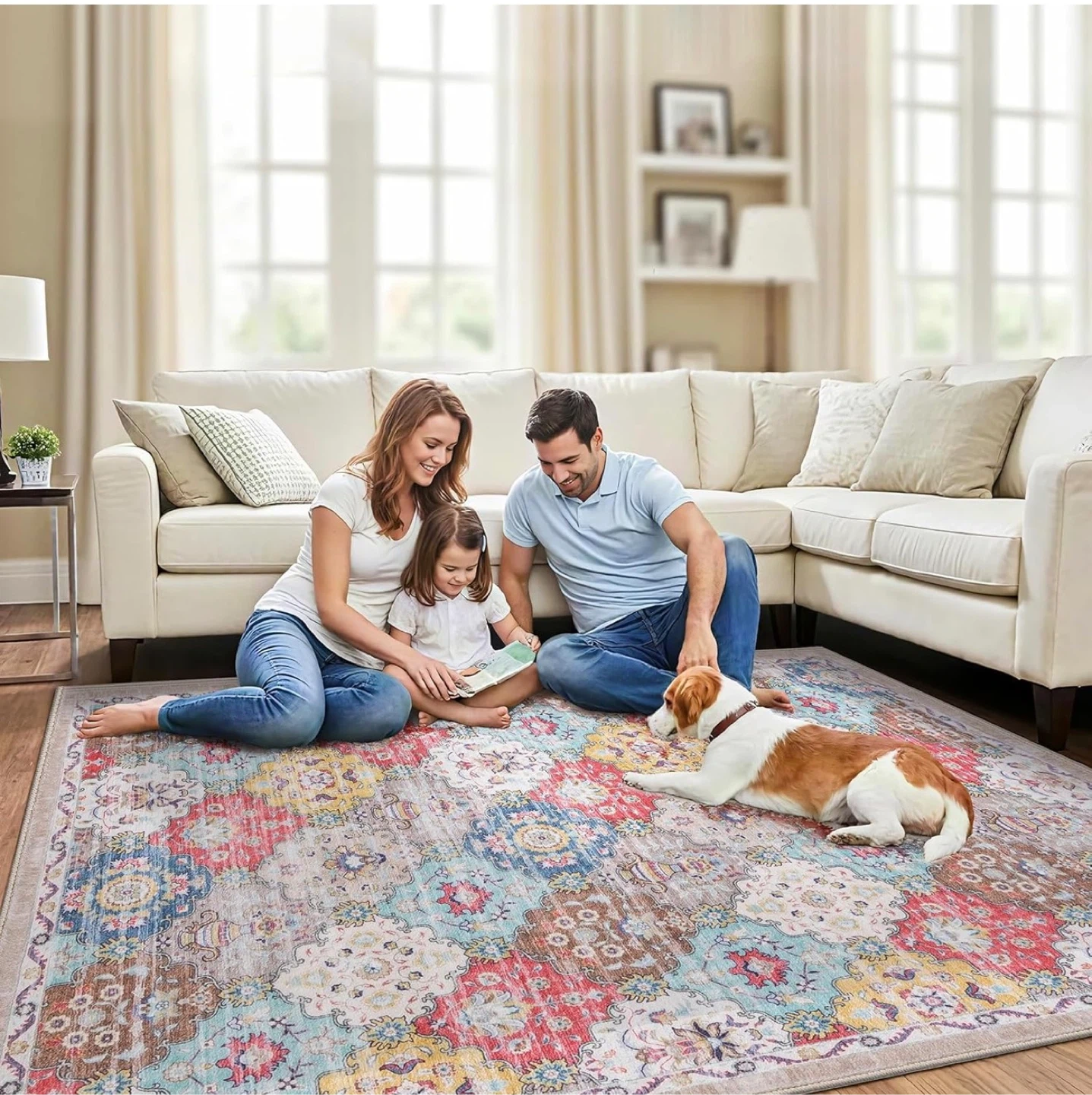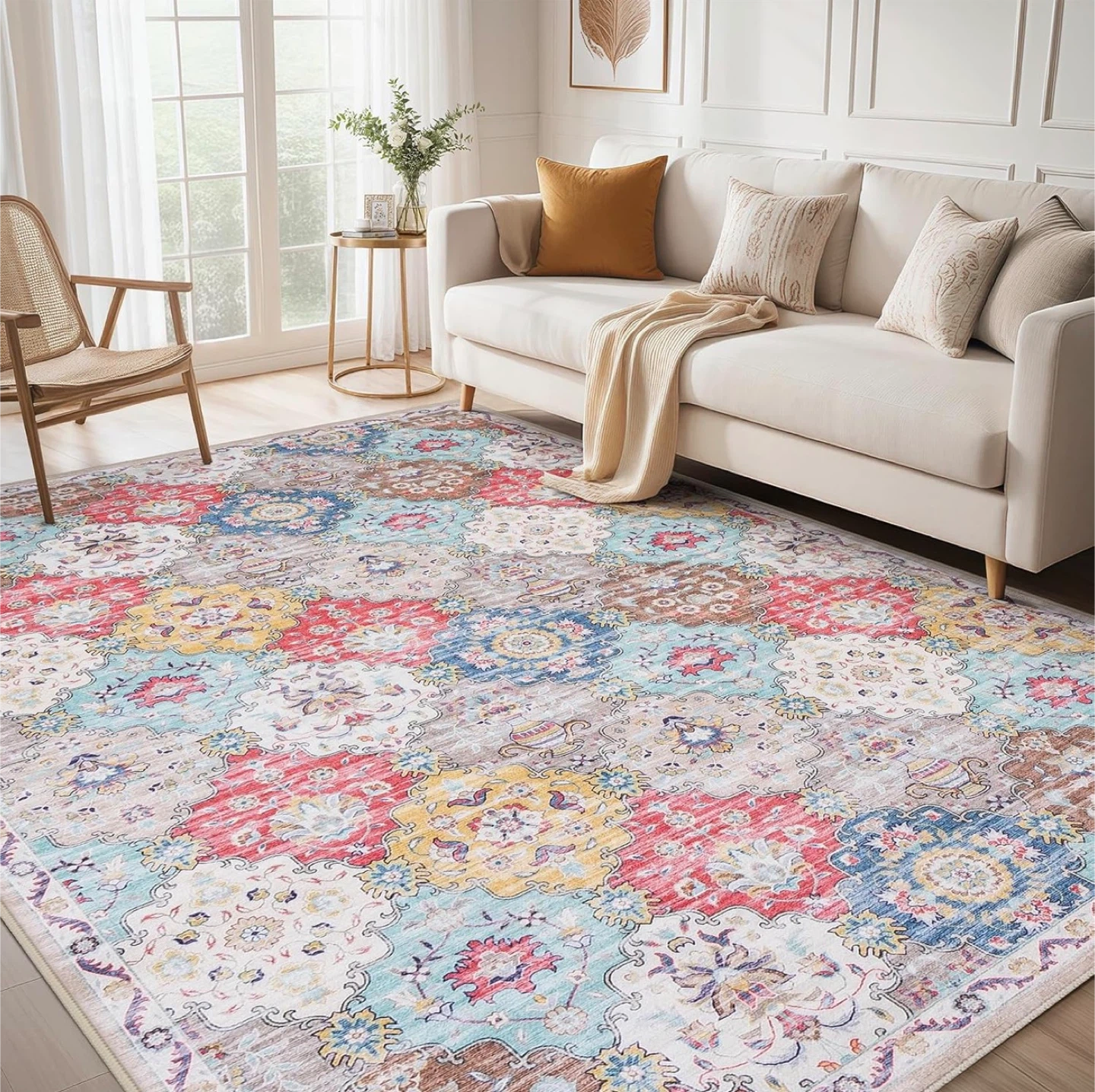 Selling a beautiful vintage-style area rug. This rug features a soft surface, water-repellent material, reinforced edges, and a non-slip backing for safety. Adds a cozy touch to any room!