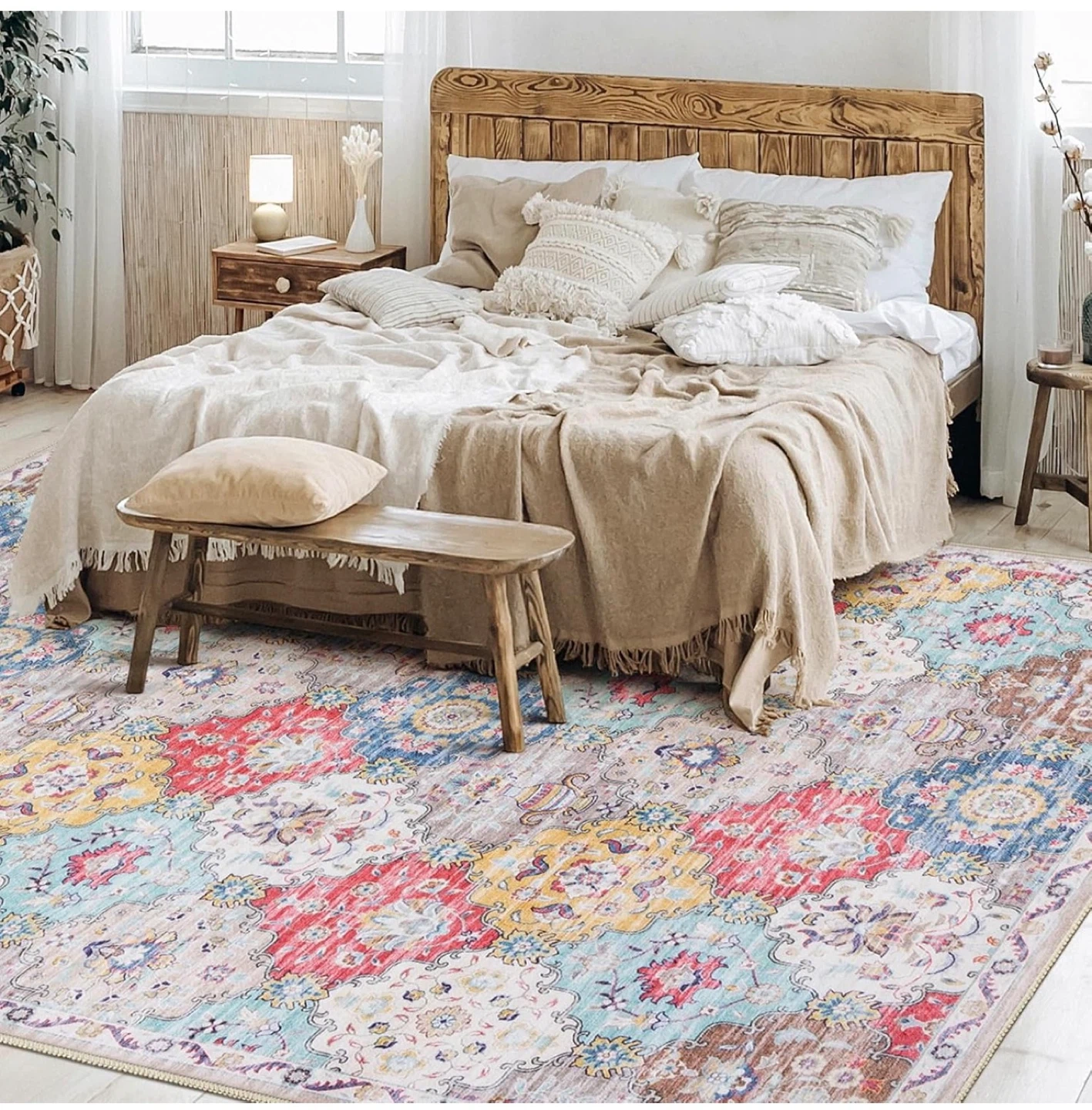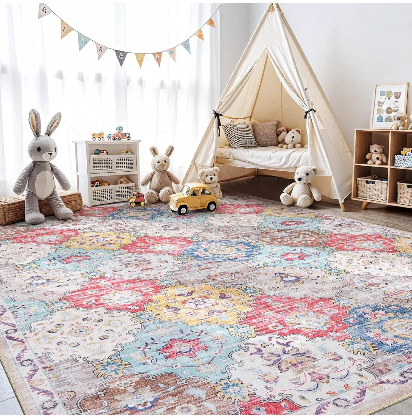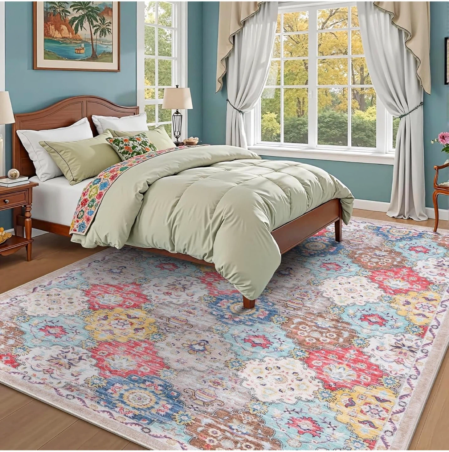 Selling a beautiful vintage-style area rug. This rug features a soft surface, water-repellent material, reinforced edges, and a non-slip backing for safety. Adds a cozy touch to any room!