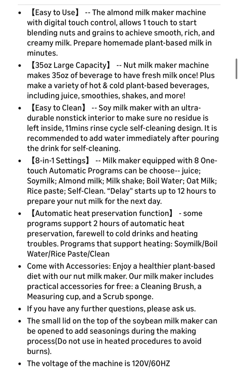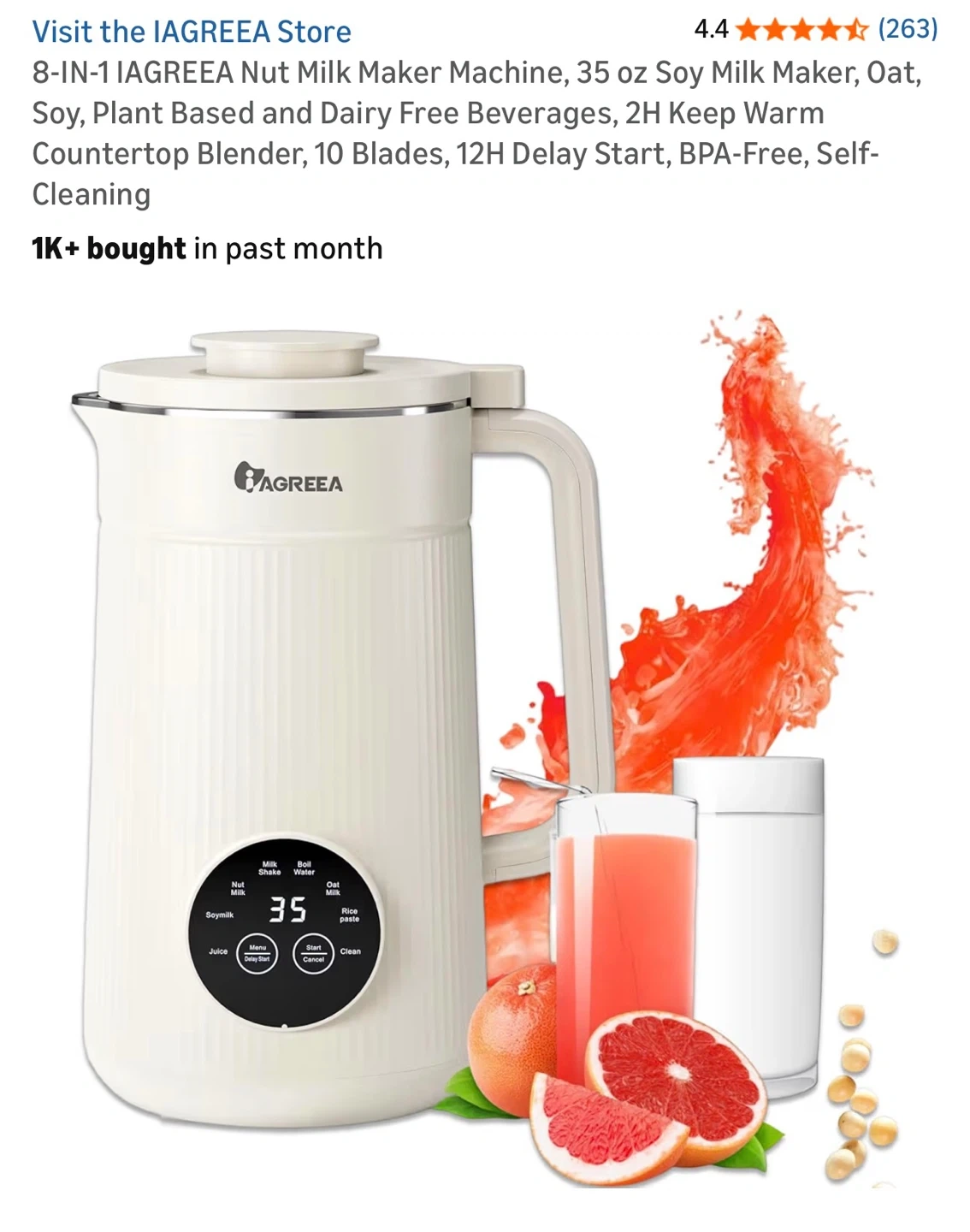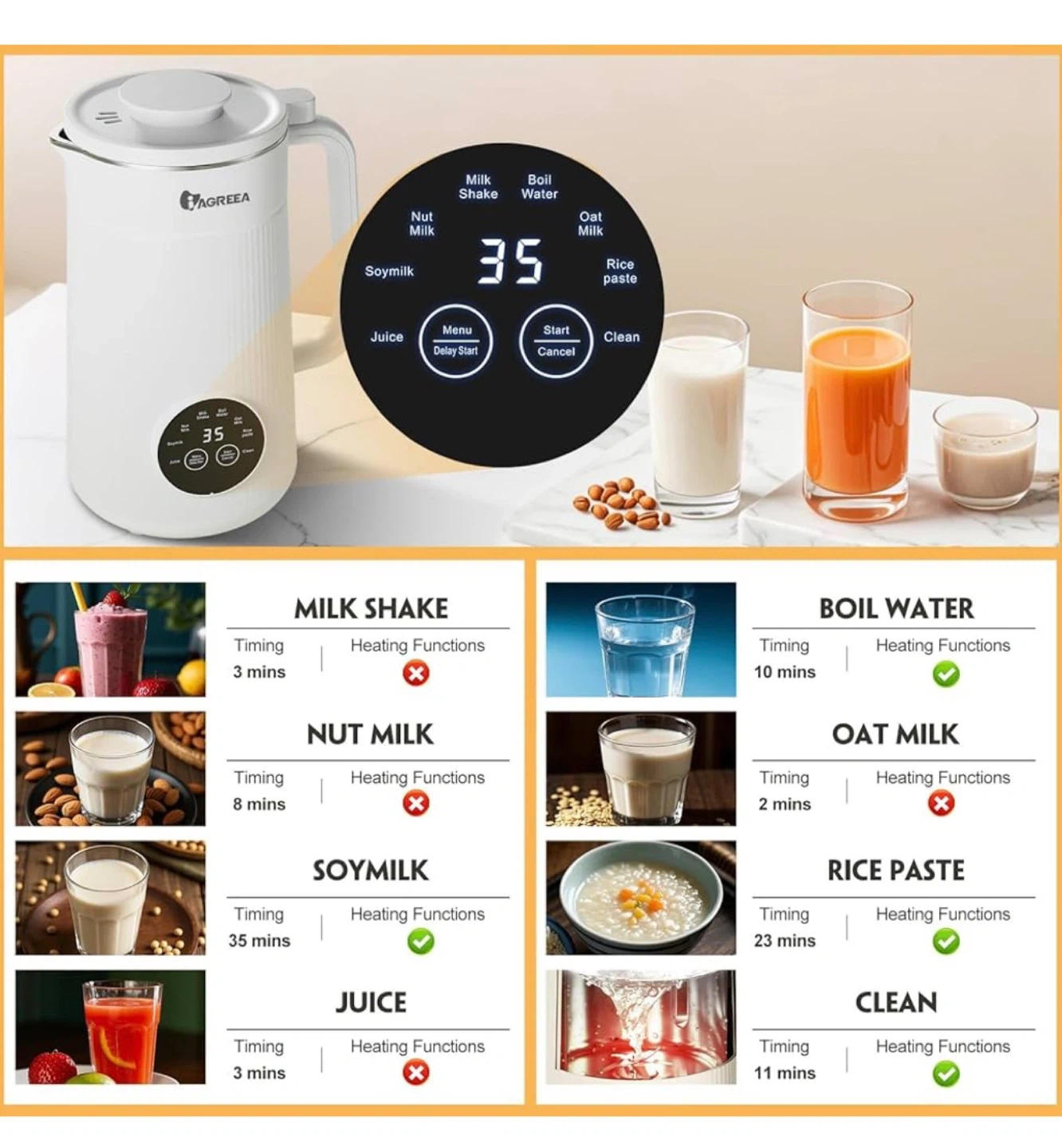 Selling an AGREEA SoyMilk Maker, model HB-B10KW1. It features a 304 stainless steel cup body and a 10 steel knife combination. This appliance offers multiple functions including soymilk, nut milk, juice, and rice paste. Great for fresh beverages!