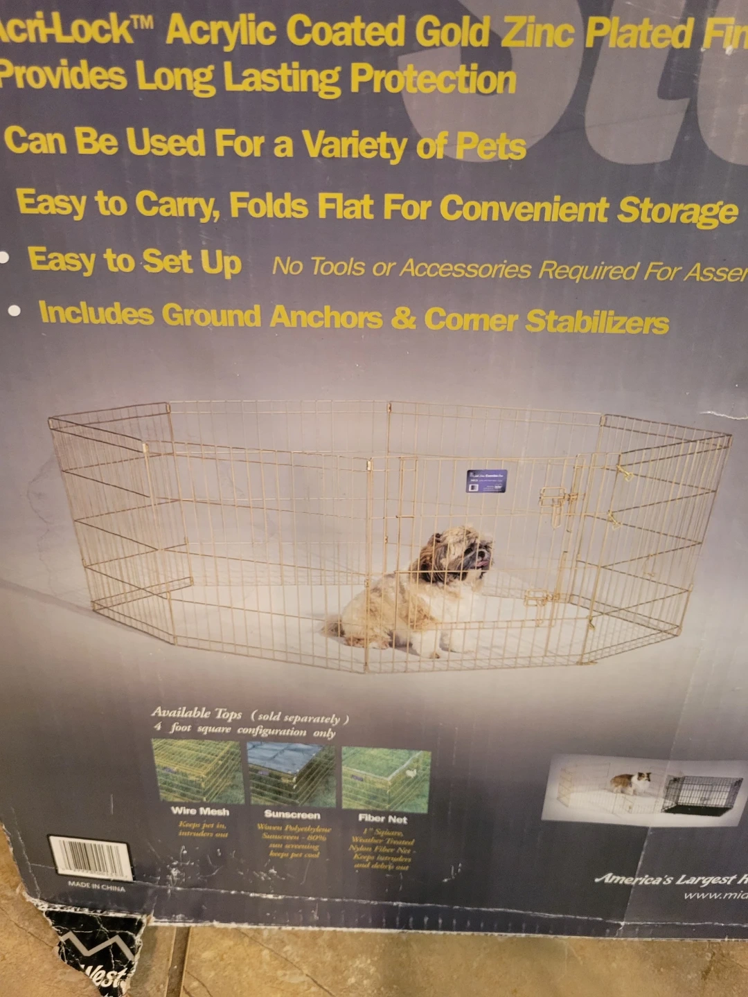 Selling a MidWest Gold Zinc Exercise Pen with 8 panels, each measuring 24" W x 24" H. This pen features a secure double latch step-through door and an acrylic coated gold zinc plated finish for durability. It folds flat for convenient storage and sets up easily with no tools required. Includes ground anchors and corner stabilizers. It's perfect for a variety of pets!