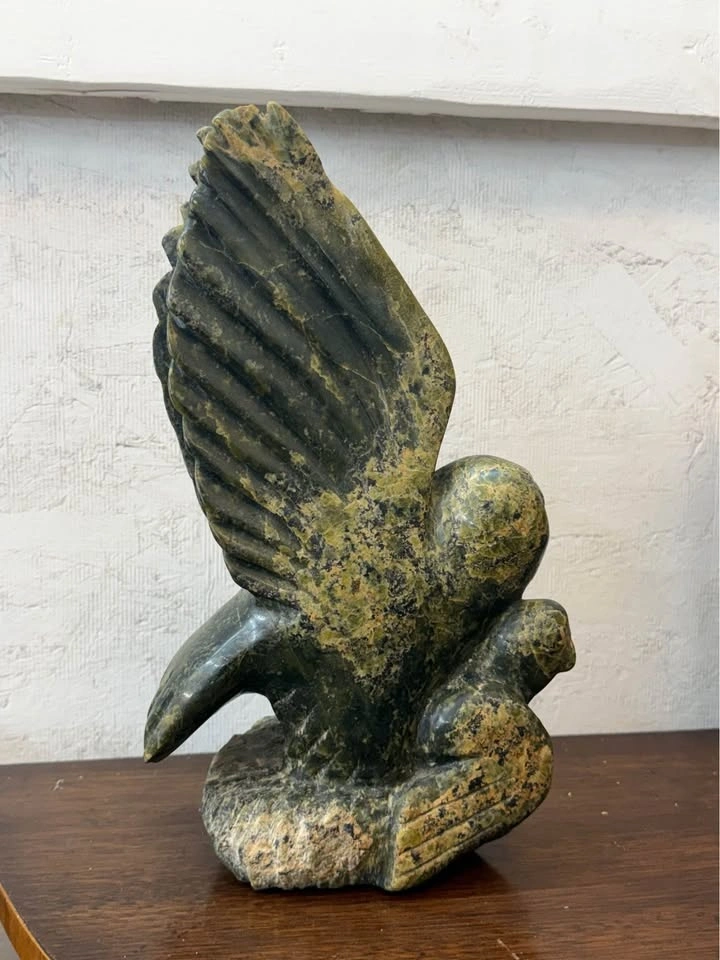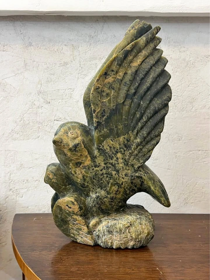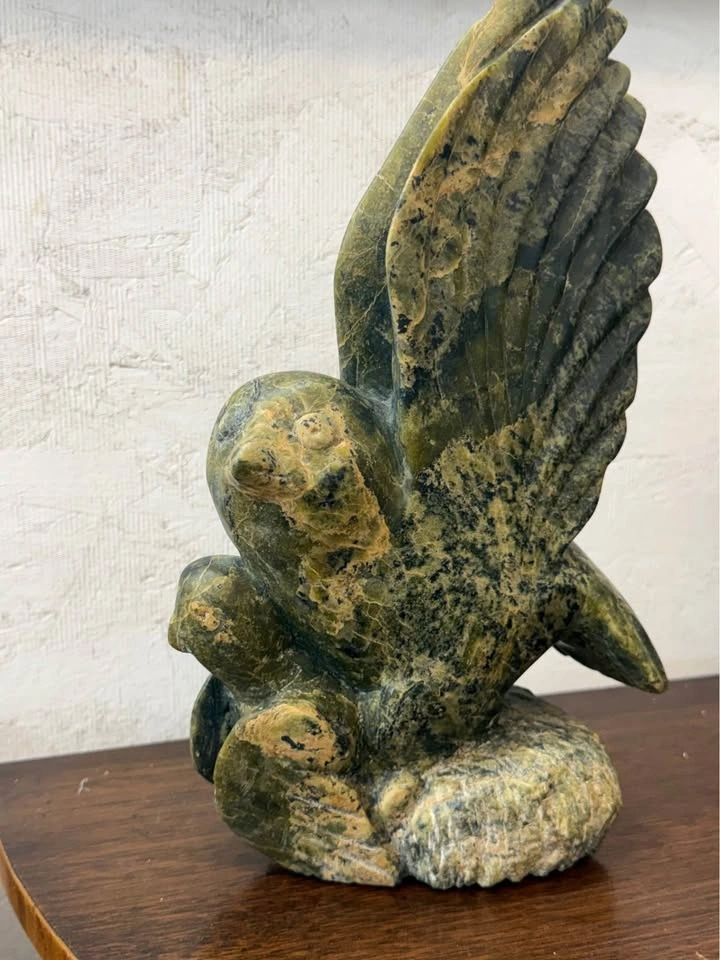This is an Inuit bird sculpture carved from dark green serpentine stone. It depicts a bird, possibly an eagle or owl, with wings raised.