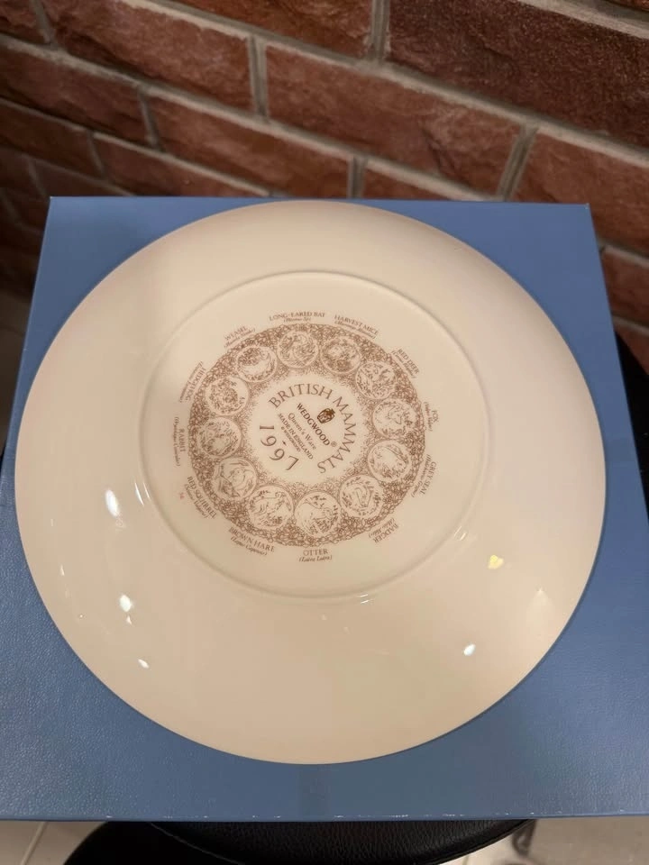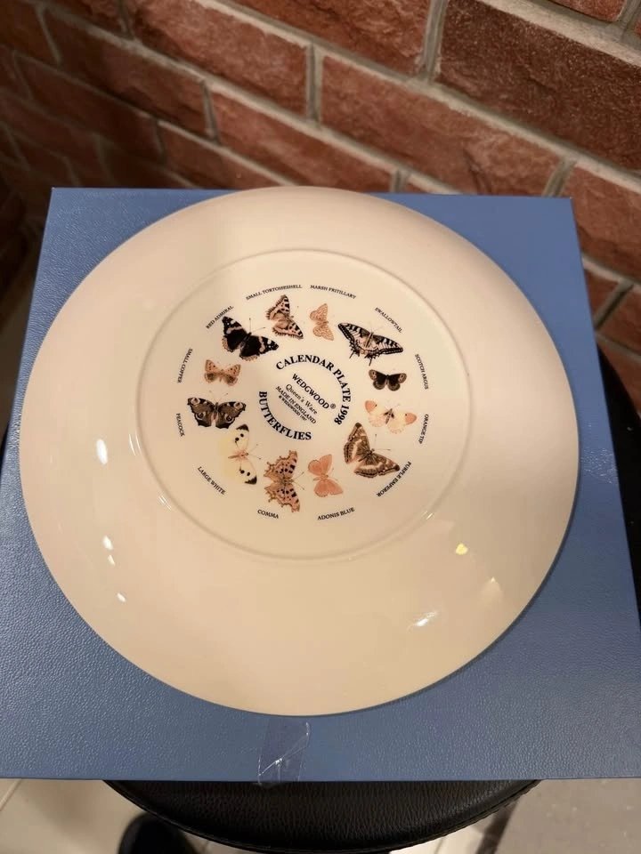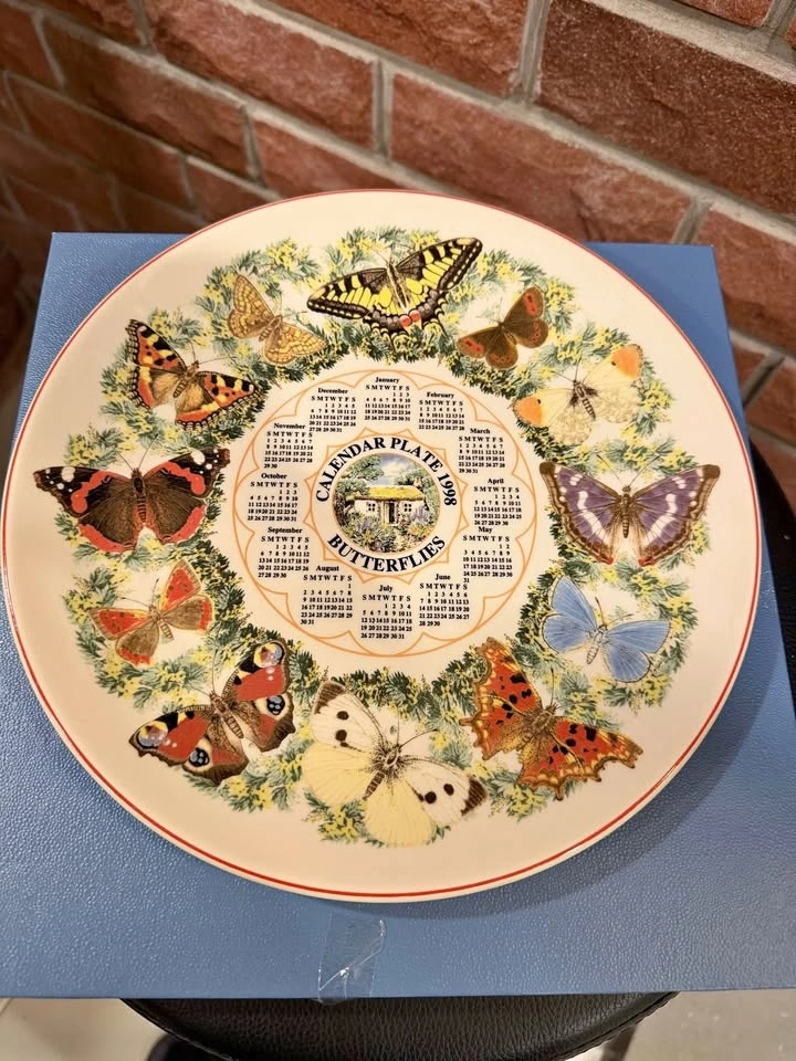 One Wedgwood 1998 "Butterflies" Calendar Plate, made from high-quality porcelain with a multicoloured butterfly design. Approximately 10 inches in diameter. One vintage decorative plate made of Staffordshire bone china with illustrations of British mammals around the border and a calendar for 1997 in the center. Approximately 10.25 inches (26 cm) in diameter.
