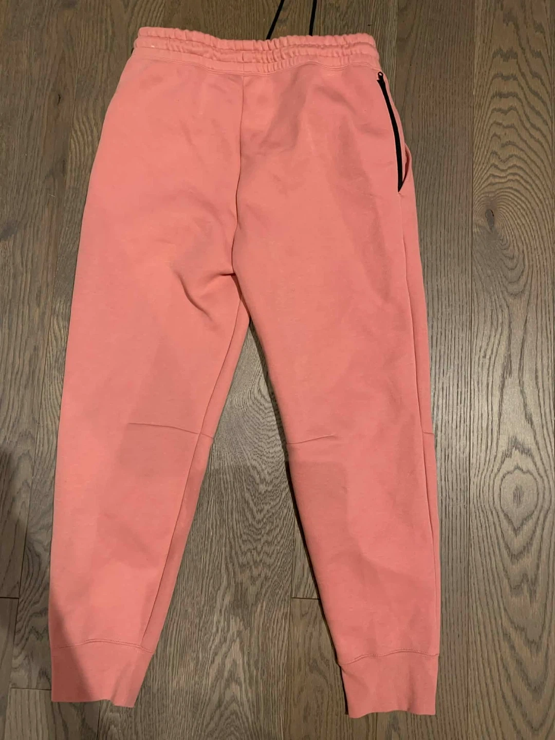 Selling Nike Tech Fleece joggers in a soft pink colour. They are a size medium and feature a drawstring waist and zippered pockets. These comfy pants are perfect for everyday wear!