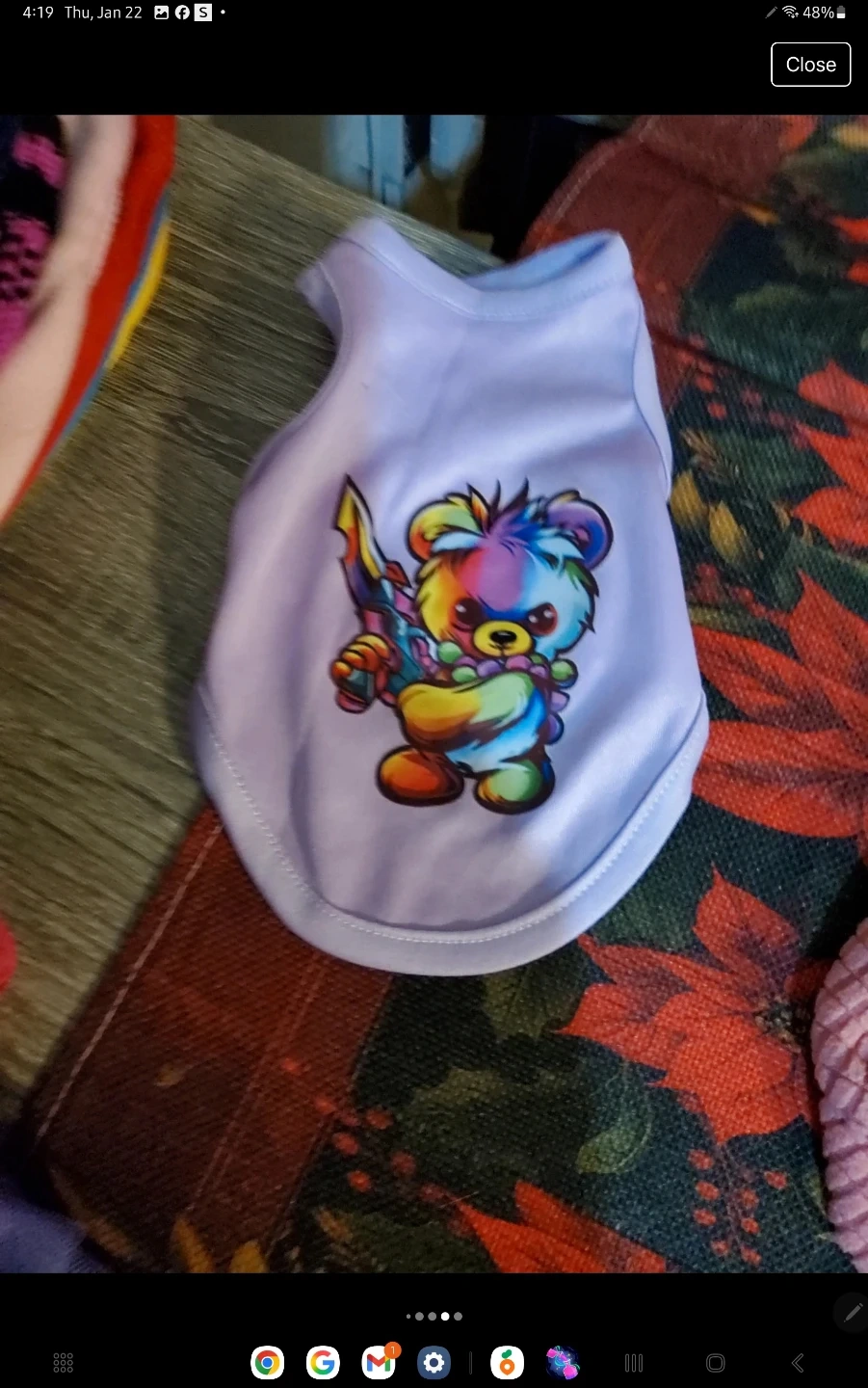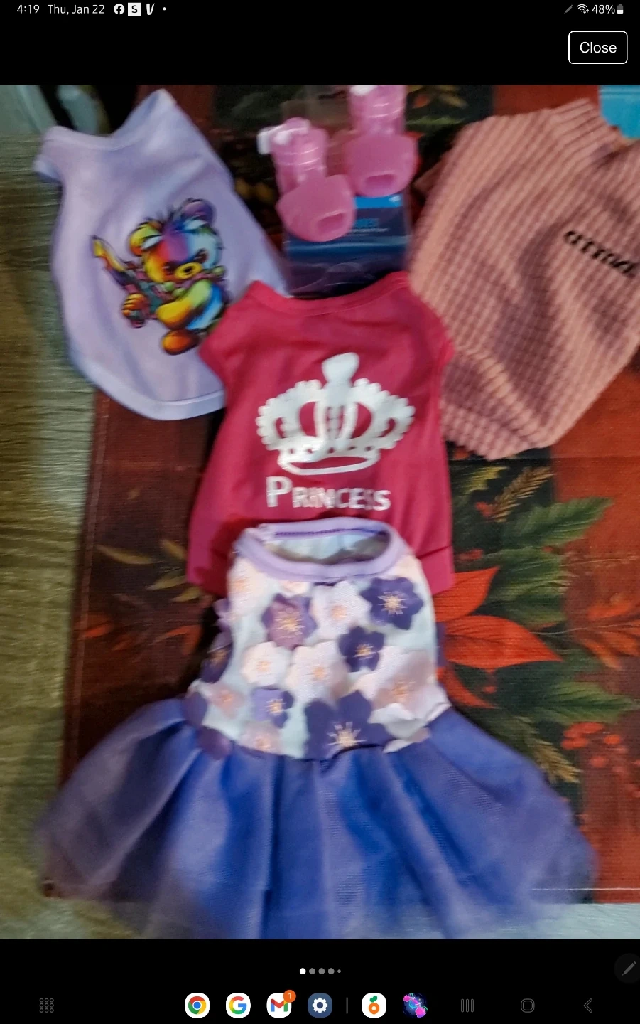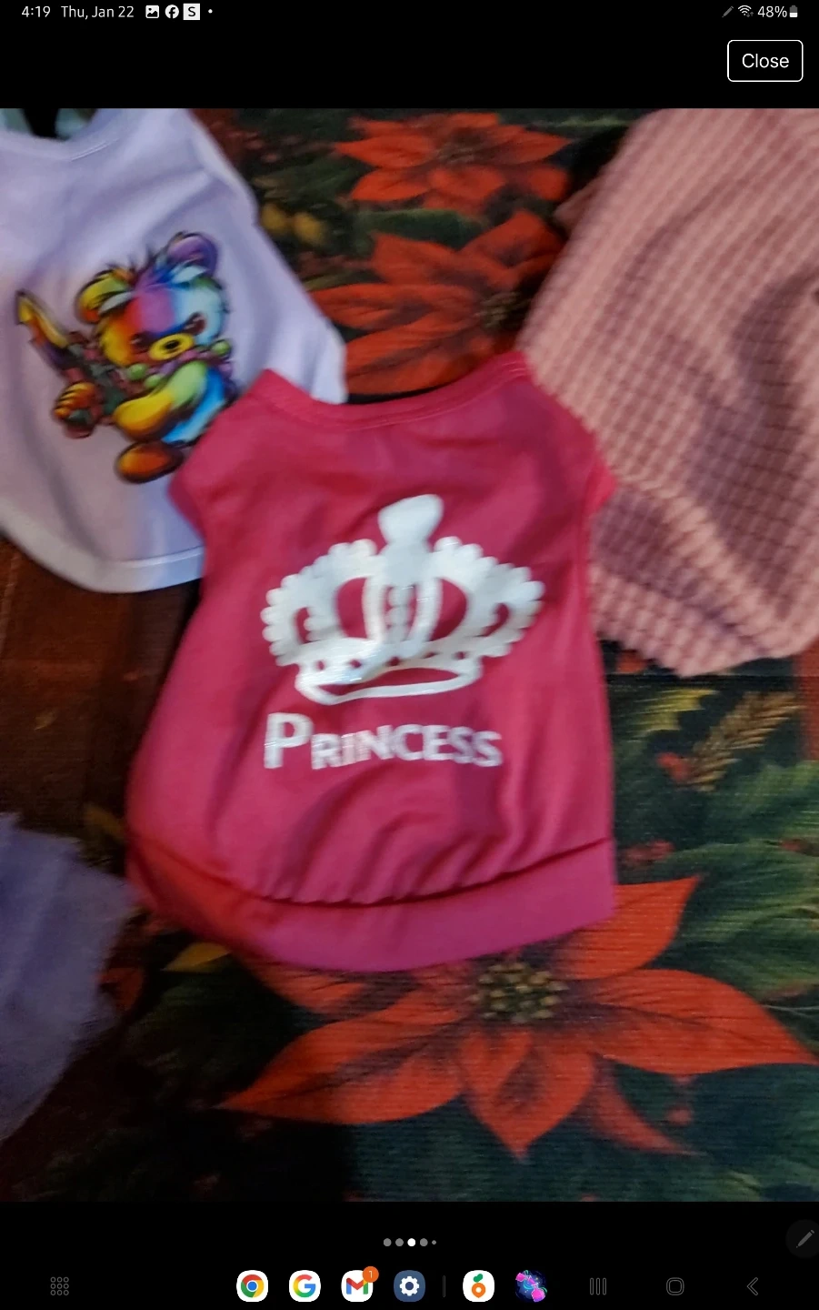 Selling a lot of three pet outfits. Includes a pink "Princess" shirt with a crown design, a lavender shirt with a colorful bear graphic, and a textured pink sweater with "arma" embroidered on it. Perfect for your furry friend! SIZE (XS)