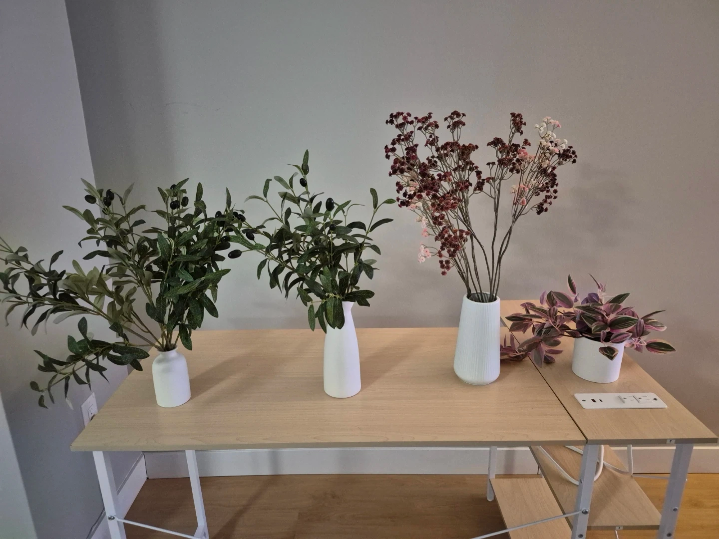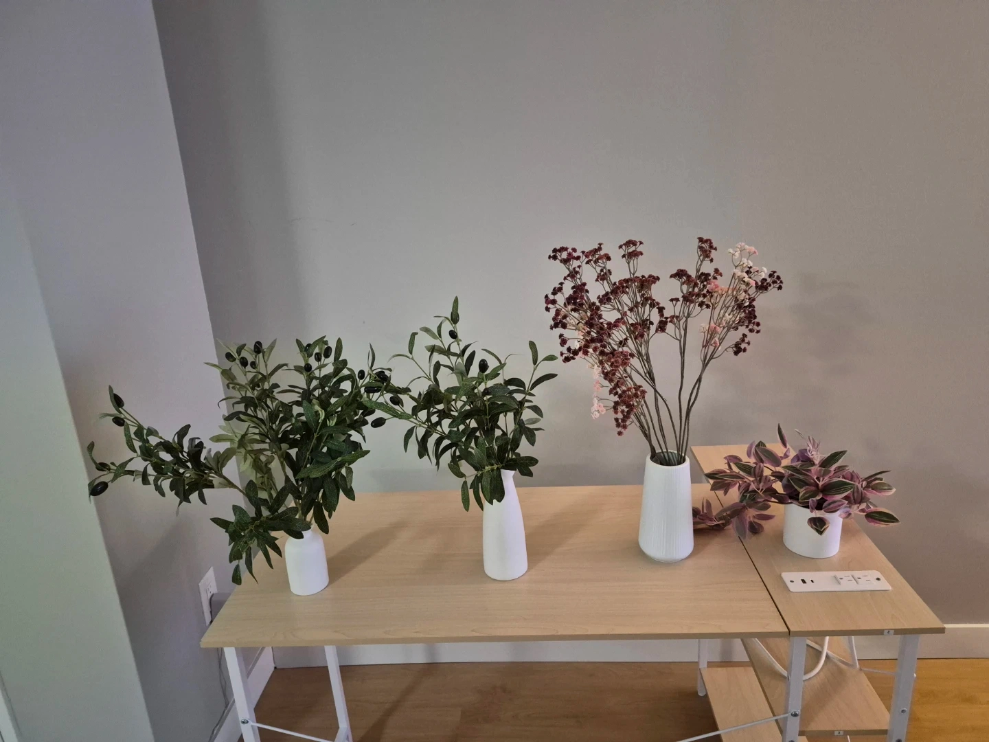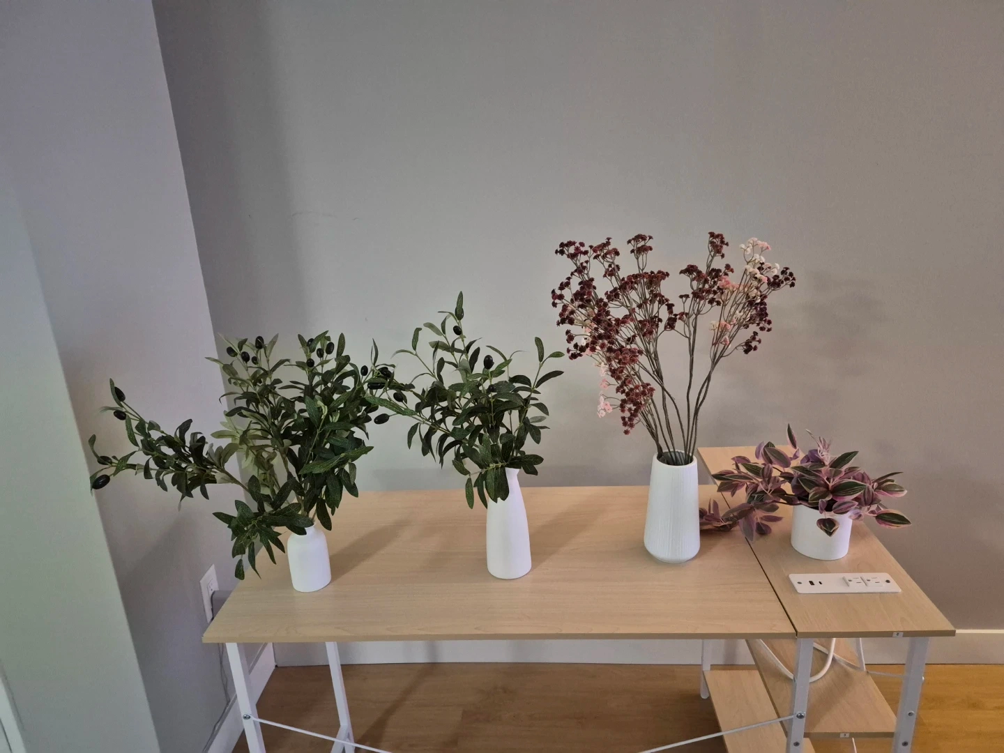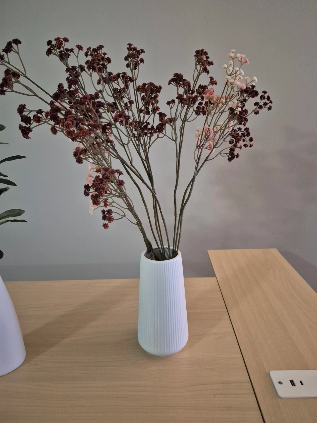 Selling a stylish white ceramic vase with a textured finish, filled with a lovely arrangement of artificial flowers.