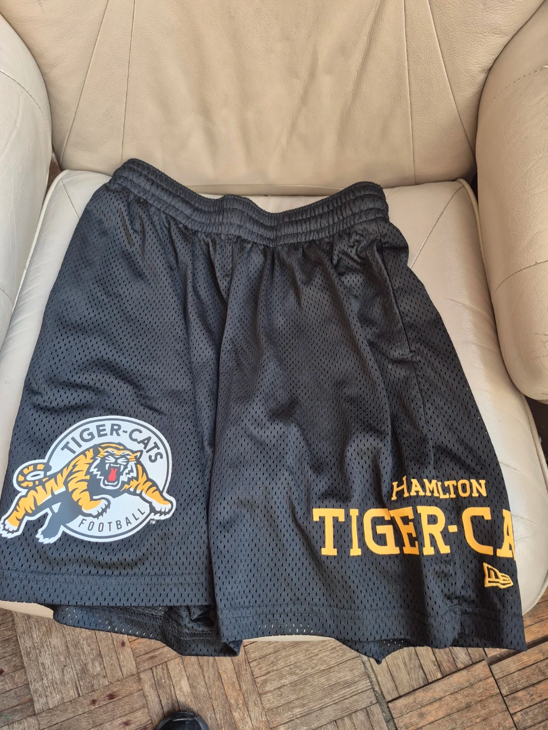 Selling New Era Hamilton Tiger-Cats football shorts in black. Size medium. Features the Tiger-Cats logo and "Hamilton Tiger-Cats" text. Great for any fan!