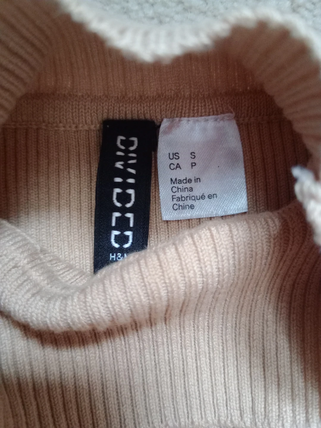 Selling a Divided by H&M beige turtle neck crop top in size small. This top is made with a blend of 40% viscose, 40% acrylic, and 20% polyamide. It features a ribbed texture throughout. A cozy addition to any wardrobe!