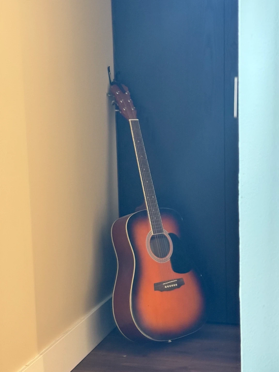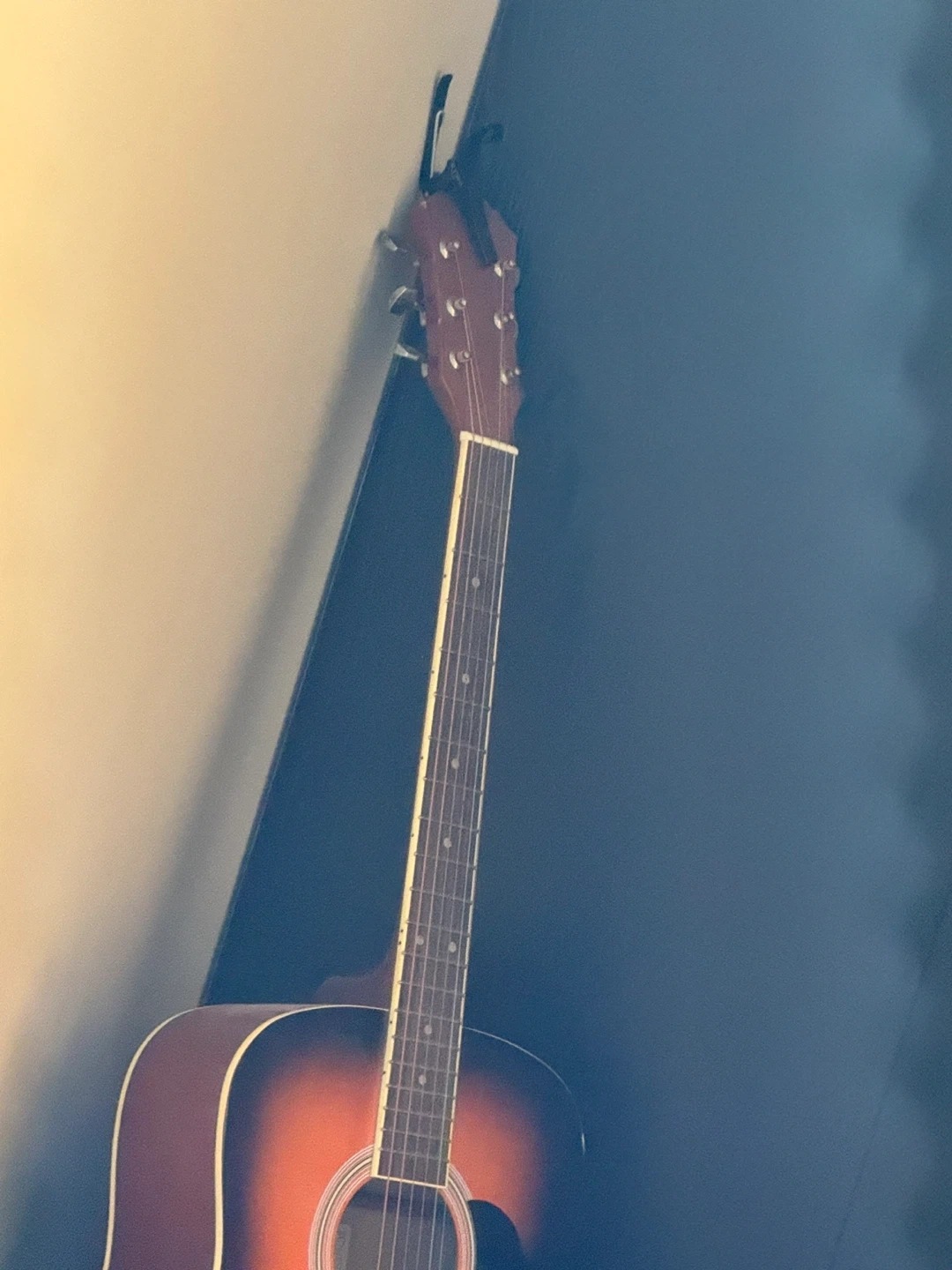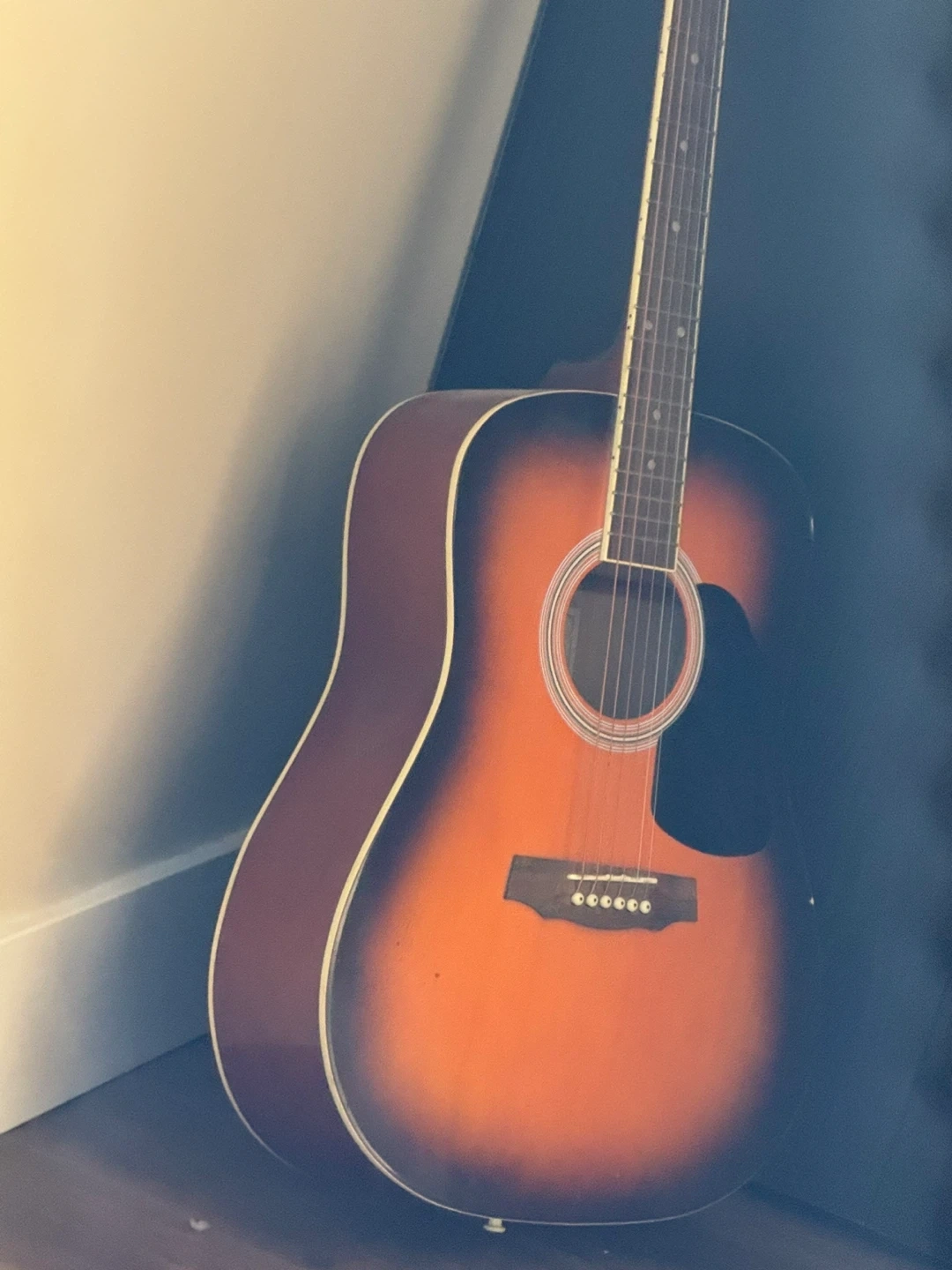 Selling a sunburst acoustic guitar. This instrument has a beautiful gradient finish and a standard six-string setup. It's perfect for beginners or casual players looking for a reliable acoustic. A great starter guitar!